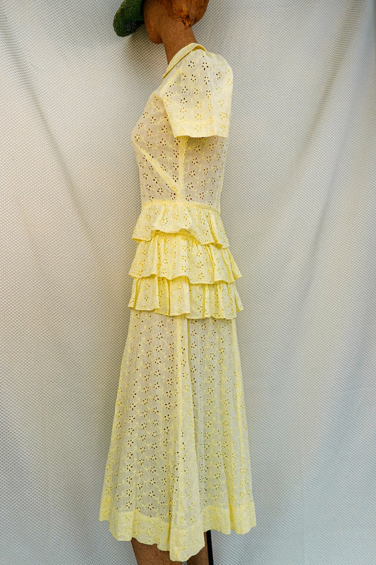 50's Lightweight Cotton Eyelet Dress - Pastel Yellow - Flounce Dress with Ruffled Hips - XS/S 26" Waist