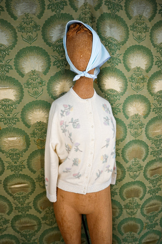 50's Hand Beaded Cardigan - Vintage Cream Color Cardigan - Miles Sweaters - Medium