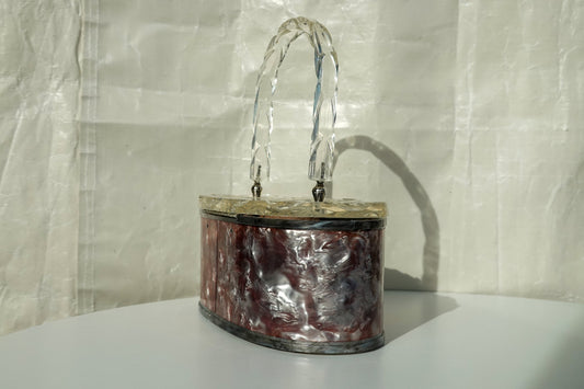50's Pearlized Lucite Purse - Oval Box Bag with Carved Details - Vintage Taffeta Acrylic Bag by Charles Kahn