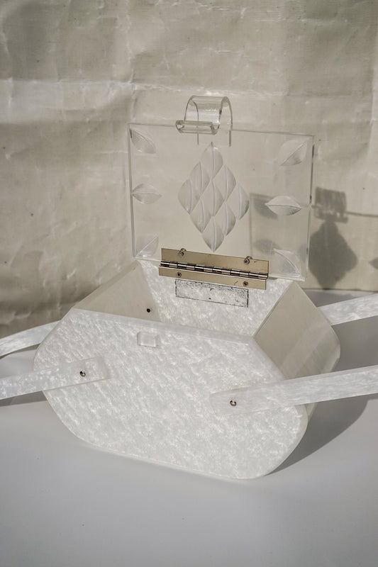 50's Pearly White Lucite Purse - Unique Shape Box Bag - Vintage Acrylic Evening Bag with Carved Top by Siran