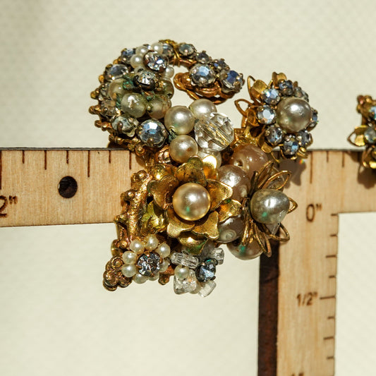 50's Eugene Bouquet Earrings - Filigree Ornate Gold Tone Statement Rhinestone & Pearl Earrings