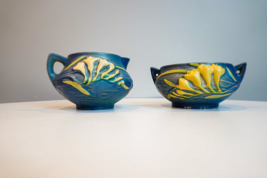 40's Roseville Freesia Blue Cream and Sugar Set - Vintage Art Pottery