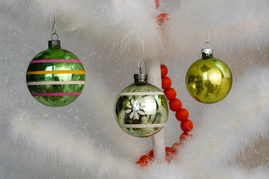 50's Christmas Ornaments - Set of 12 Assorted Green Vintage Shiny Brite Xmas Ornaments - Hand Painted Glass, Stripe, Sphere - Mercury Glass