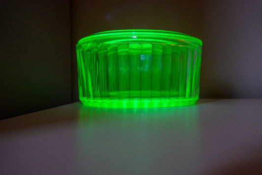 50's Anchor Hocking Ribbed Box with Lid - UV Reactive Vaseline Glass - Vintage Uranium Glass Lidded Box
