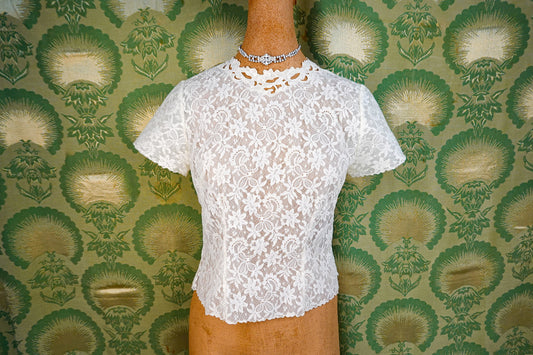 40's Sheer Lace Blouse - Vintage Sheer Lace Applique Back Button Blouse - by Saab, Blouse du Jour - Size Small