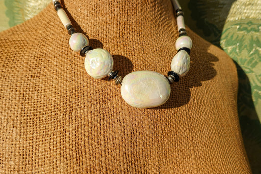 80's Iridescent Ceramic Stone Necklace - Vintage White Chunky Bead Necklace - Made in Japan