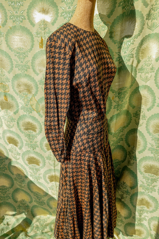 80's Houndstooth Maxi Dress - Vintage Circle Skirt Dress with Pockets, Dolman Sleeves, Shoulder Pads - Medium/Large - By Kasper for A.S.L.