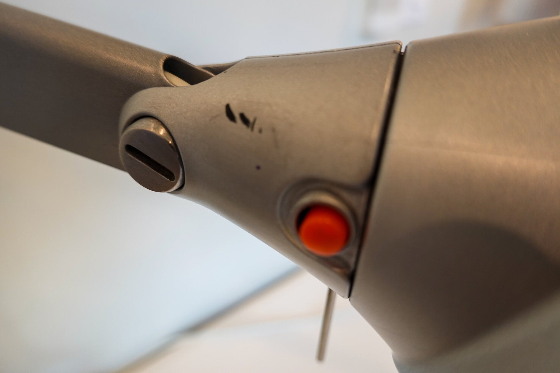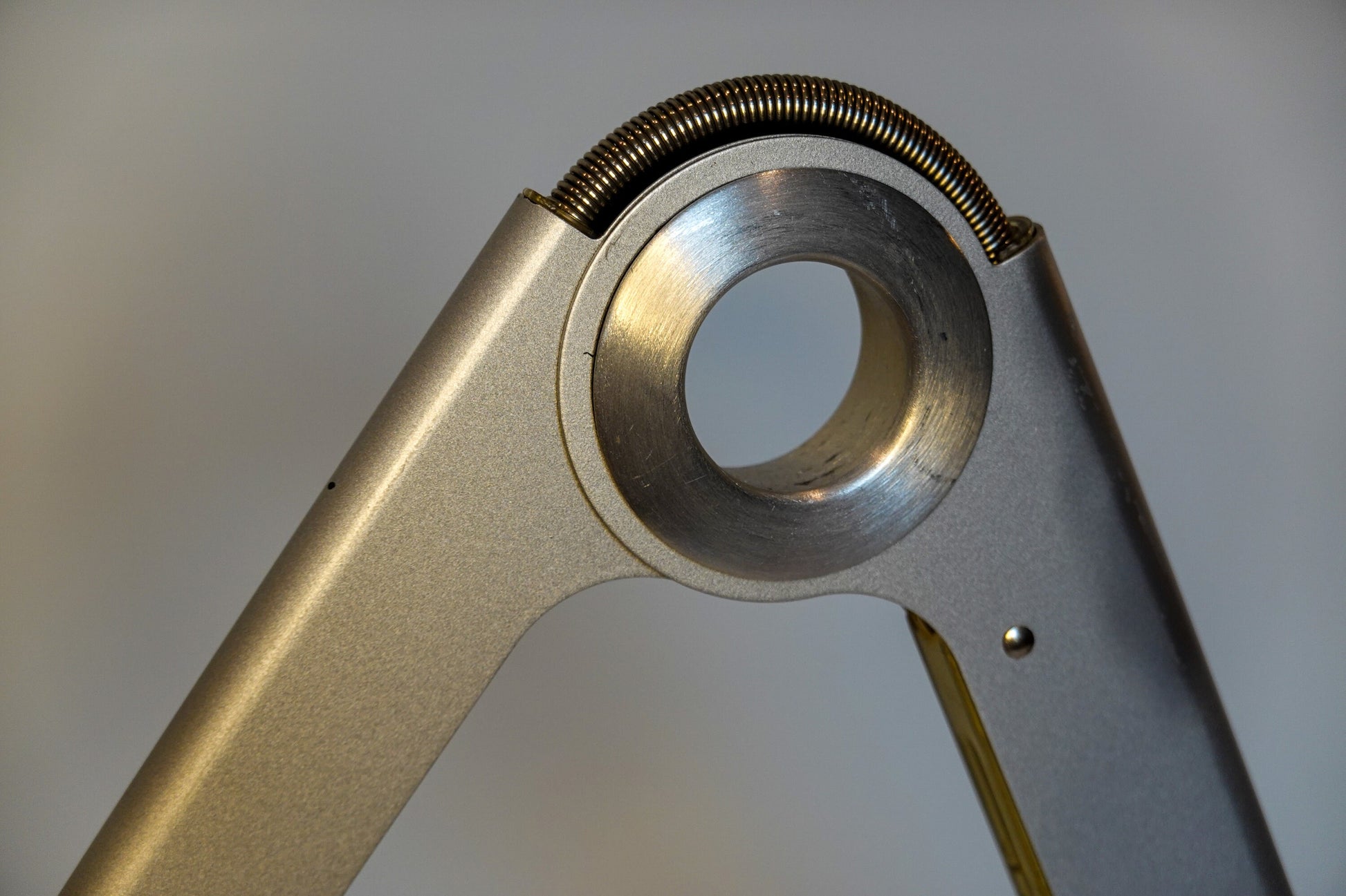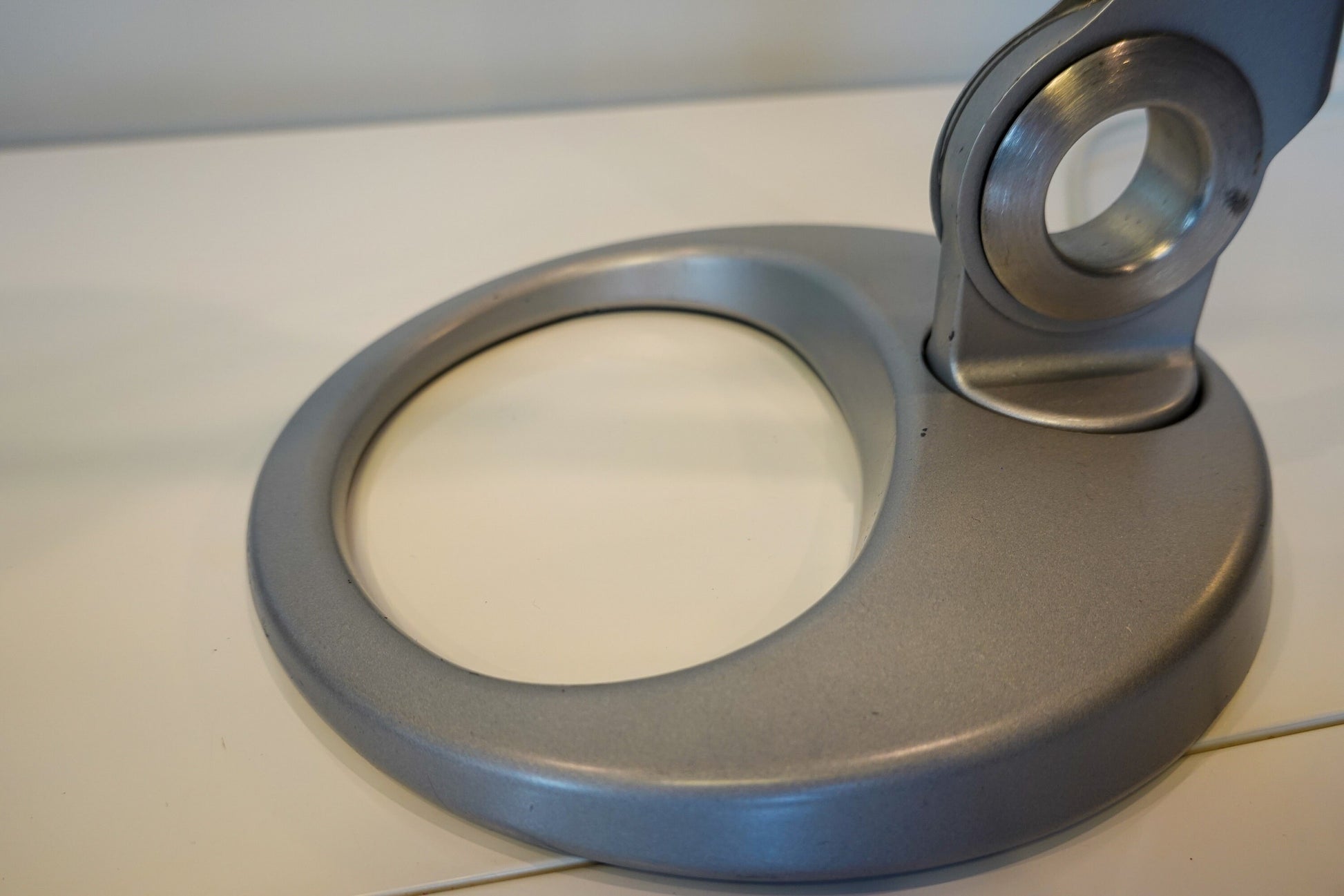 Versatile beyond belief, this task lamp is made of aluminum with a weighted base, and articulates at 3 joints, PLUS the shade can be adjusted 360 degrees and can even shoot light up. The bottom joint also rotates about 180 degrees. These are being made still, and are a future classic piece. I used this myself after acquiring it and almost don't want to sell it! The details are incredible, with springs at every joint, a completely enclosed casing making it super sleek, a bright red button for on/off, and a silver reflective interior on the shade. Supremely post-modern.