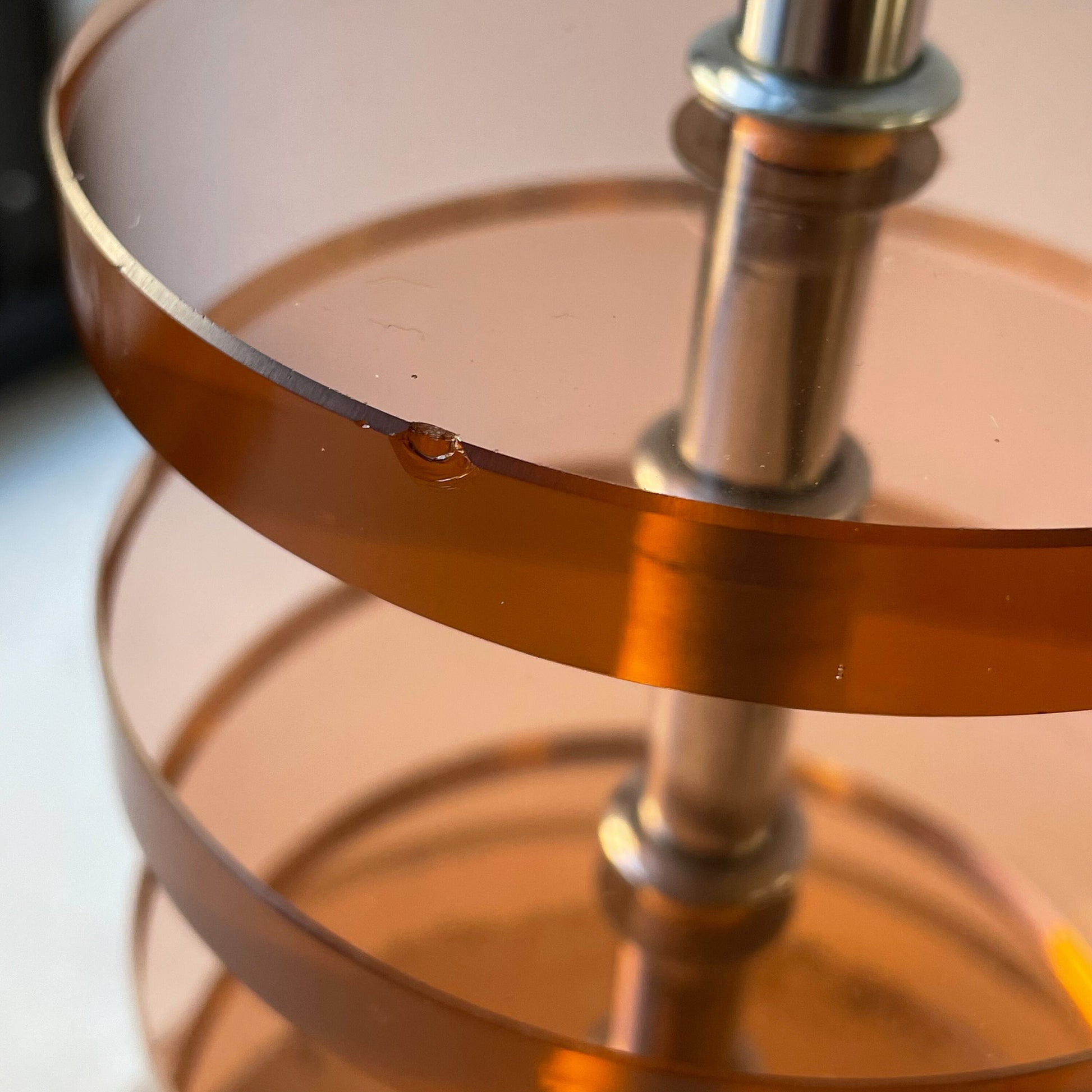 One of a kind table lamp. Featuring thick 4 glass circles stacked a few inches apart on the lamp stem. These show up different color in different light, and emit a nice warm hue (kind of like a salt lamp) when the light is on. They generally have a pink-ish hue in the daylight, almost a warm amber. This piece is incredible and looks fantastic in daylight, and different at night. Call me the shapeshifter!