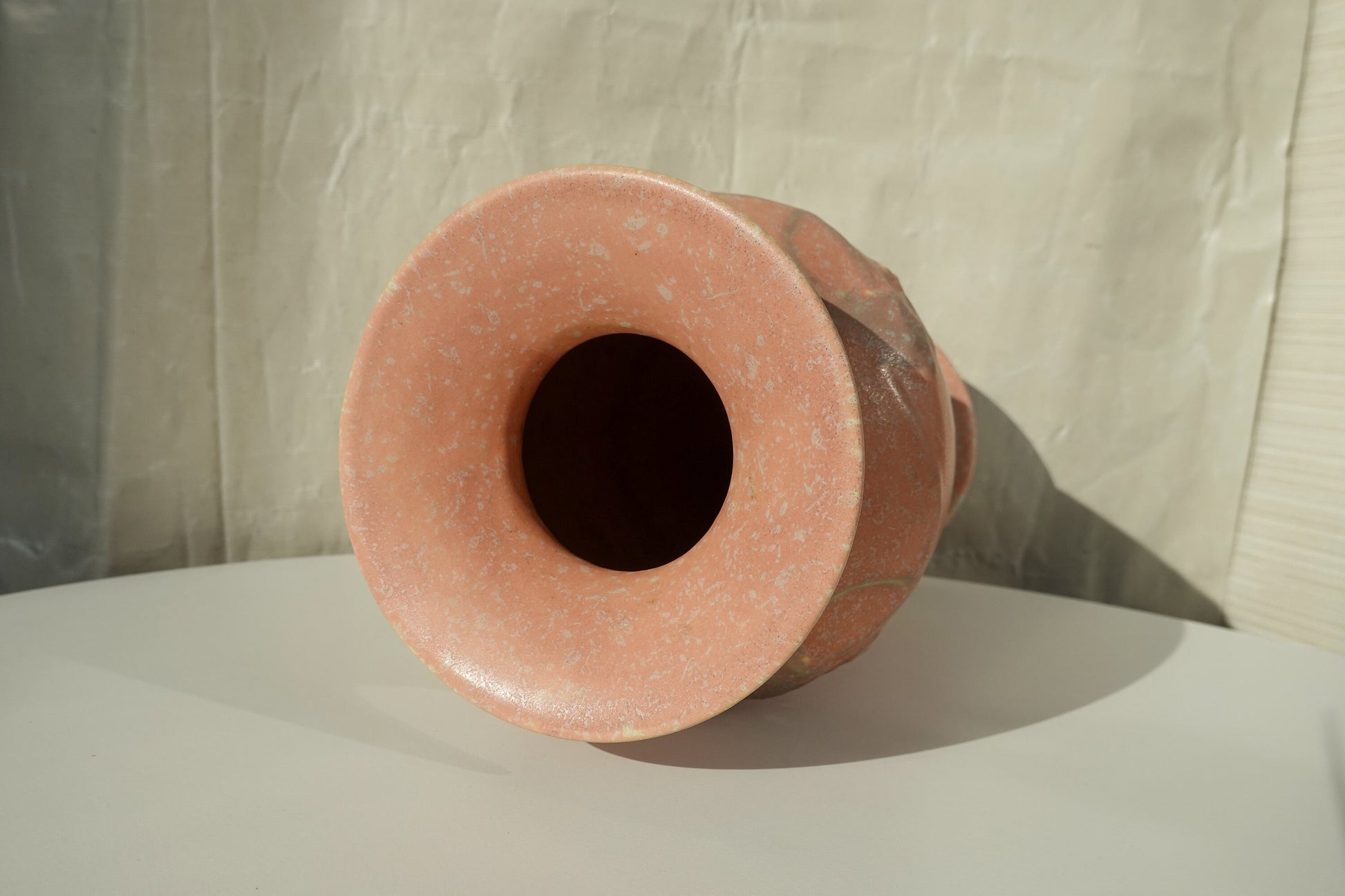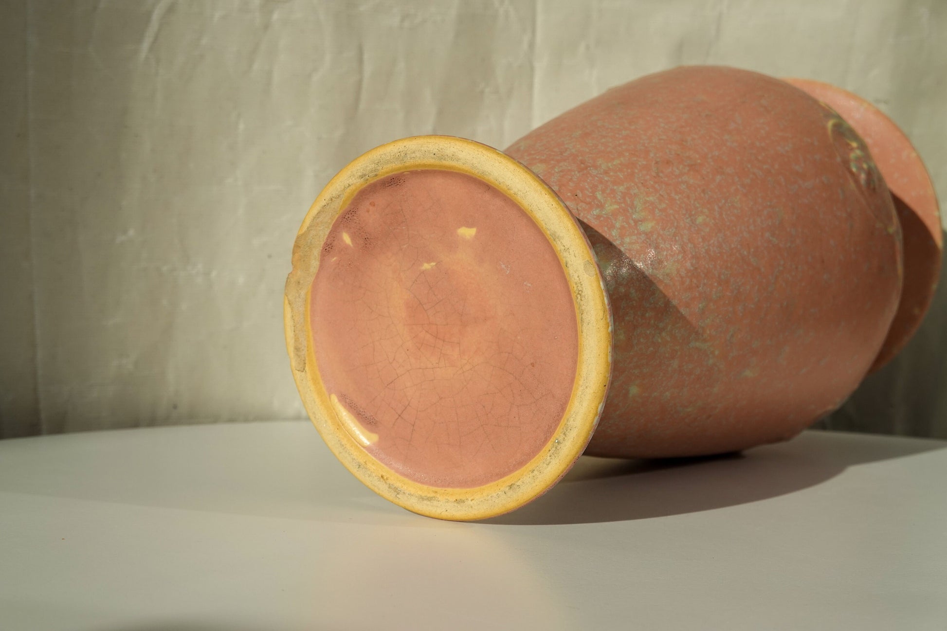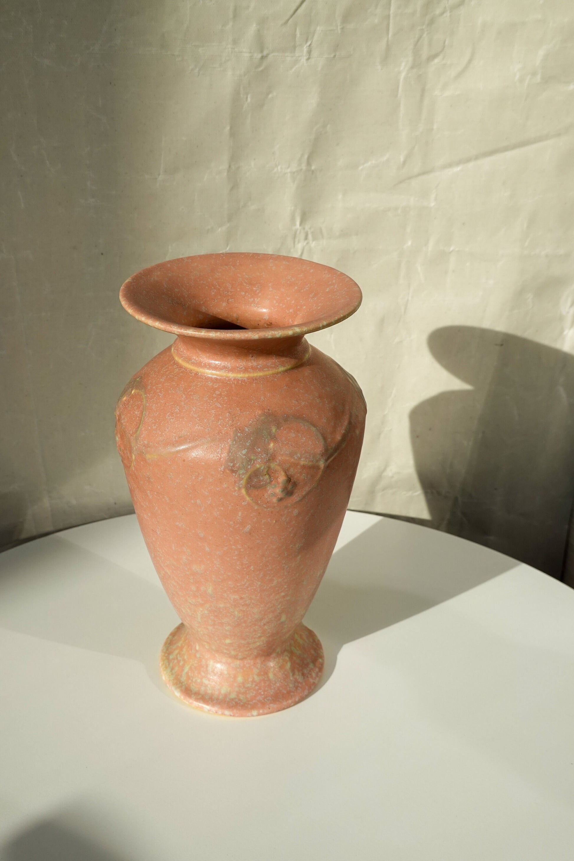 This pastel pink vase has a green leaf and vine motif winding it, and is a "middle period" Art Deco pattern that Roseville started producing in 1928. This piece has what I consider a semi-matte glaze. It's a classic, symmetrical shape. Just in time for spring.