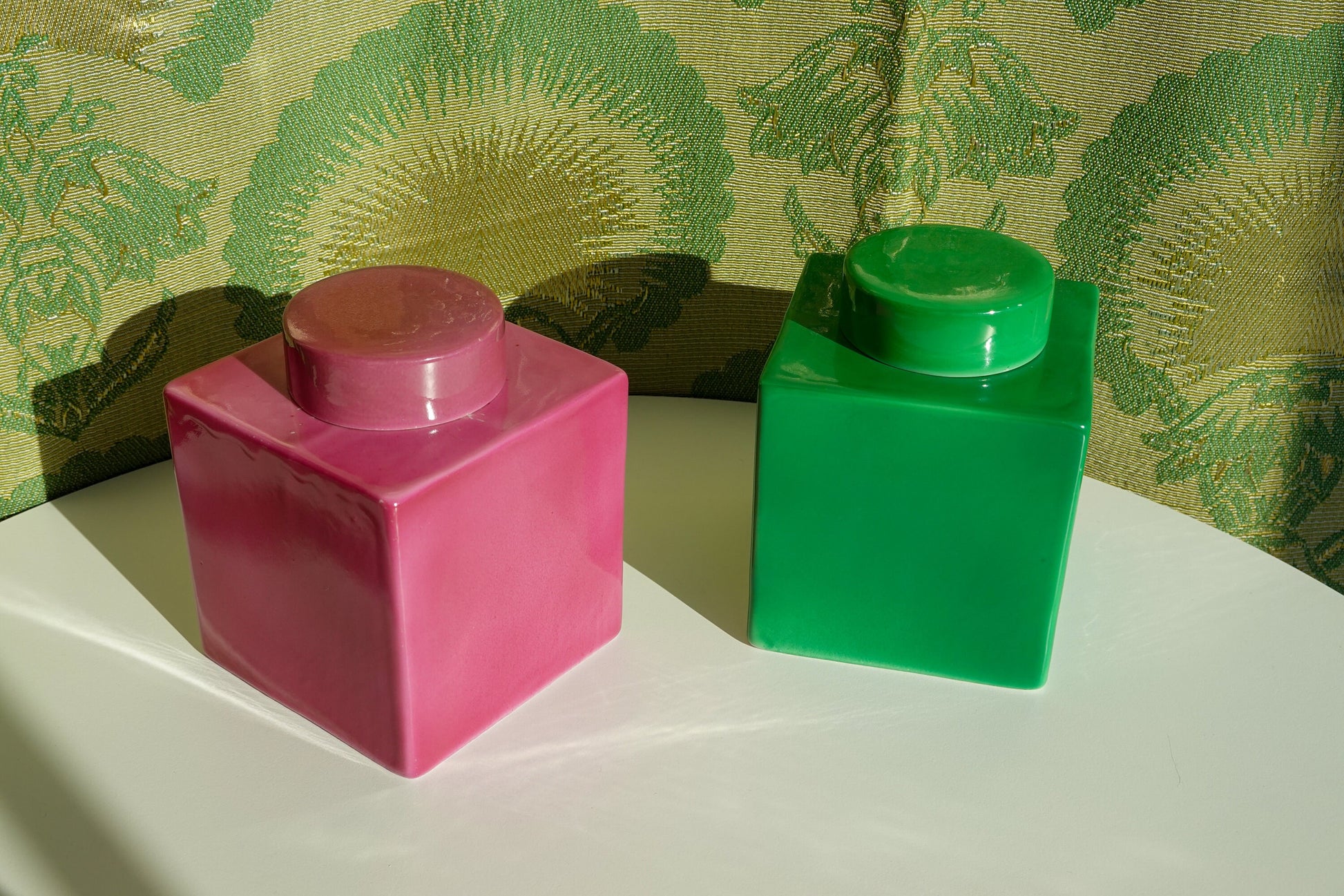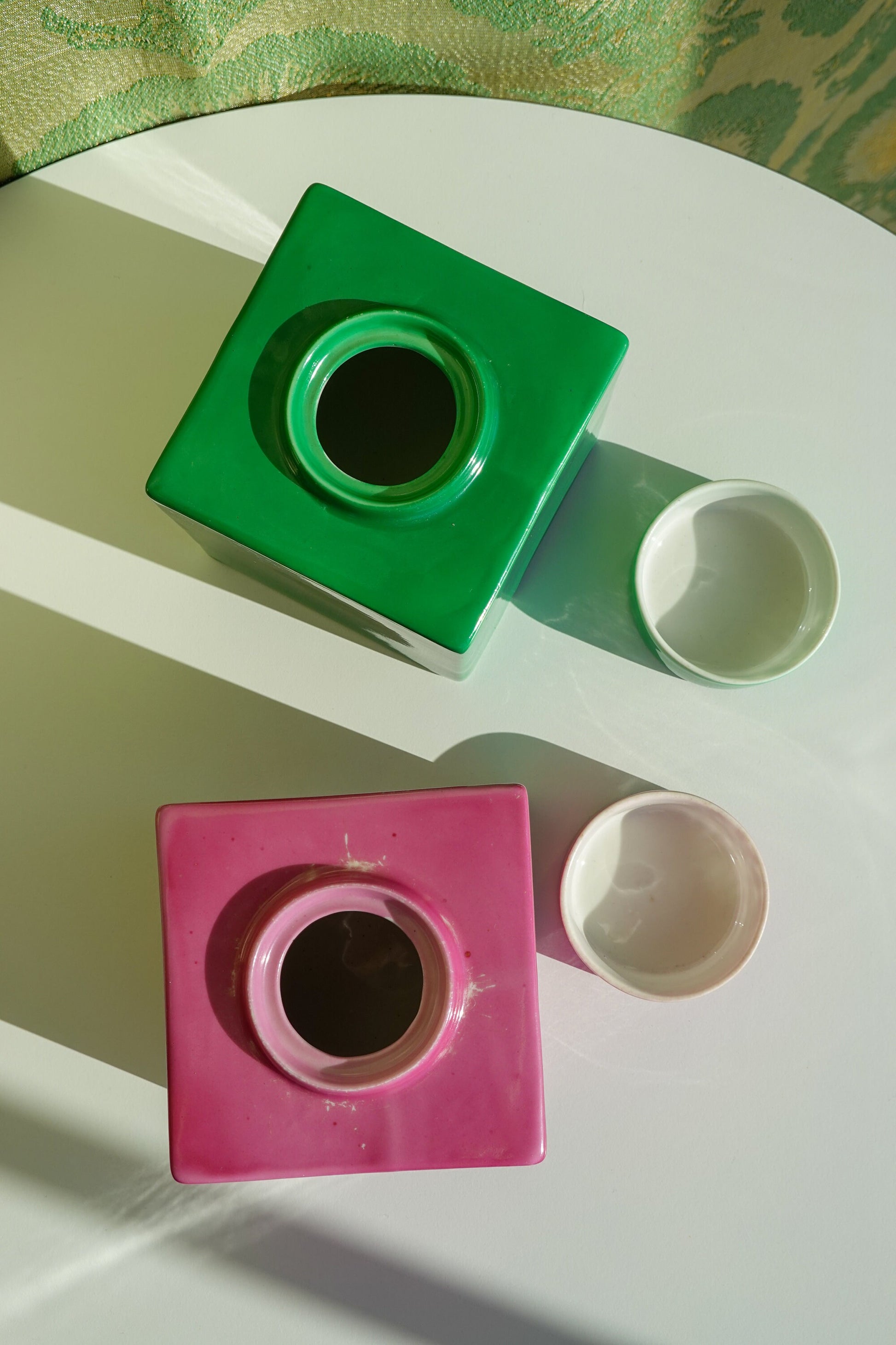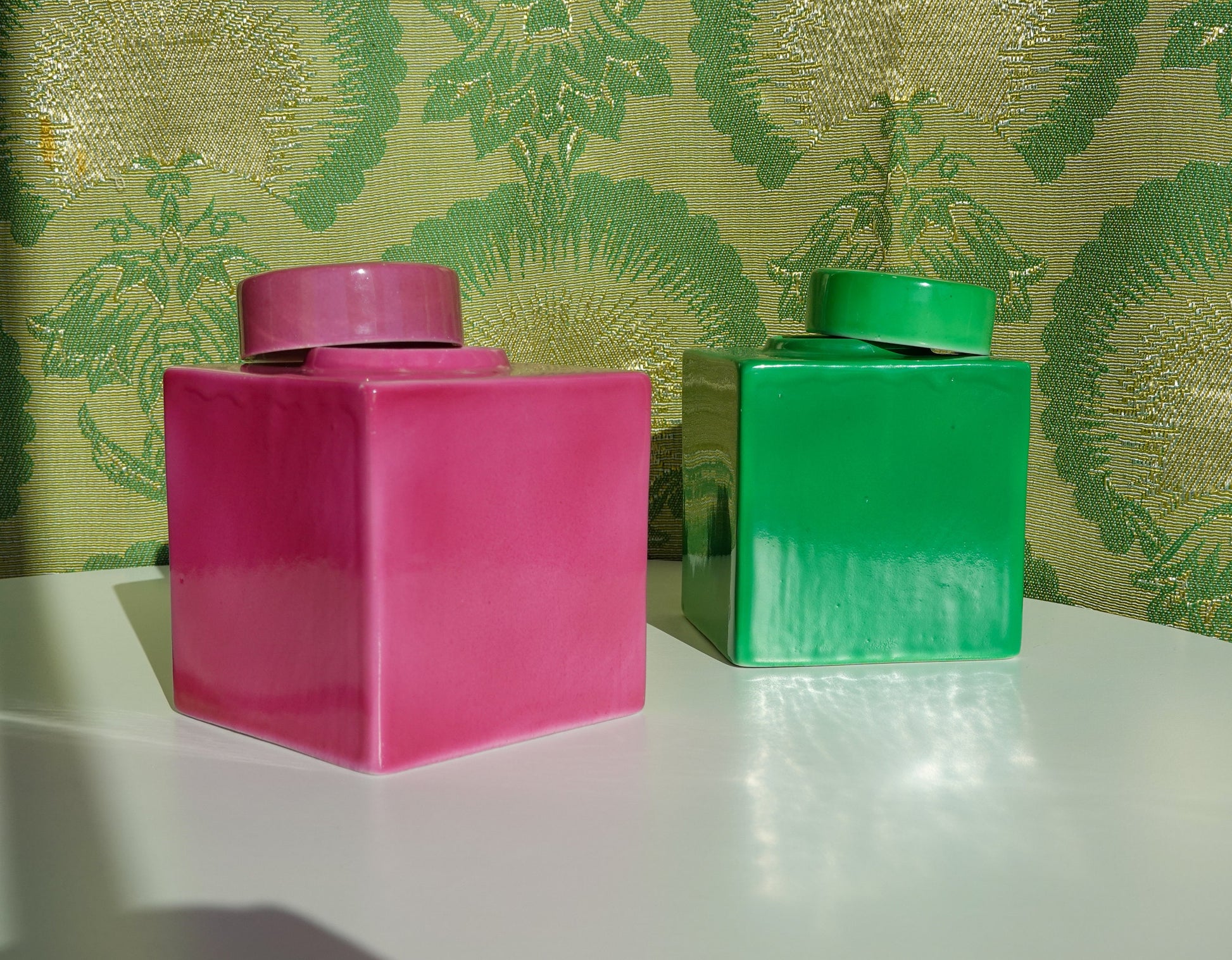 Made in 1929, quintessential Art Deco decor. Semi-matte glaze, made of China. Two colors available. One is a spectacular bright green - like grass green. The other is a violet color. The lid is a perfect circle, and the vessel itself is a perfect square. Wonderful juxtaposition there, creates a stunning piece. Classic, bold and interesting, don't hesitate to add one or both of these to your collection.