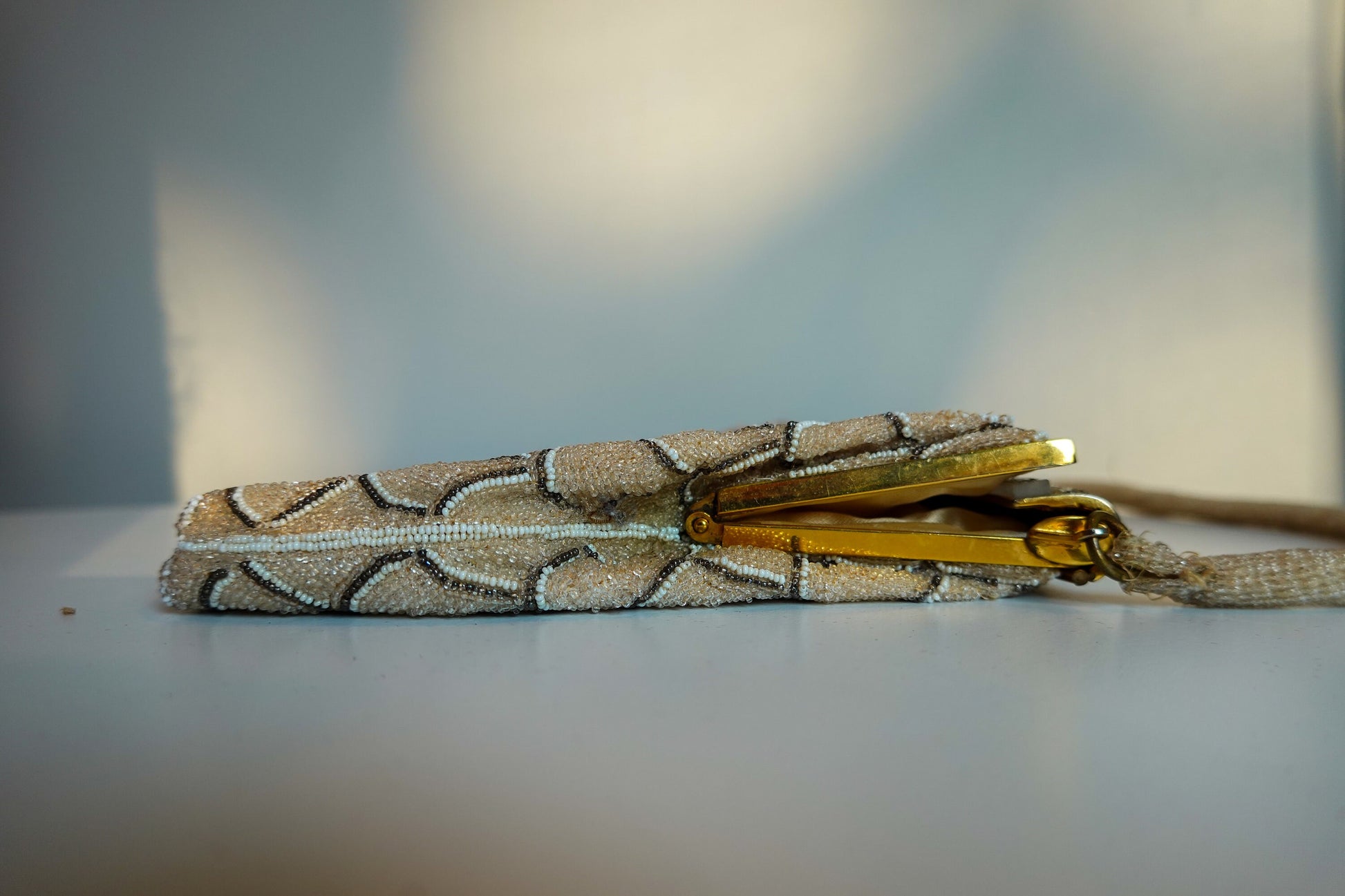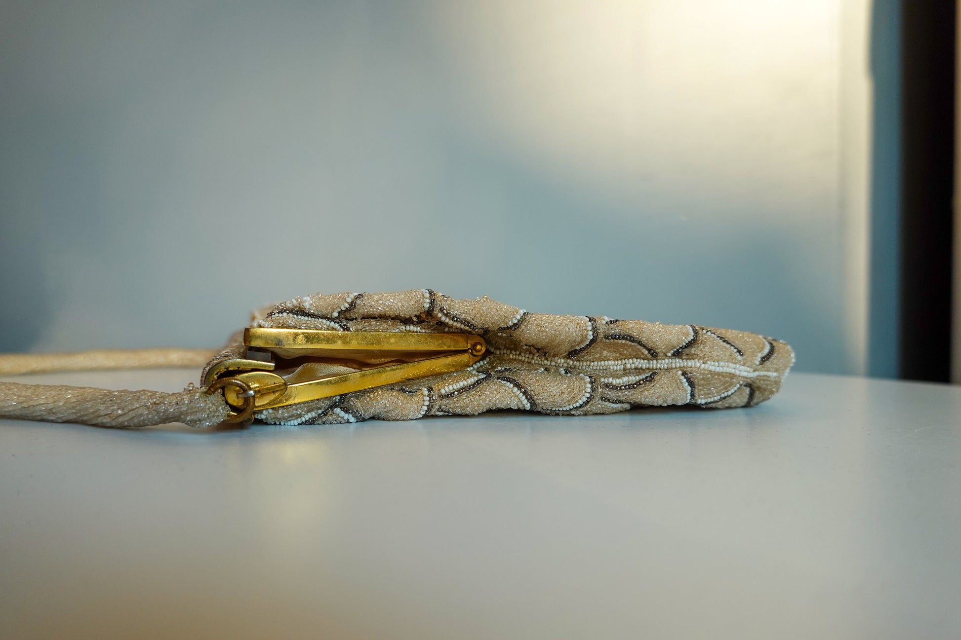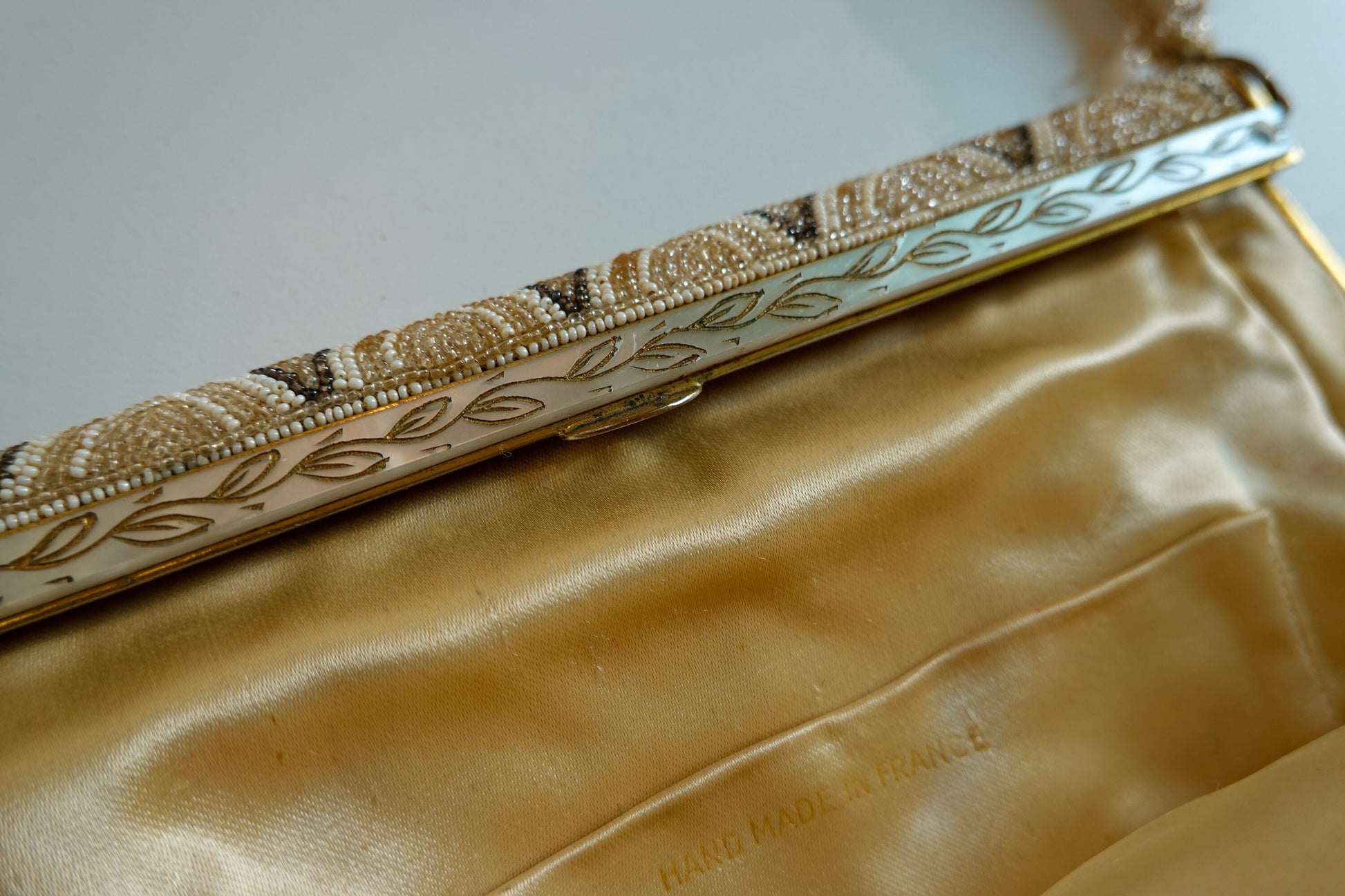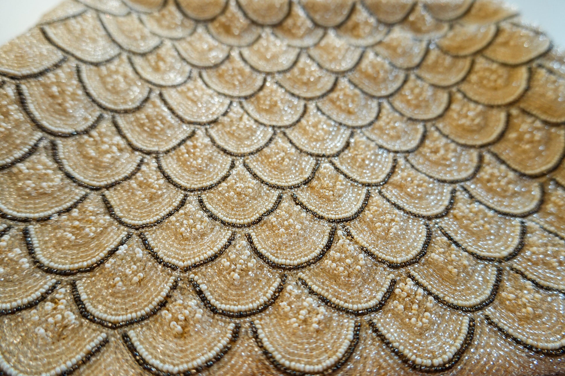This piece is a pretty, elegant and feminine evening bag made of silk and that is entirely hand beaded. The beads are tiny little glass pieces in three different colors: champagne, white and a reflective bronze. The design is a delicate scallop, and the handle is also entirely hand beaded - wowzers that's rare! The weight is reflective of the serious hand beading involved.