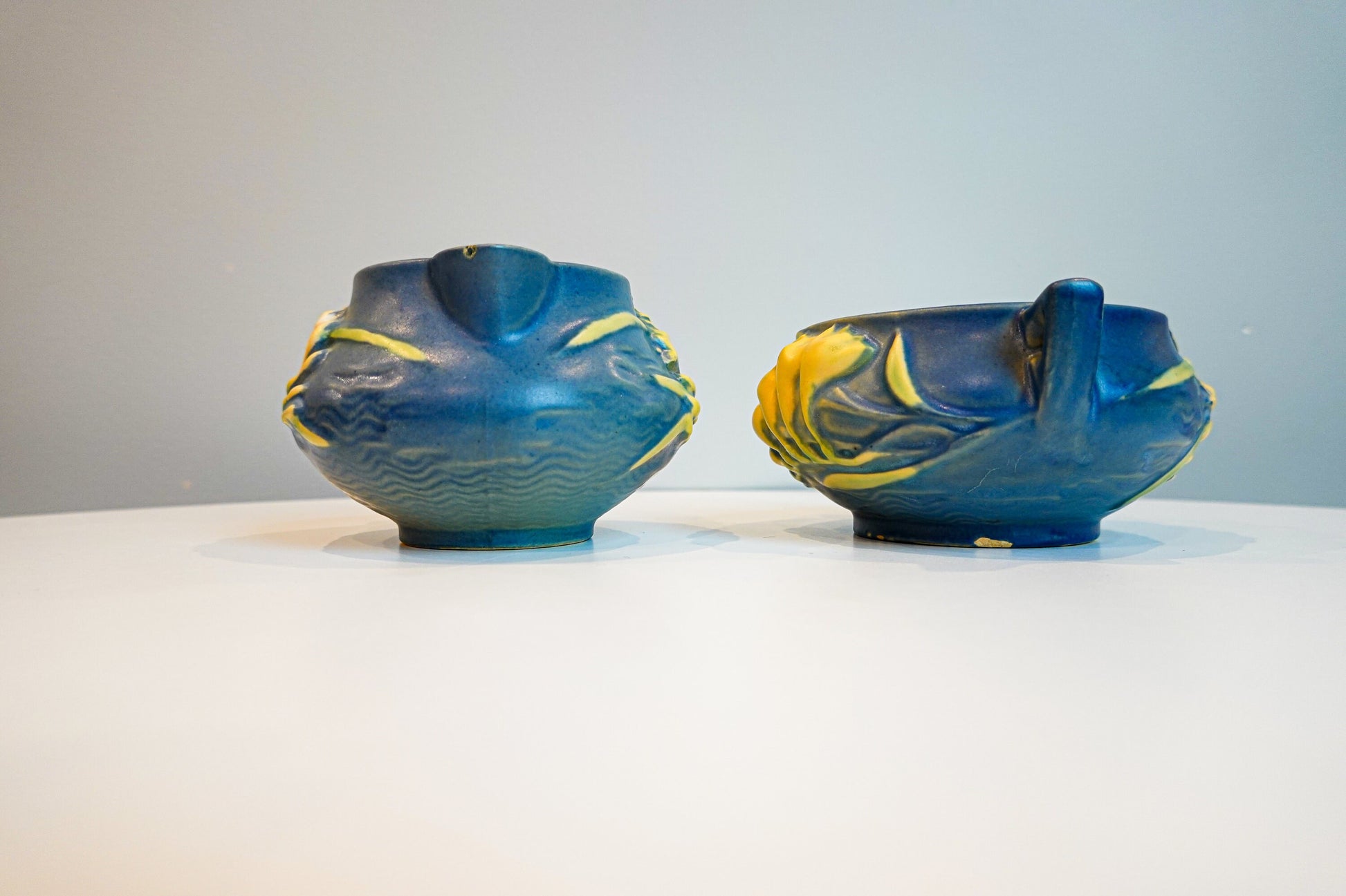 Gorgeous, brilliant blue background on this set of freesia pattern Roseville pottery from the 1940's. The flowers are in incredible relief, see the detailed photos. Each has seven ivory freesia's on a green stem flowing beautifully along the sides. The handles are stunning, geometric designs. Most people attribute this to 1945, but I cannot be more specific than the decade.