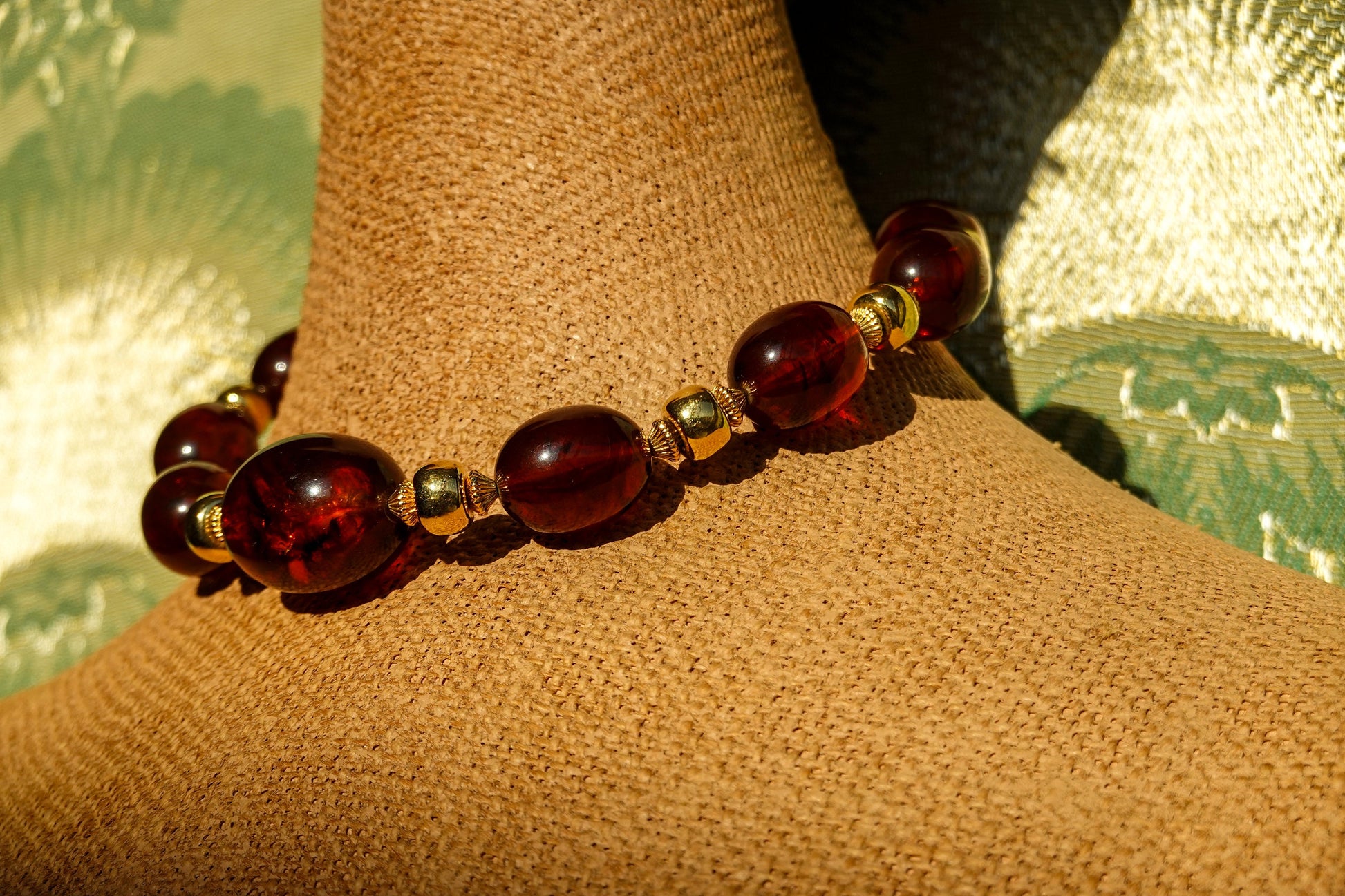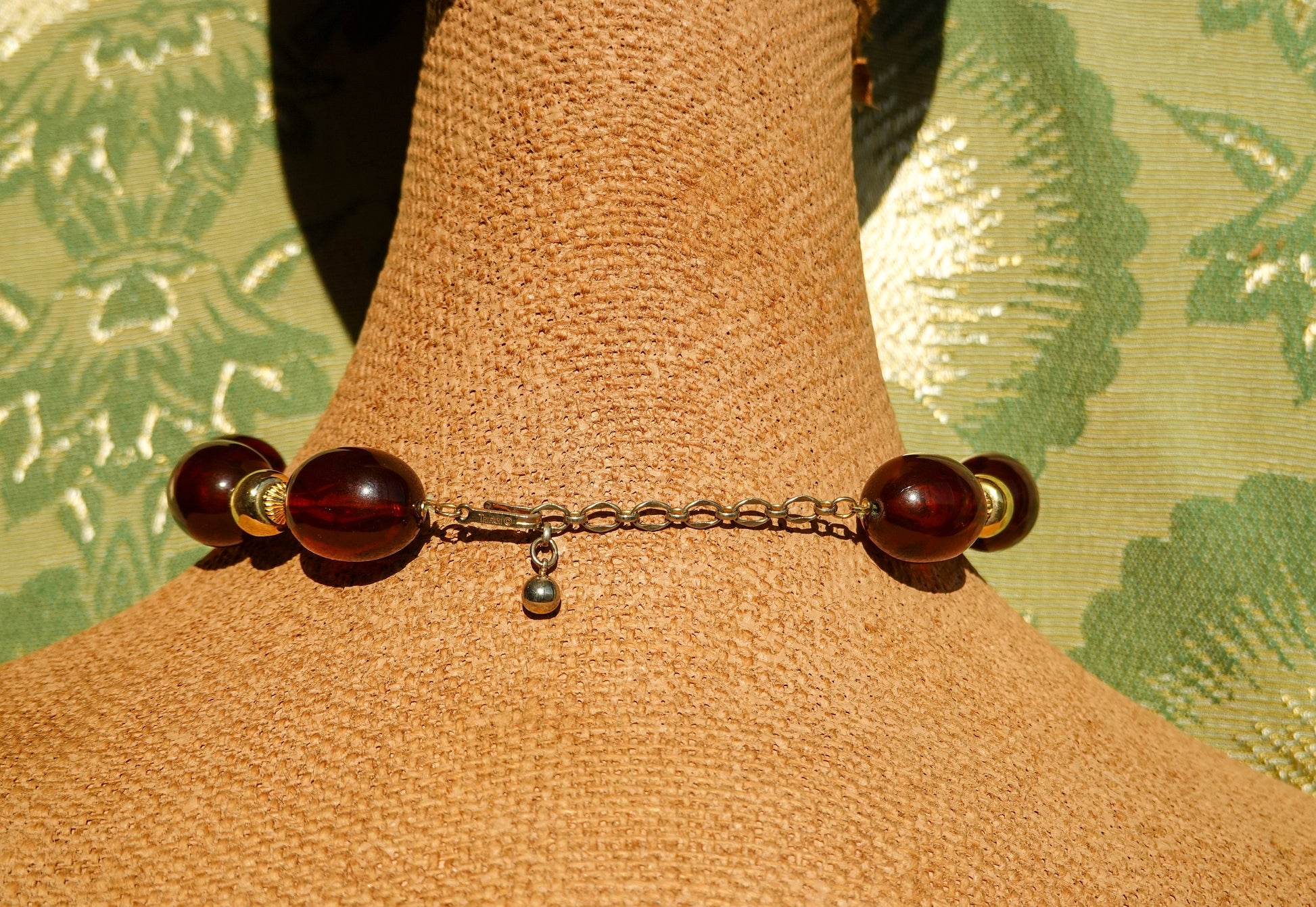 Made by Trifari, this lovely amber and brown marbleized lucite/acrylic bead necklace alternates between 9 "tortoiseshell" color beads, with the middle being slightly larger than the others, and three gold tone spacers. It is adjustable!