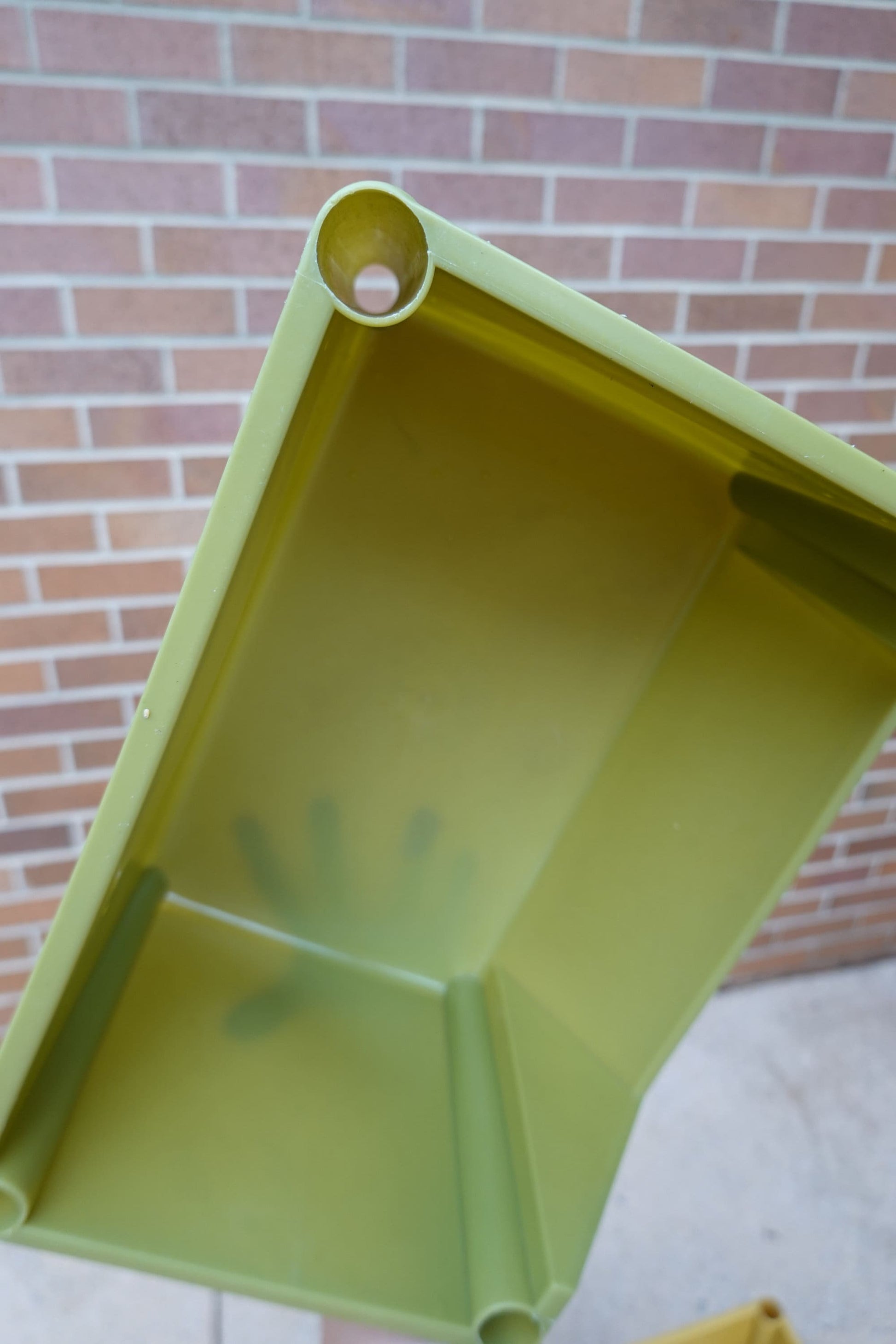 These modular, stackable original mid century organizing bins are a useful size for getting organized and storing all kinds of things. This set of five includes two colors: two avocado green and three harvest yellow. I think you could use these outdoors during the warmer months, indoor all year round.