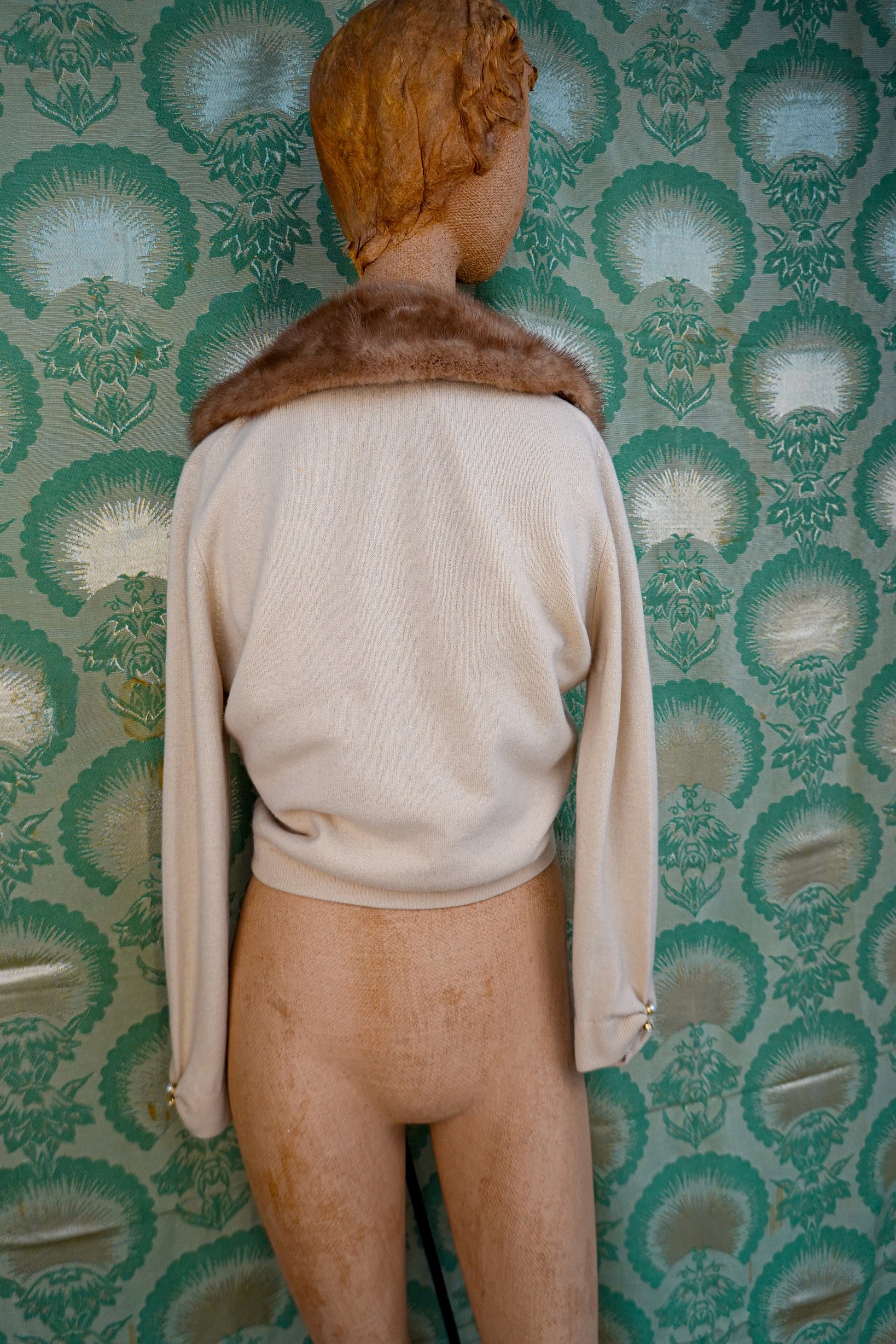 60's Cashmere V-Neck Cardigan with Detachable Mink Fur Collar - Vintage Glamorous, Luxurious Cardigan Sweater - XS / Small