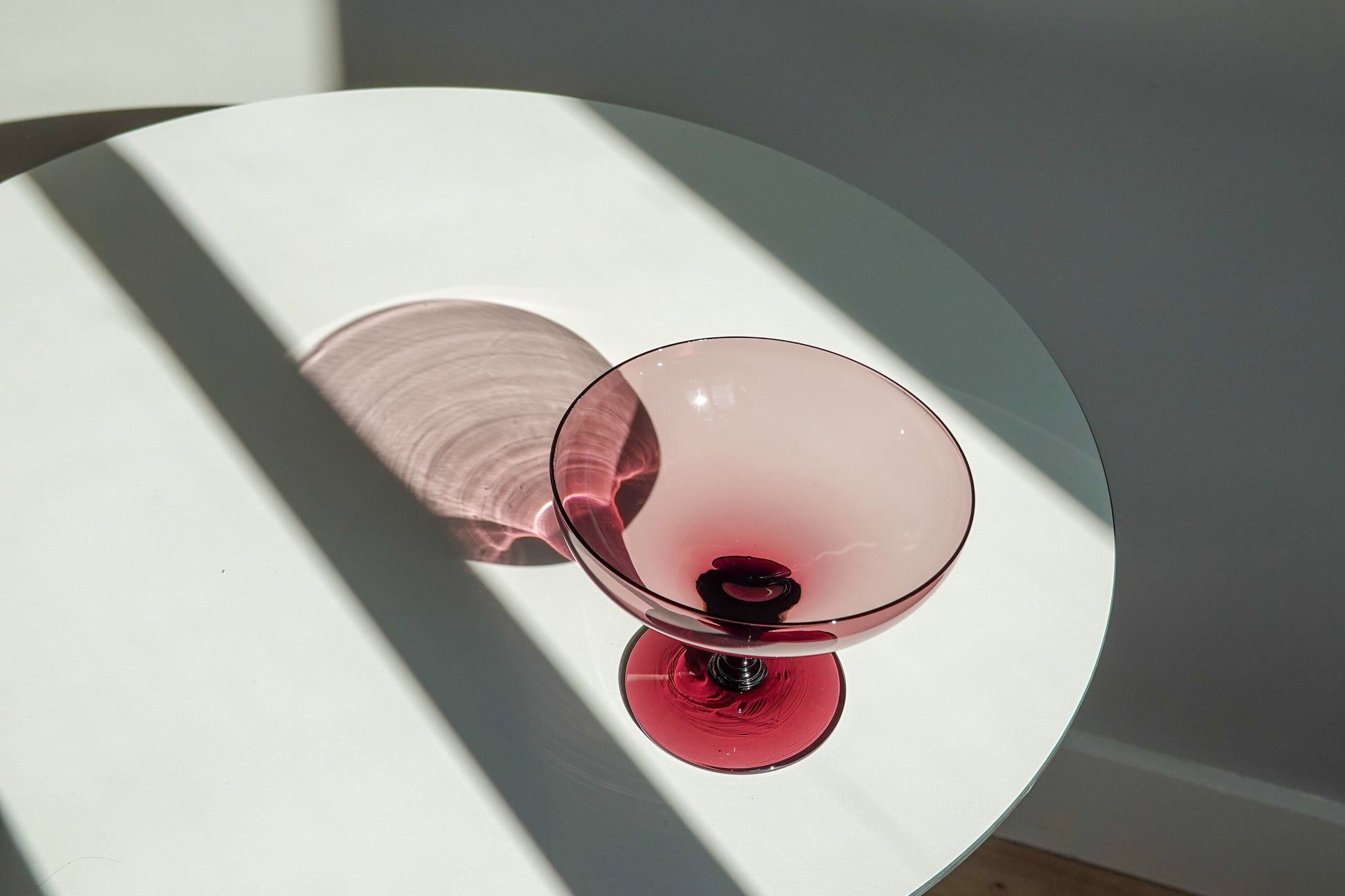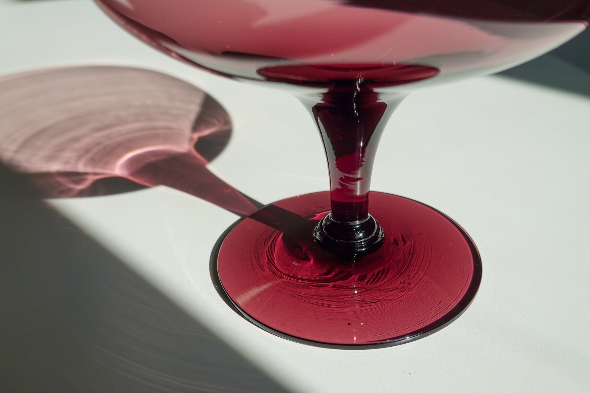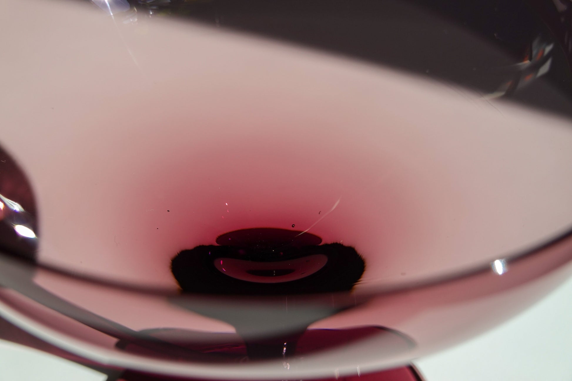 Lovely elegant, thin glass compote with a slim shaft/stem. It's an intriguing purple, with more red than blue (hence plum!). See photos next to my other listings for color comparison. The dark purple/red shows up brilliantly in the light, and you can see how well this was made as the density increases towards the shaft. It would be a great accent among other colorful pieces, or a perfect little useful bowl in the kitchen, boudoir, or more creative homes! Great gift for vintage or glass lovers.