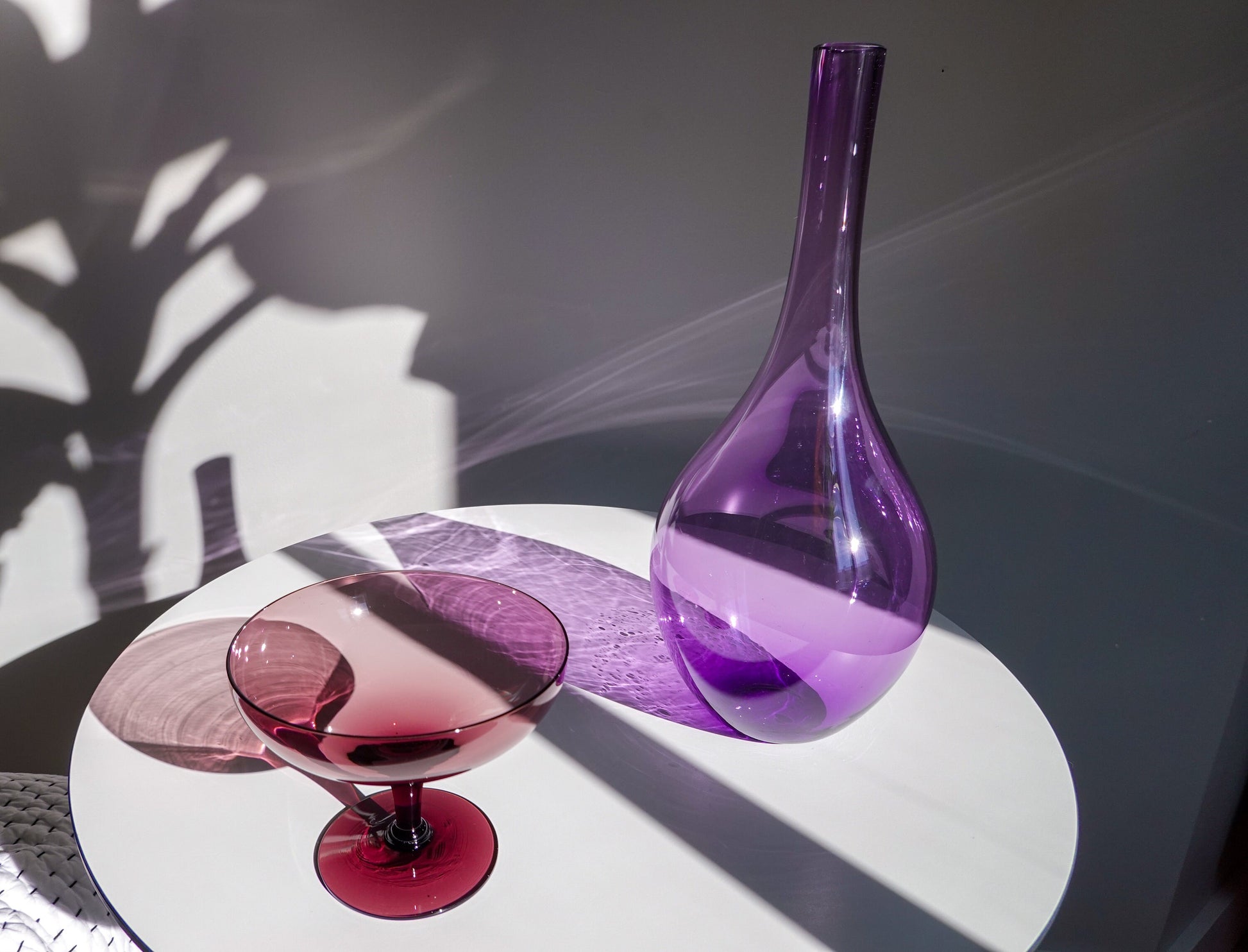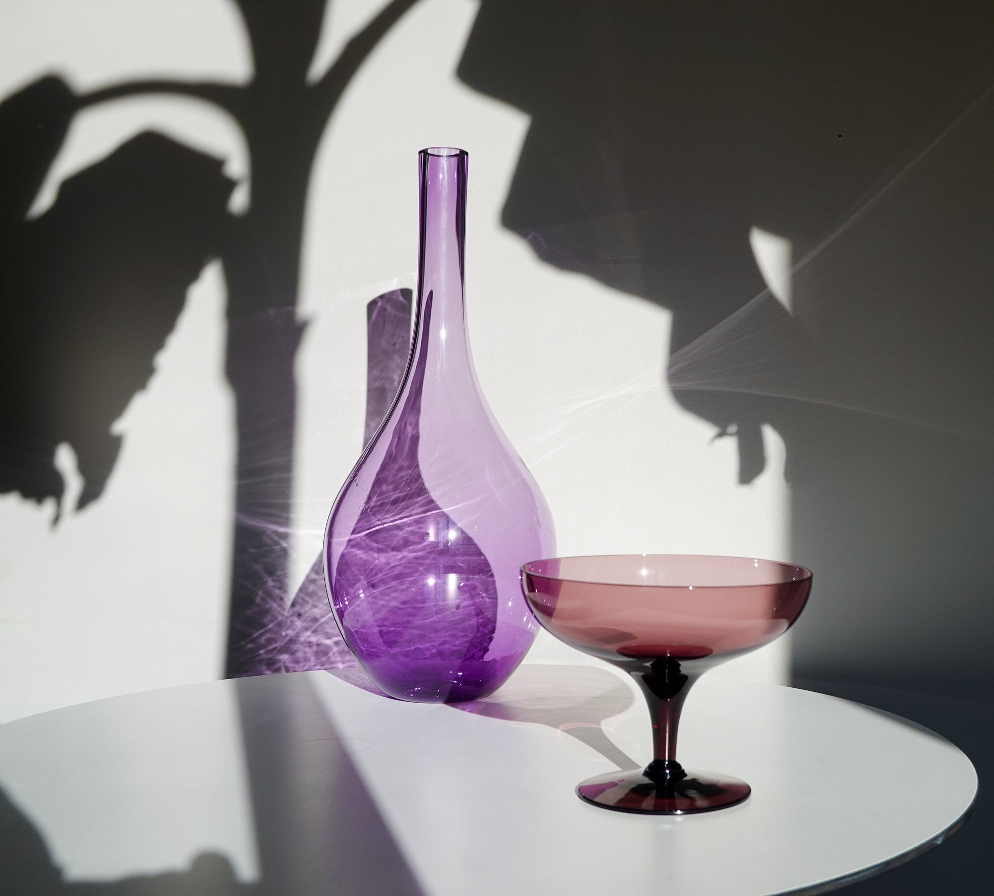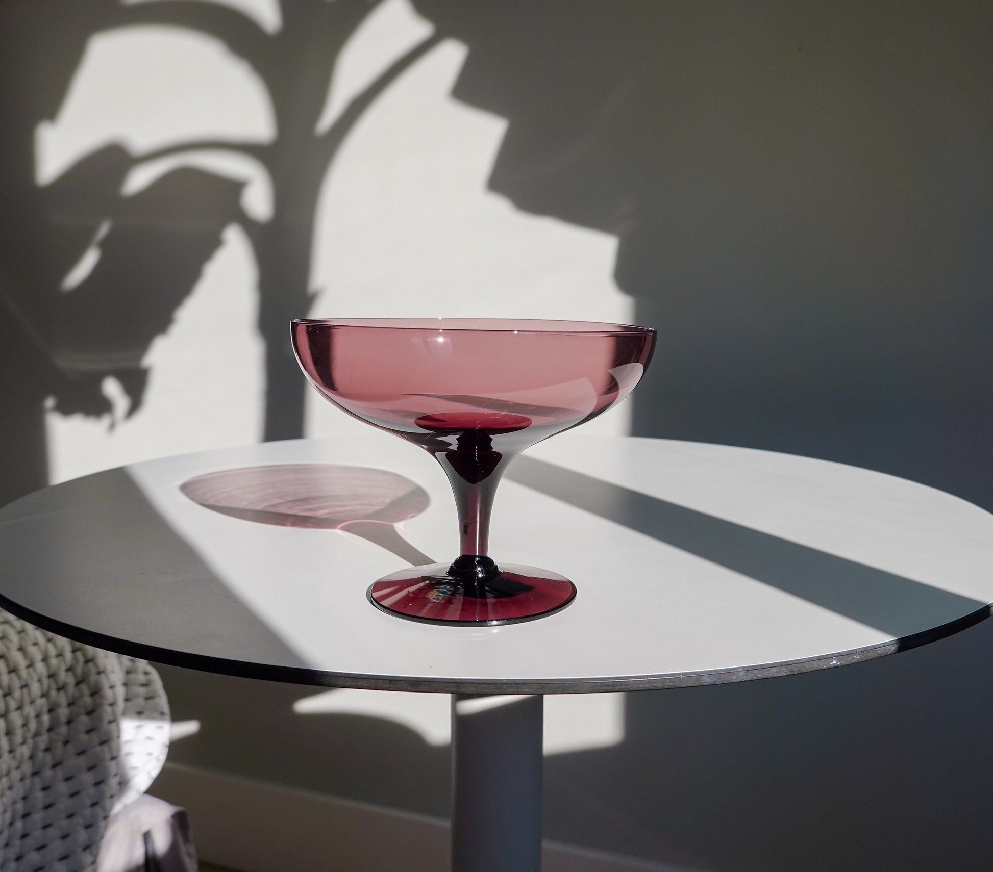 Lovely elegant, thin glass compote with a slim shaft/stem. It's an intriguing purple, with more red than blue (hence plum!). See photos next to my other listings for color comparison. The dark purple/red shows up brilliantly in the light, and you can see how well this was made as the density increases towards the shaft. It would be a great accent among other colorful pieces, or a perfect little useful bowl in the kitchen, boudoir, or more creative homes! Great gift for vintage or glass lovers.