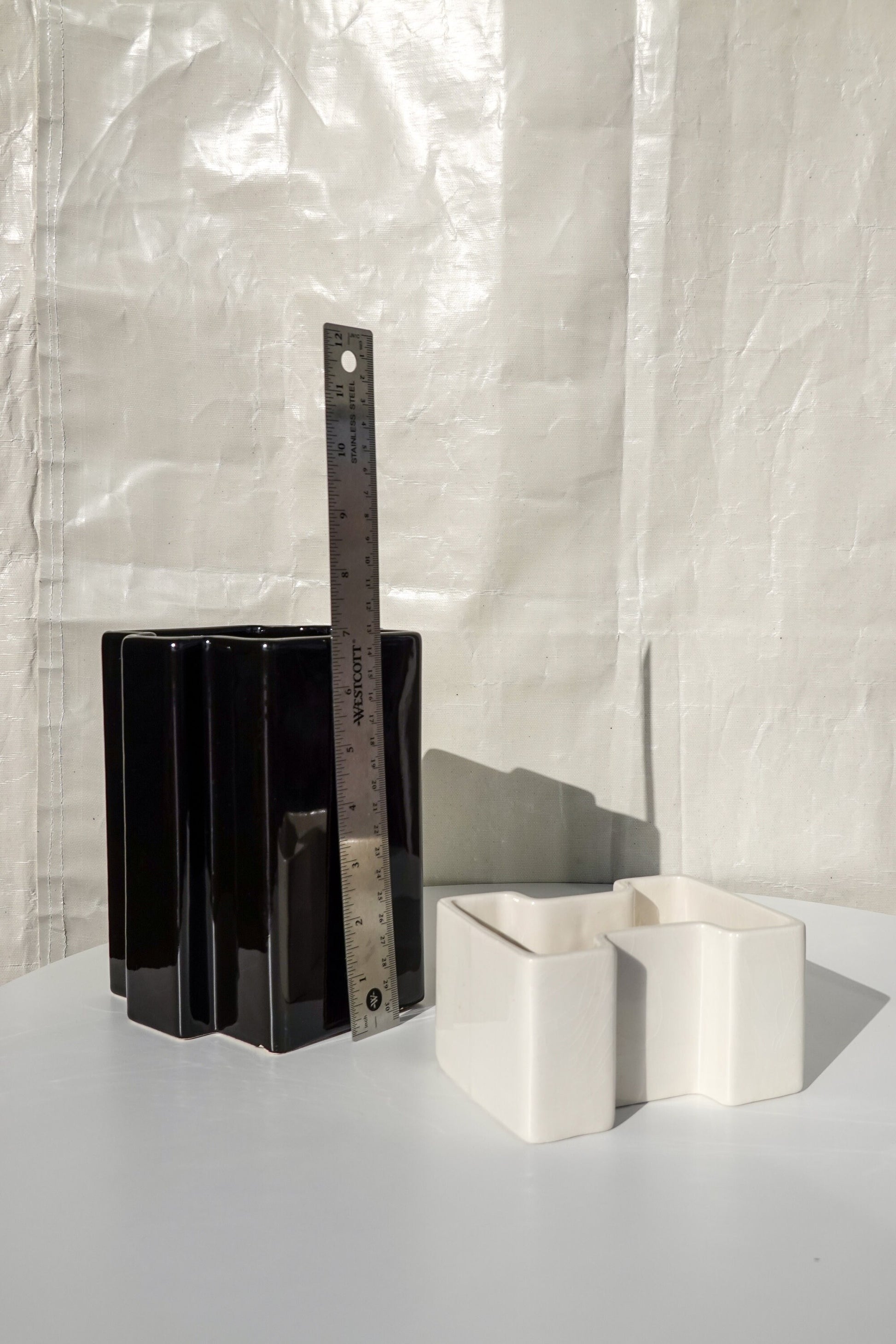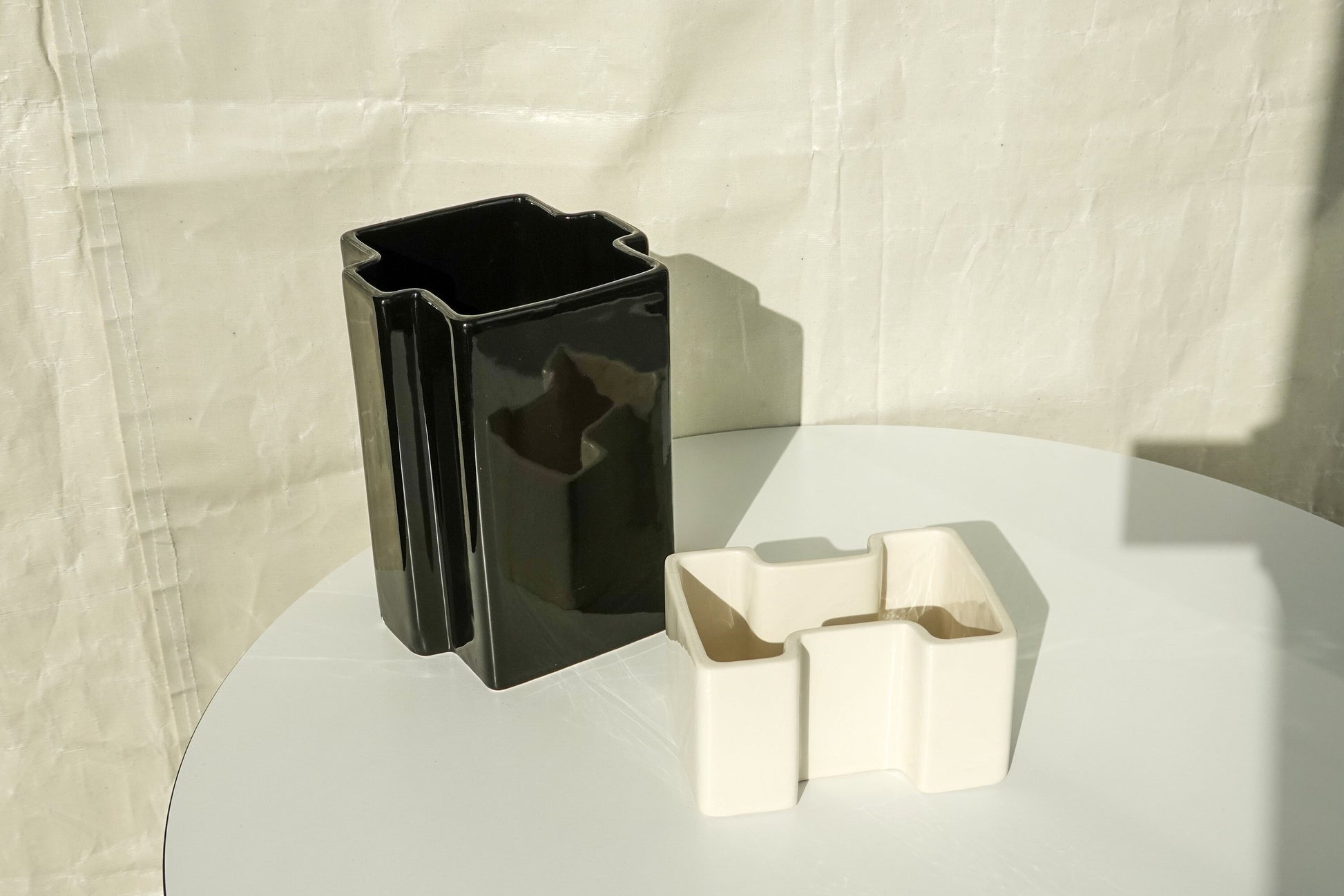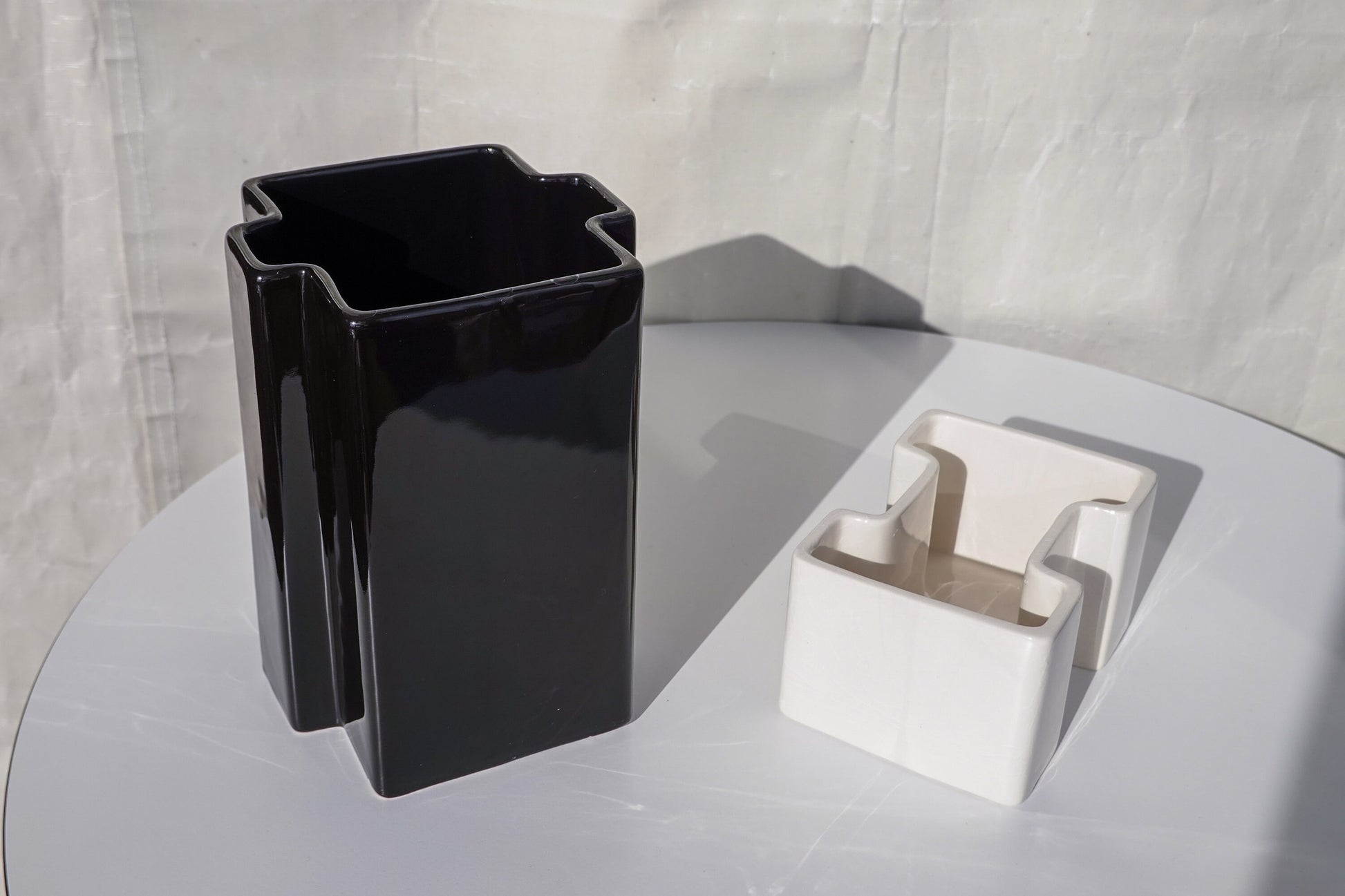 This black and white pair of geometric vessels is quintessential 1950's - 1960's Italian design. In the style of Angelo Mangiarotti, Gabbianelli, Angelo Spagnolo for Sicart and the like, this striking set is timeless. Featuring a high-gloss glaze on both, the tall black and the short white have different, complementary shapes, fitting together almost like puzzle pieces, but not precisely. Intriguing for the eye and complementary to most modern and vintage interior styles. This particular style is emblematic of the height of midcentury Italian ceramics.