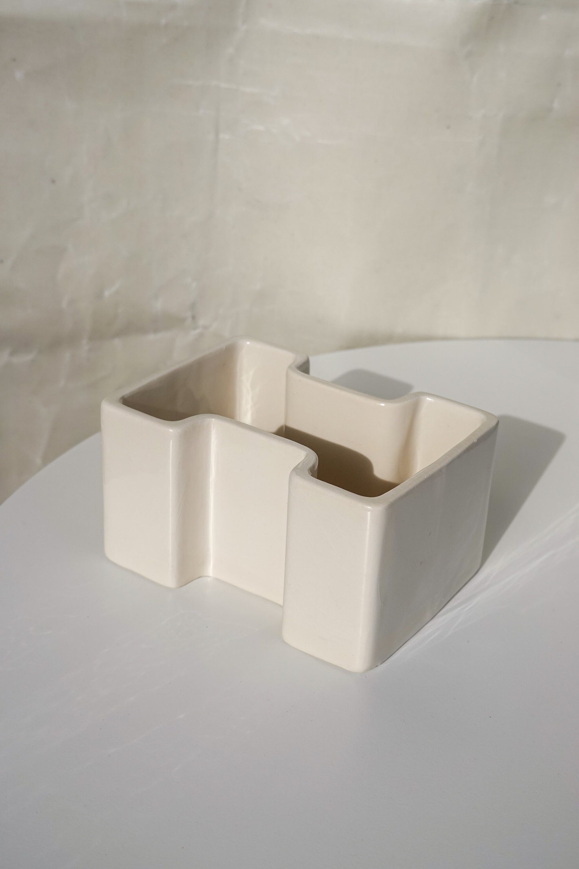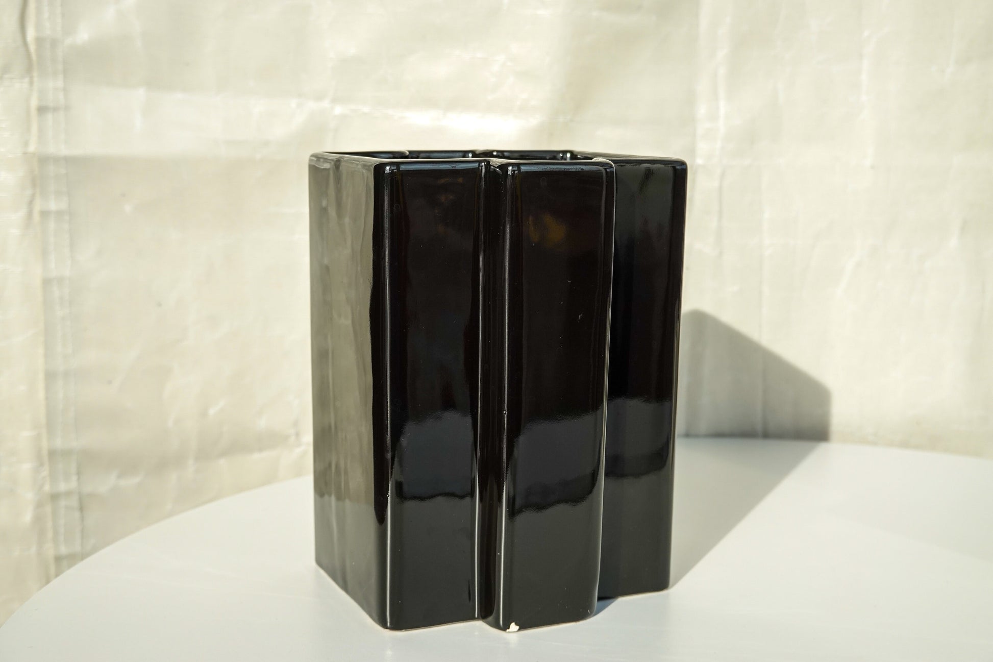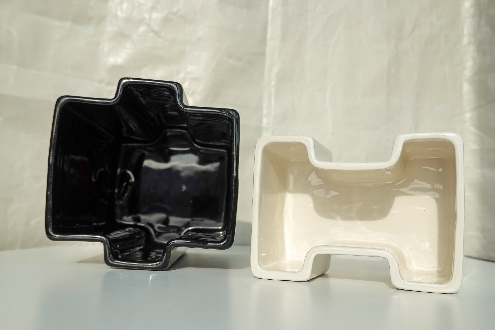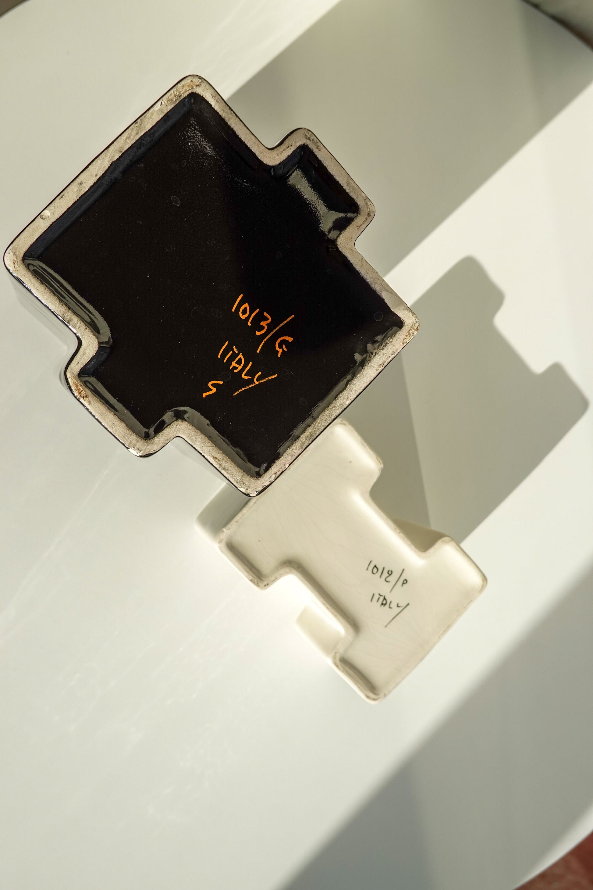 This black and white pair of geometric vessels is quintessential 1950's - 1960's Italian design. In the style of Angelo Mangiarotti, Gabbianelli, Angelo Spagnolo for Sicart and the like, this striking set is timeless. Featuring a high-gloss glaze on both, the tall black and the short white have different, complementary shapes, fitting together almost like puzzle pieces, but not precisely. Intriguing for the eye and complementary to most modern and vintage interior styles. This particular style is emblematic of the height of midcentury Italian ceramics.