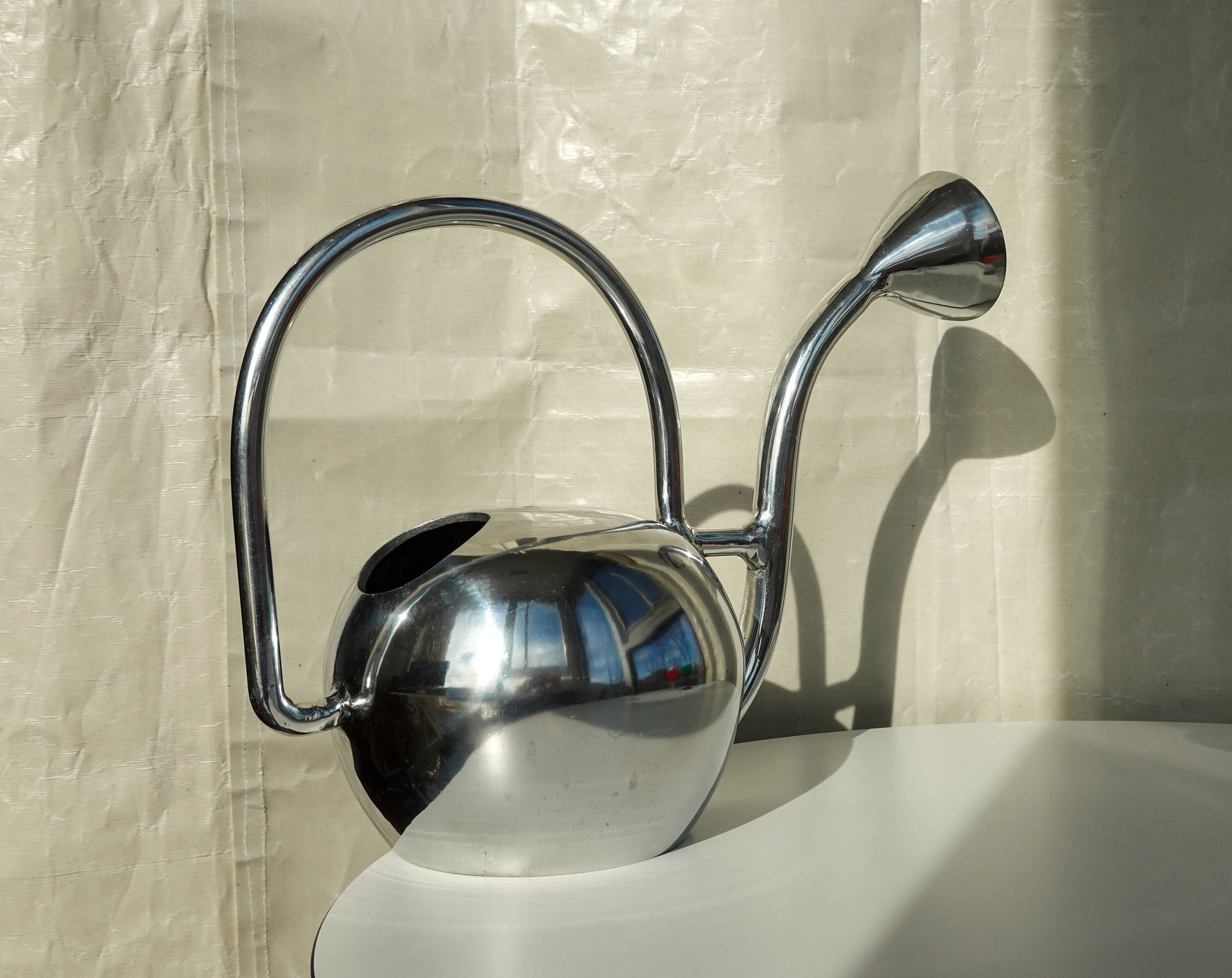 Absolutely stunning. This orb-shaped vintage watering can is a gleaming silver tone, a sculptural, arc handle and round spicket. With tons of holes at the exit point, a large 1.75 liter capacity, and literally no way to leak, this is the perfect addition to any plant-lovers indoor or outdoor setup.