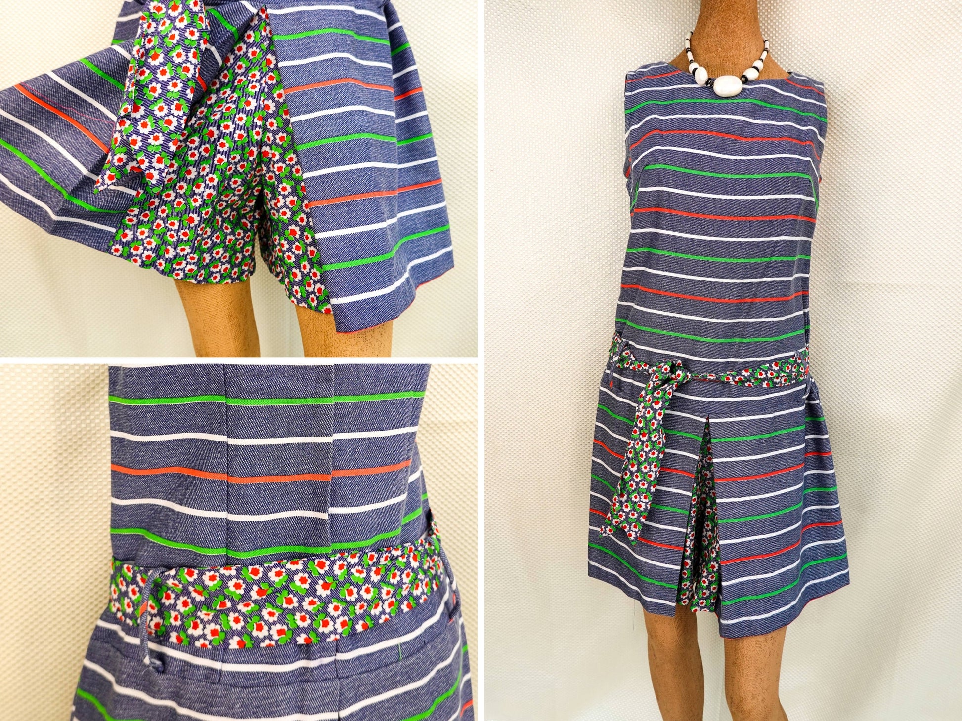 60's Romper - Vintage Handmade Striped Boxy Skort Romper - Sleeveless One Piece - Medium