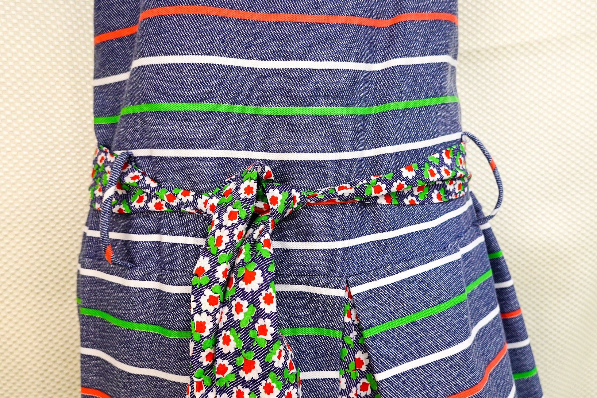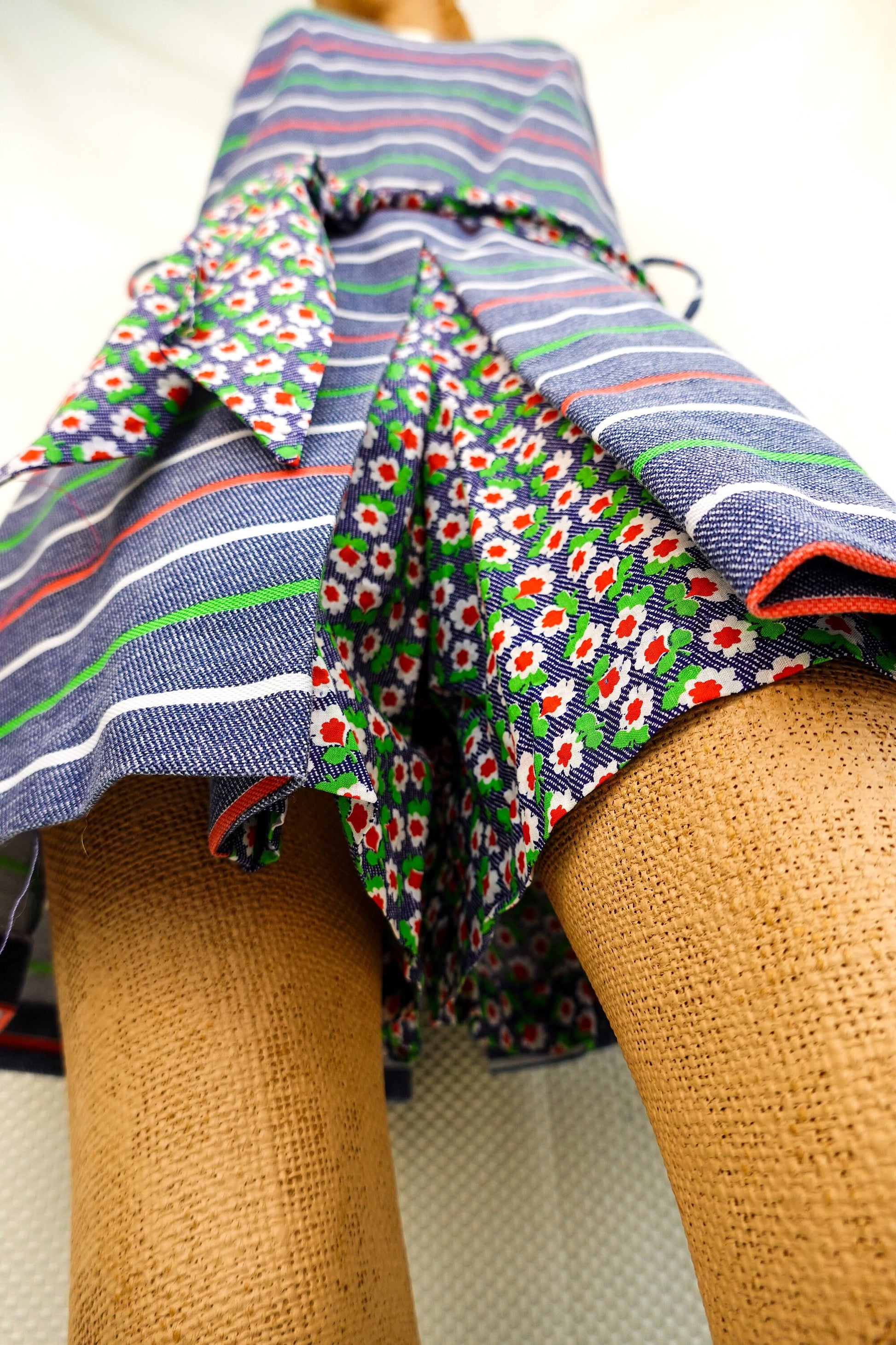 There are two cotton fabrics: the body is a denim blue with contrasting diagonal stripes, and red, white and green thicker horizontal stripes. The second fabric constitutes the interior shorts of the skort and the belt, and is the same background, but with a bright white, green and red flower, it's also a bit more lightweight than the other.