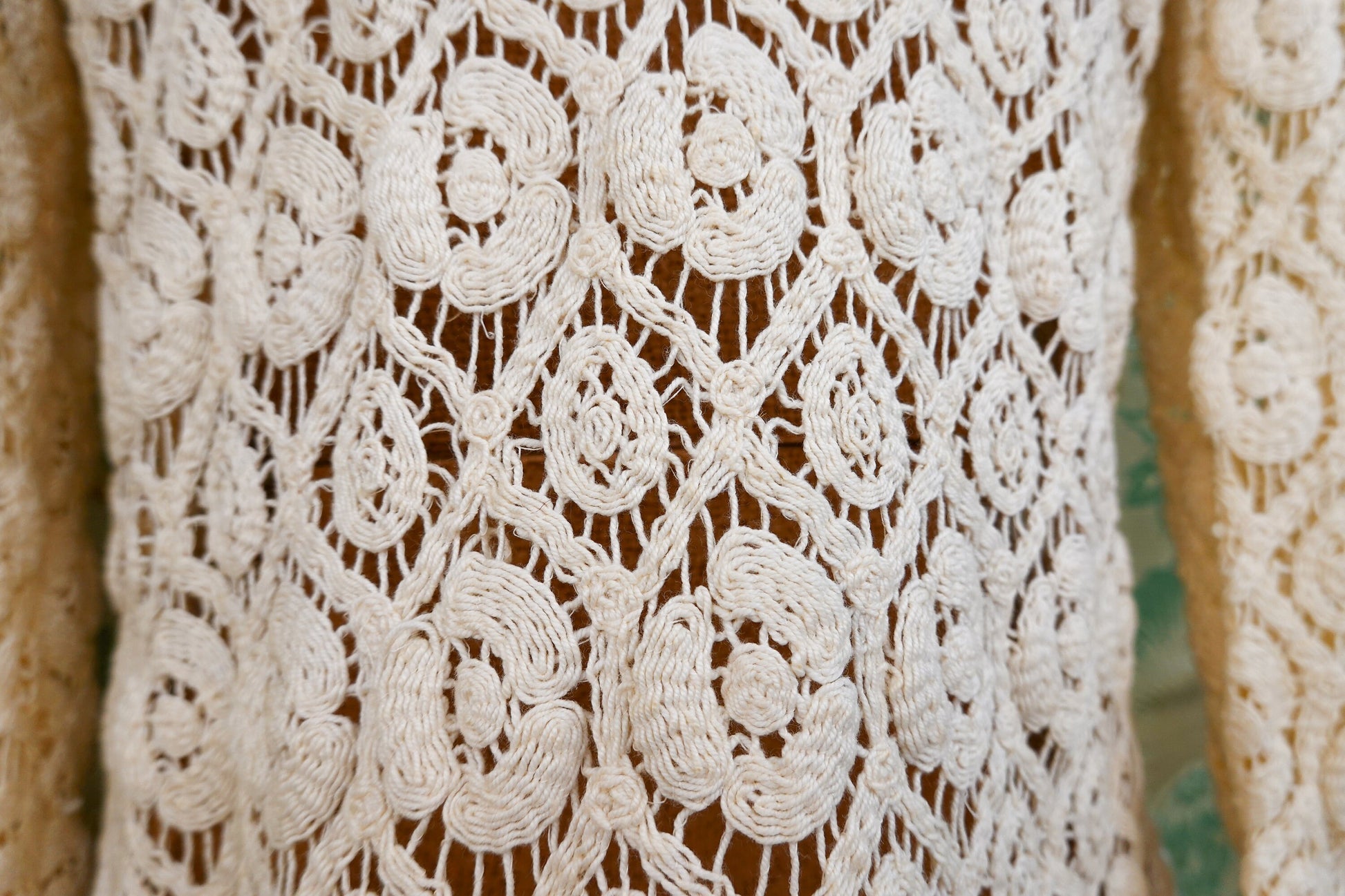 WOW what a rare find. This full length open knit floral pattern cardigan is an open front perfect layering piece. It is made of a thick cotton yarn in an ivory/off-white color. It's got a great weight and is cozy. There are two different patterns: the main floral and then a two-layer circle link on the sleeves and edges. This is the PERFECT summer toss-on piece. Very boho and cool-girl vibes.