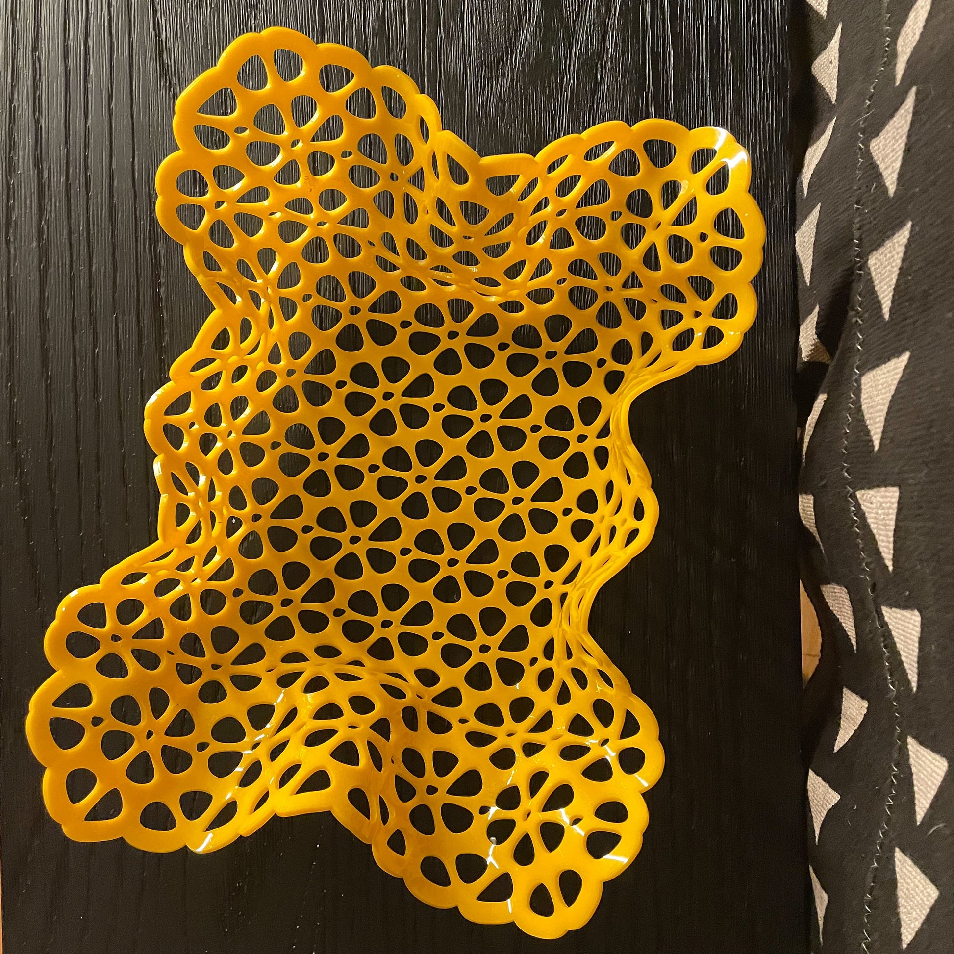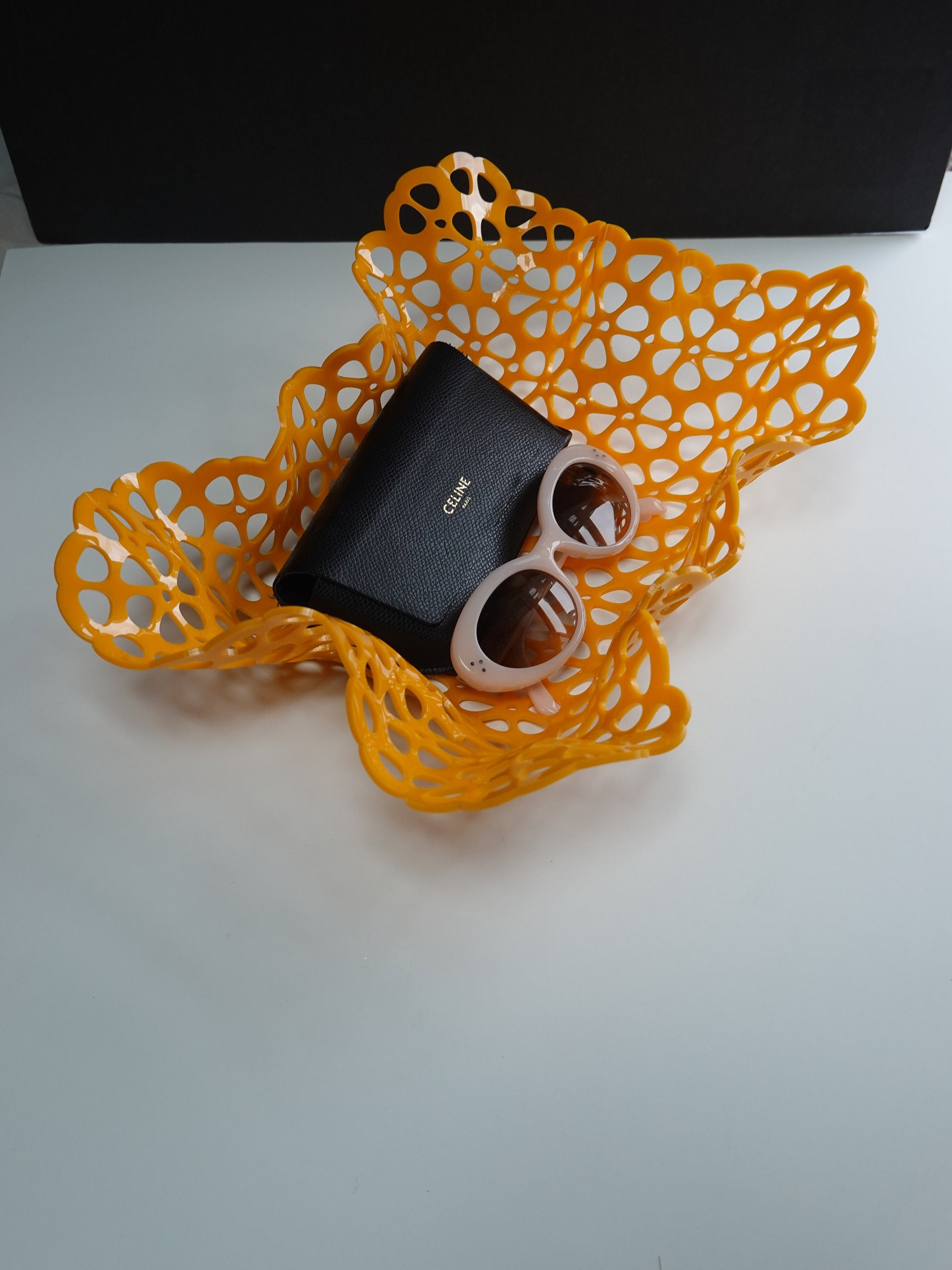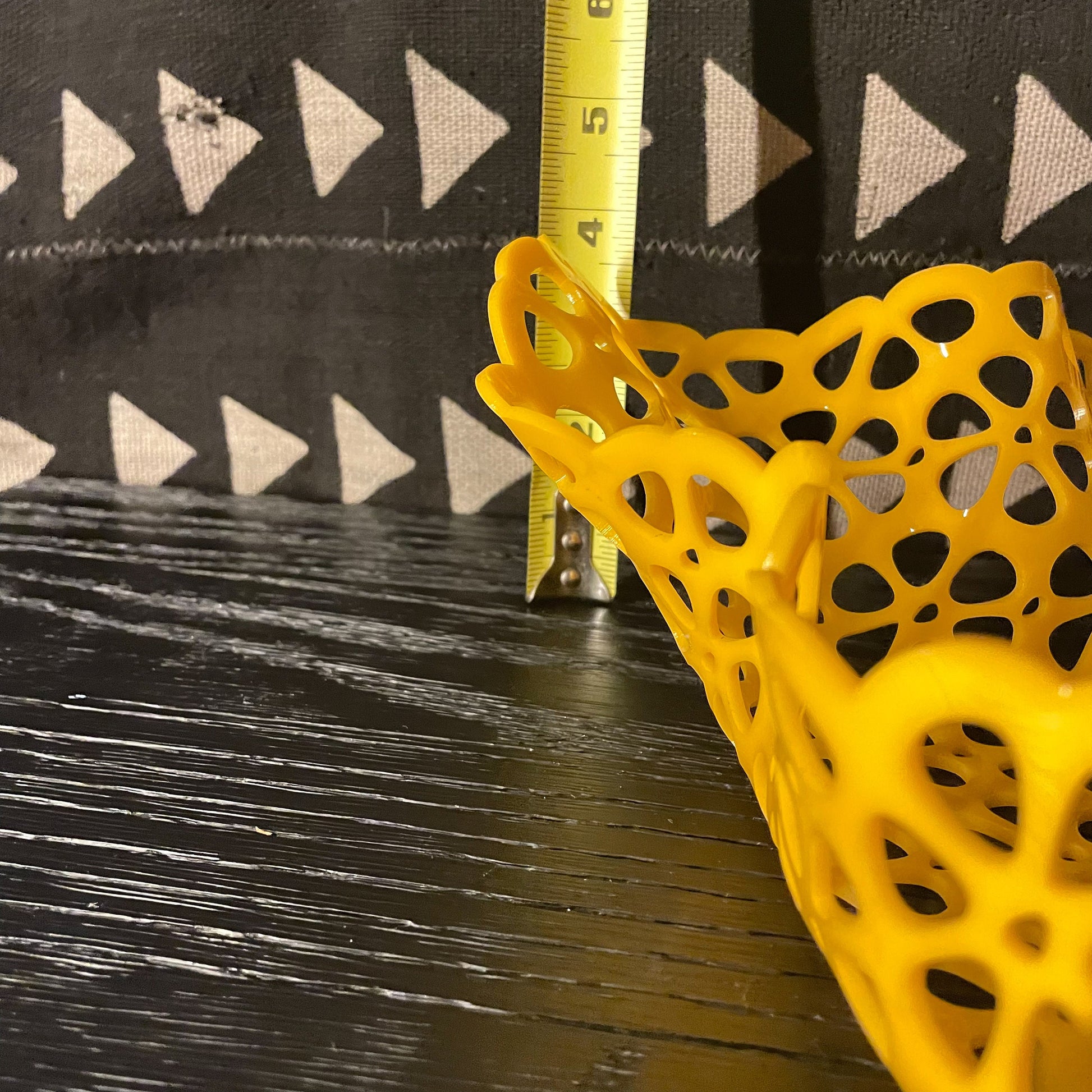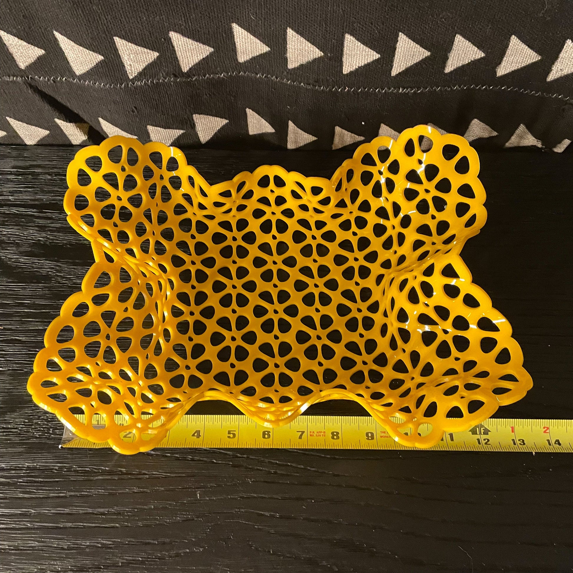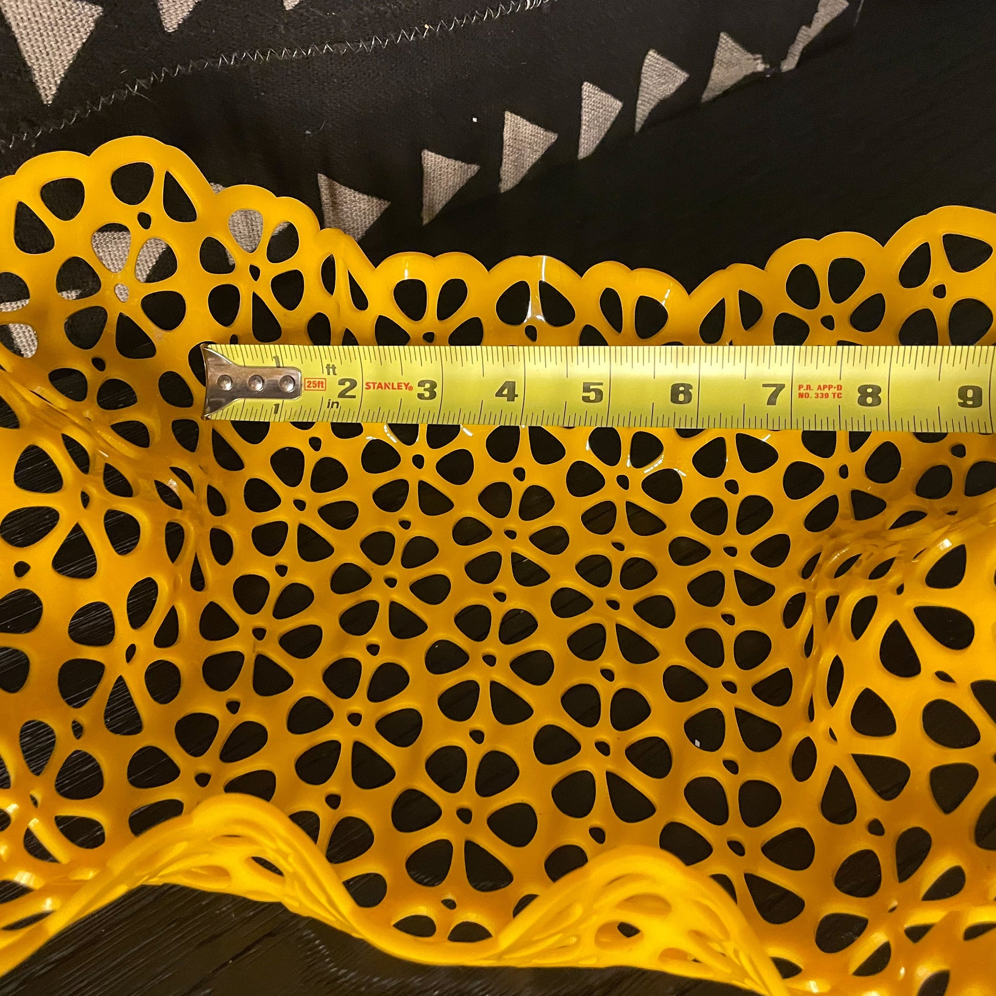 What a fun, bright basket. Many uses for this versatile, wavy vessel that has big crimped edges and an all over daisy-like design. Use it in the kitchen, bathroom, bedroom, bedside -- whatever your heart desires.