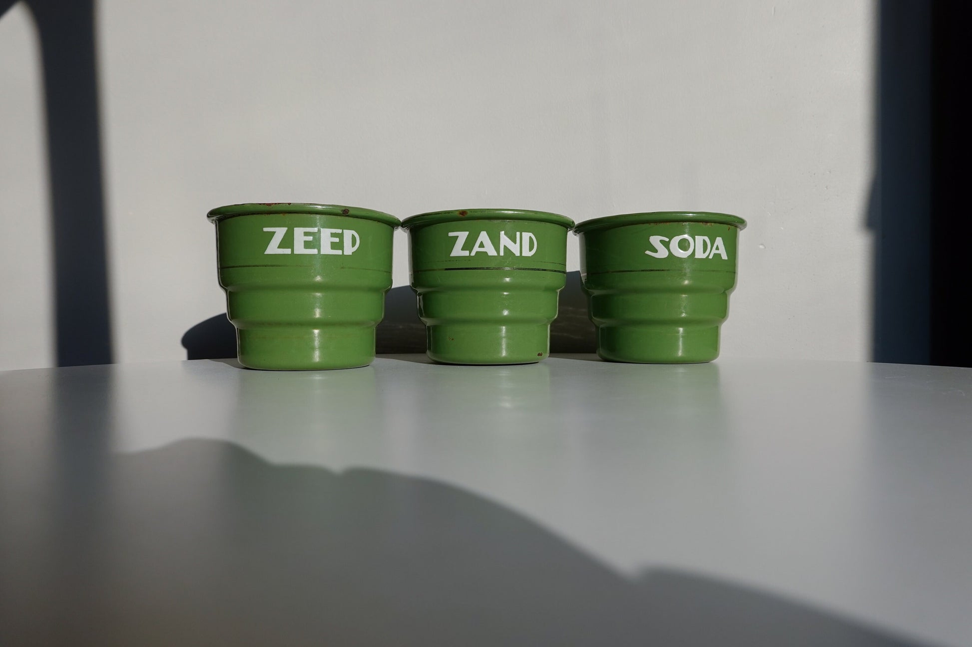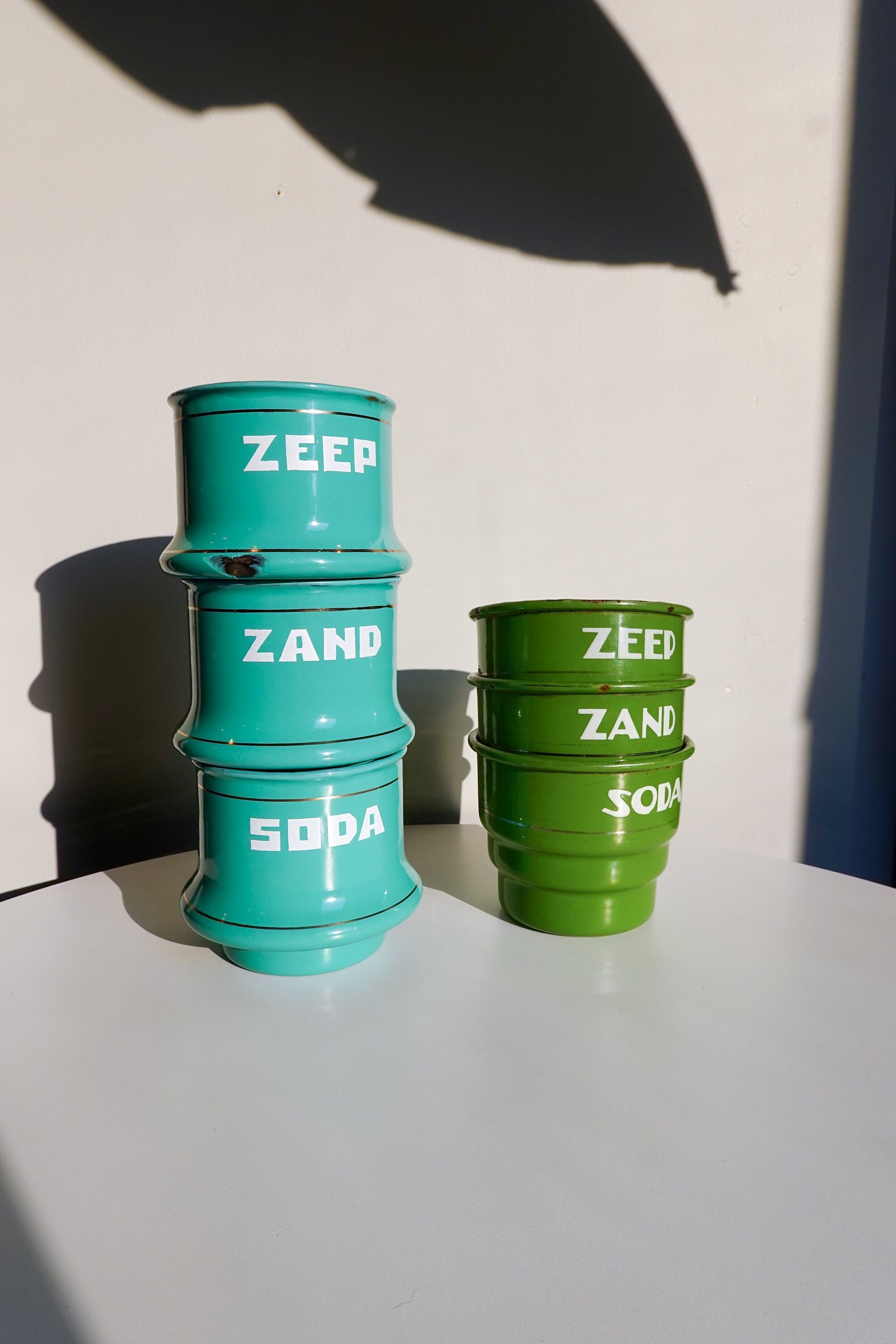 70's Dutch Enamel Wall-Mounted Storage - Zand, Zeep and Soda - Beautiful Green - Vintage Washing Station - MCM Wall Mounted Storage