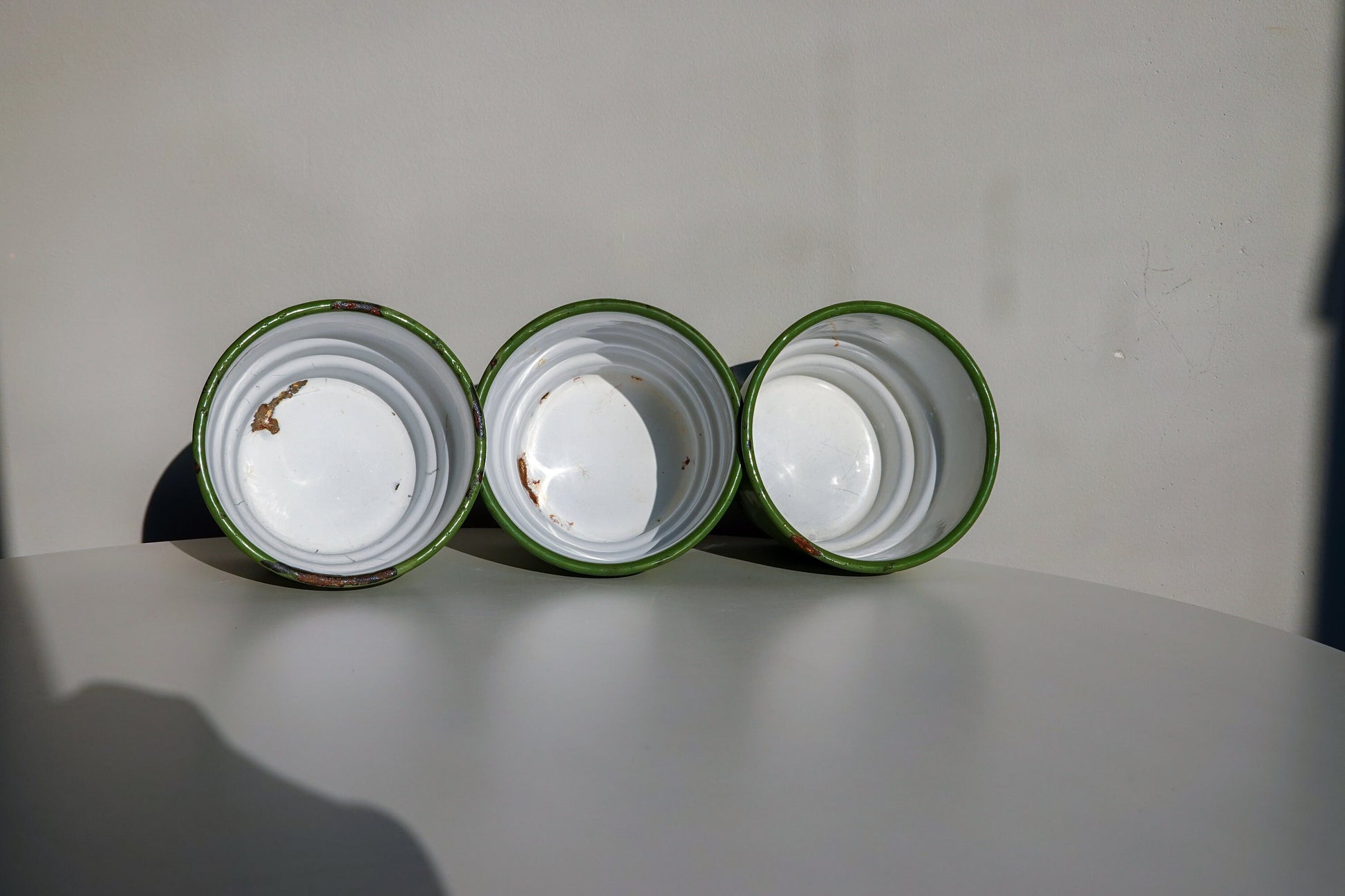 Well look at that awesome font...I just cannot get enough of it. This olive green enameled metal wash station features three stackable cups and a wall mount. Featuring super graphic labels for each container in an applied white paint, accented with a metallic band across the cup. They are tapered, and stackable!