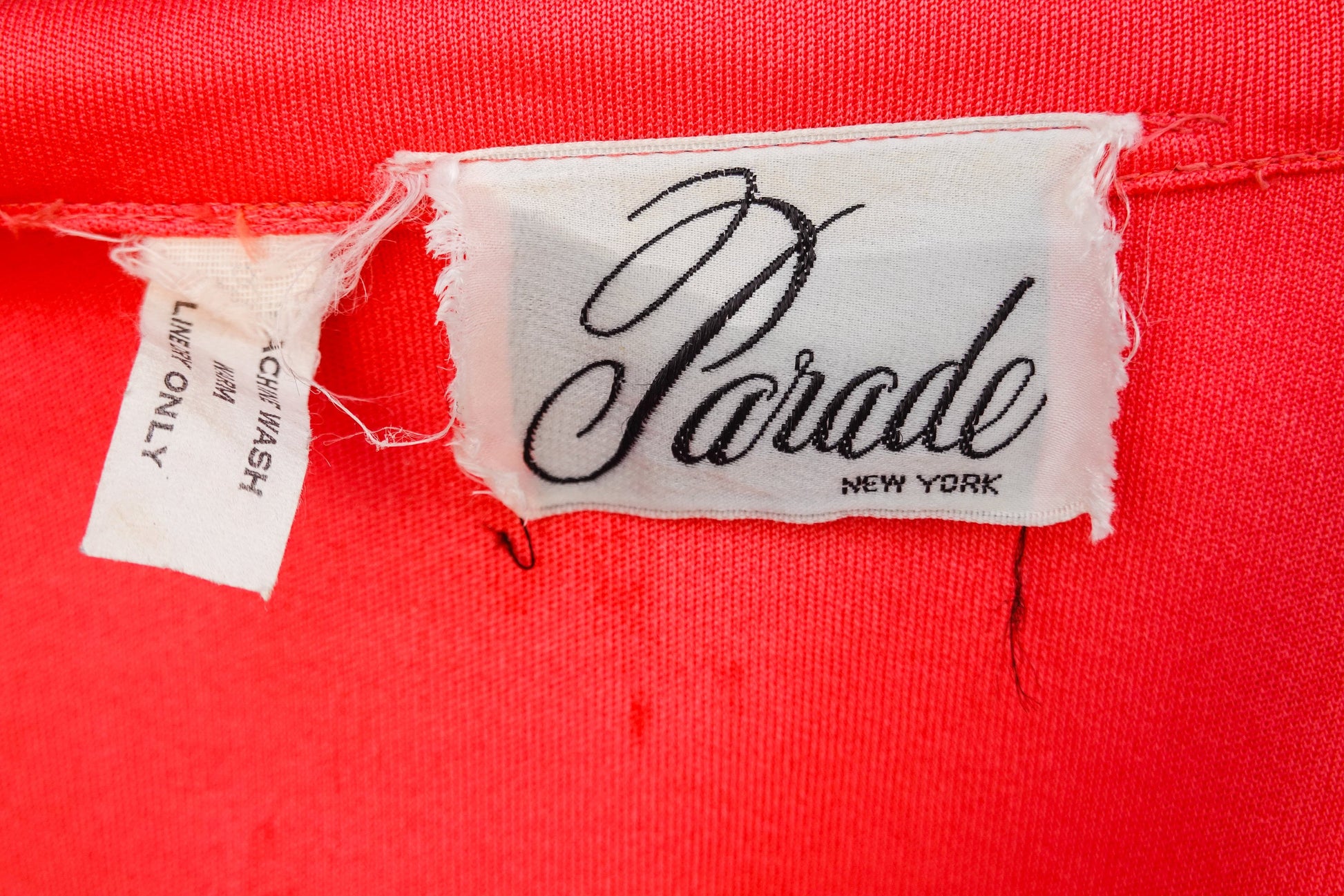 This dress is so pink, but it has a coral tint and is not at all fluorescent. Featuring a v-neck, super wide lapels (5 inch at widest!) and cuffs, string belt loops and an attached belt, this is a VERY groovy 1970's dress. There are no buttons, snaps, zippers, or pockets. The seams are all wonderfully done, and it's a well-made piece.