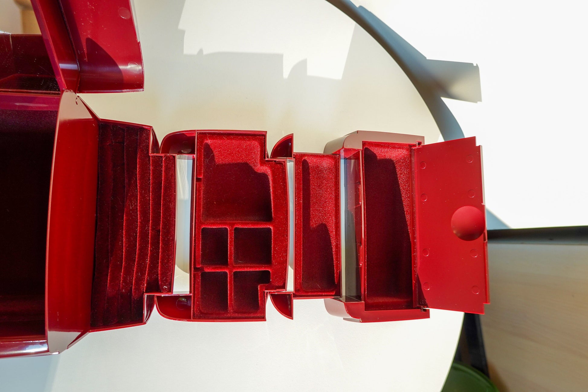 They don't make them like this anymore. This fantastic maroon-red jewelry box is the most expandable, ingenious design I've ever seen. With 9 compartments that fold into one another, there is a spot for everything, and everything is secure.