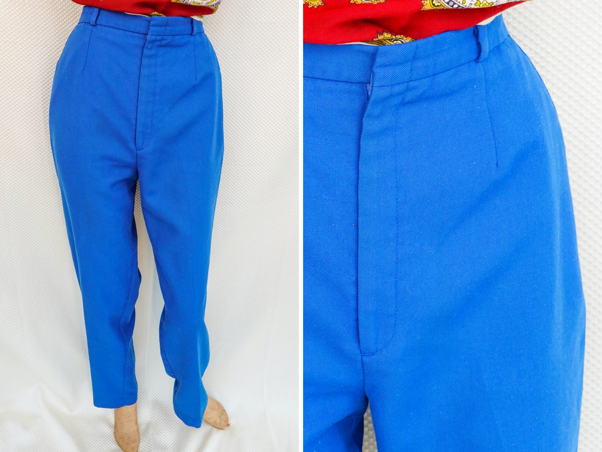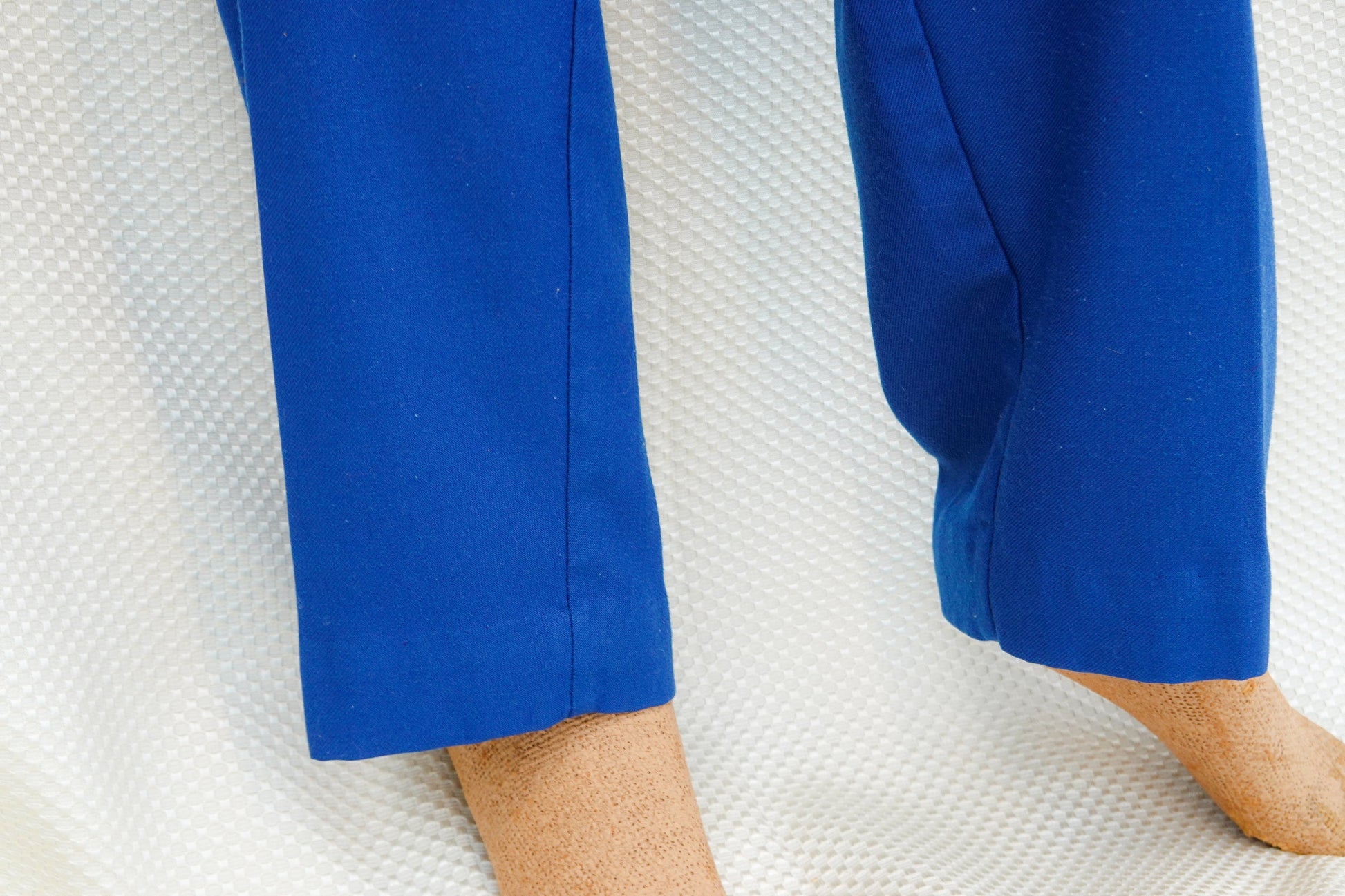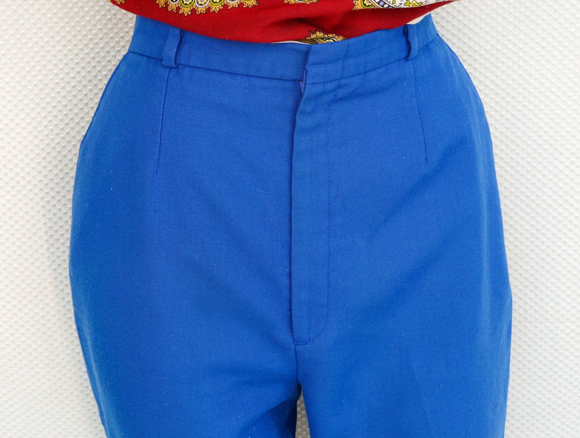 Super high waist, nice wide hips, straight leg heavy cotton pants in a tasteful bright blue. Likely late 1970's, they're not exactly "mom fit" jeans but have a similar silhouette. Flattering for curves with a nice tapered leg. Featuring two well-placed darts in front and back, two generous front pockets, belt loops, and a zipper closure plus a hook clasp.