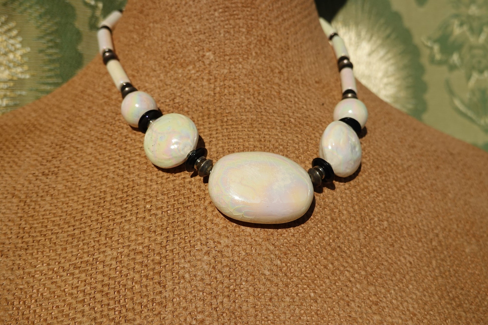 Pewter and black spacer beads punctuate the statement beads, which are ceramic glazed. One big oval statement stone, four smaller spheres and circles, with 5 cylinder iridescent beads on each side. Great for spring/summer!