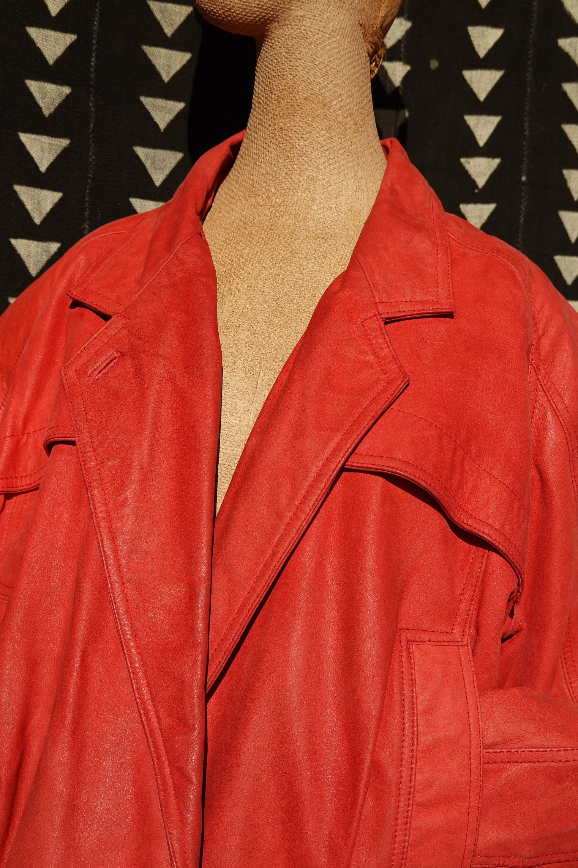 This bright red leather jacket is quintessential 1980's, including dolman sleeves and padded shoulders. It is not patent leather, but rather a soft, almost suede-like leather. It's a marvelous moto jacket, with an open front, snap closure and elastic waist. Details are impeccable, with large lapels, seams on front and back, button-closure cuffs, sweat-wicking back and a super graphic silky lining. It also has two generous pockets.