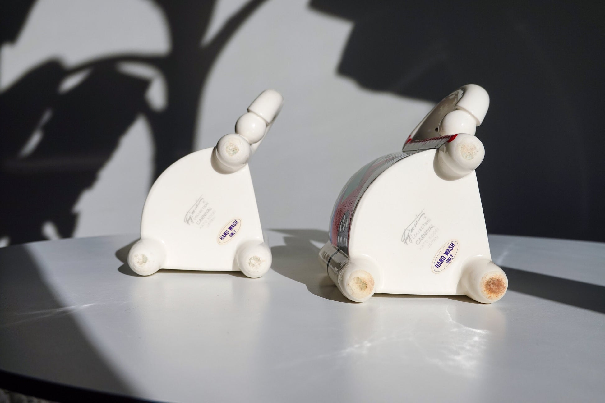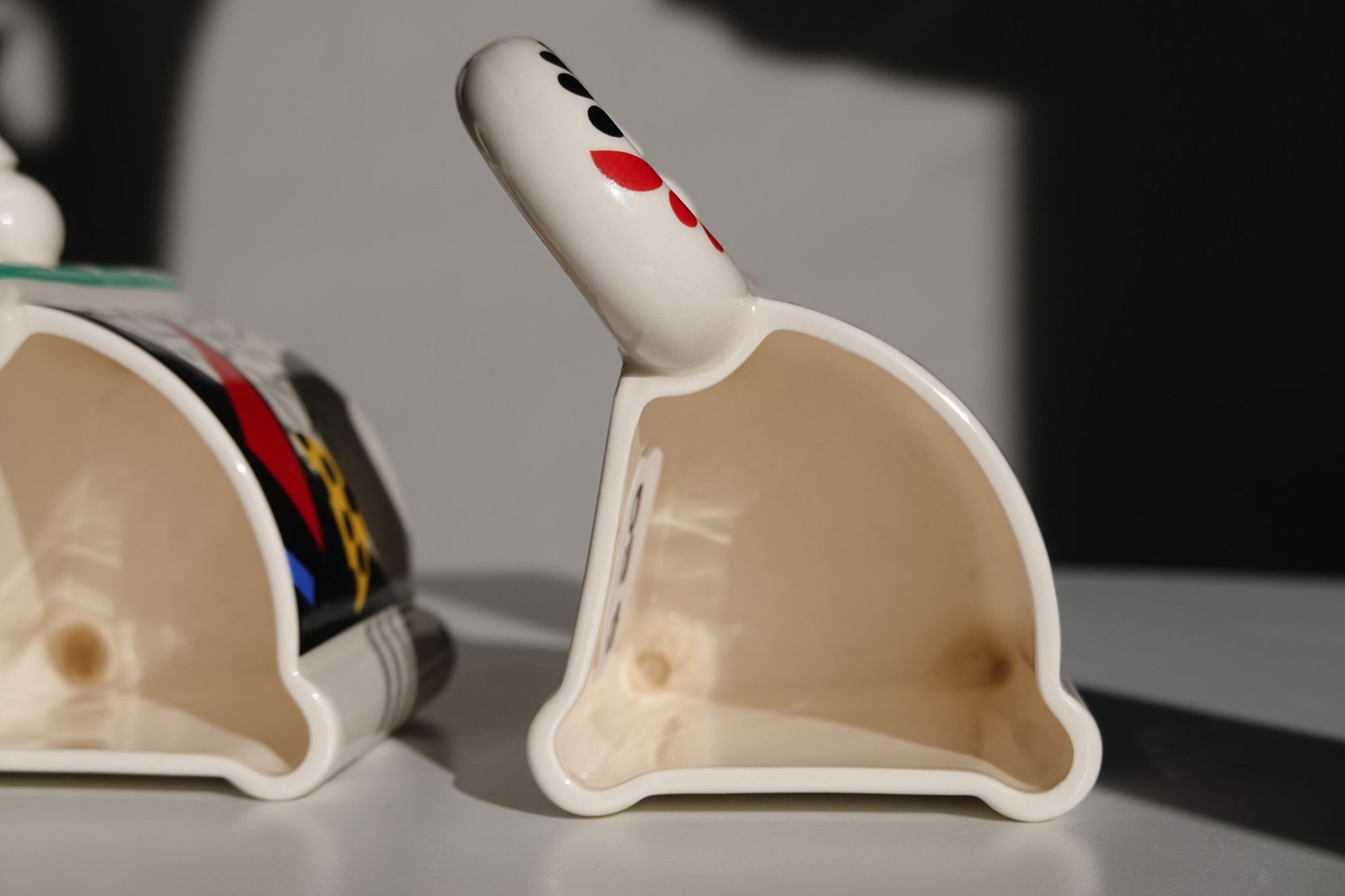 Japanese designer Fujimori was art director for Kato Kogei Ceramics when these were produced in the 1980s - his signature line. Quintessential postmodern, and VERY Memphis Milano, with bright primary colors, basic geometric shapes, and some lovely squiggles here and there.