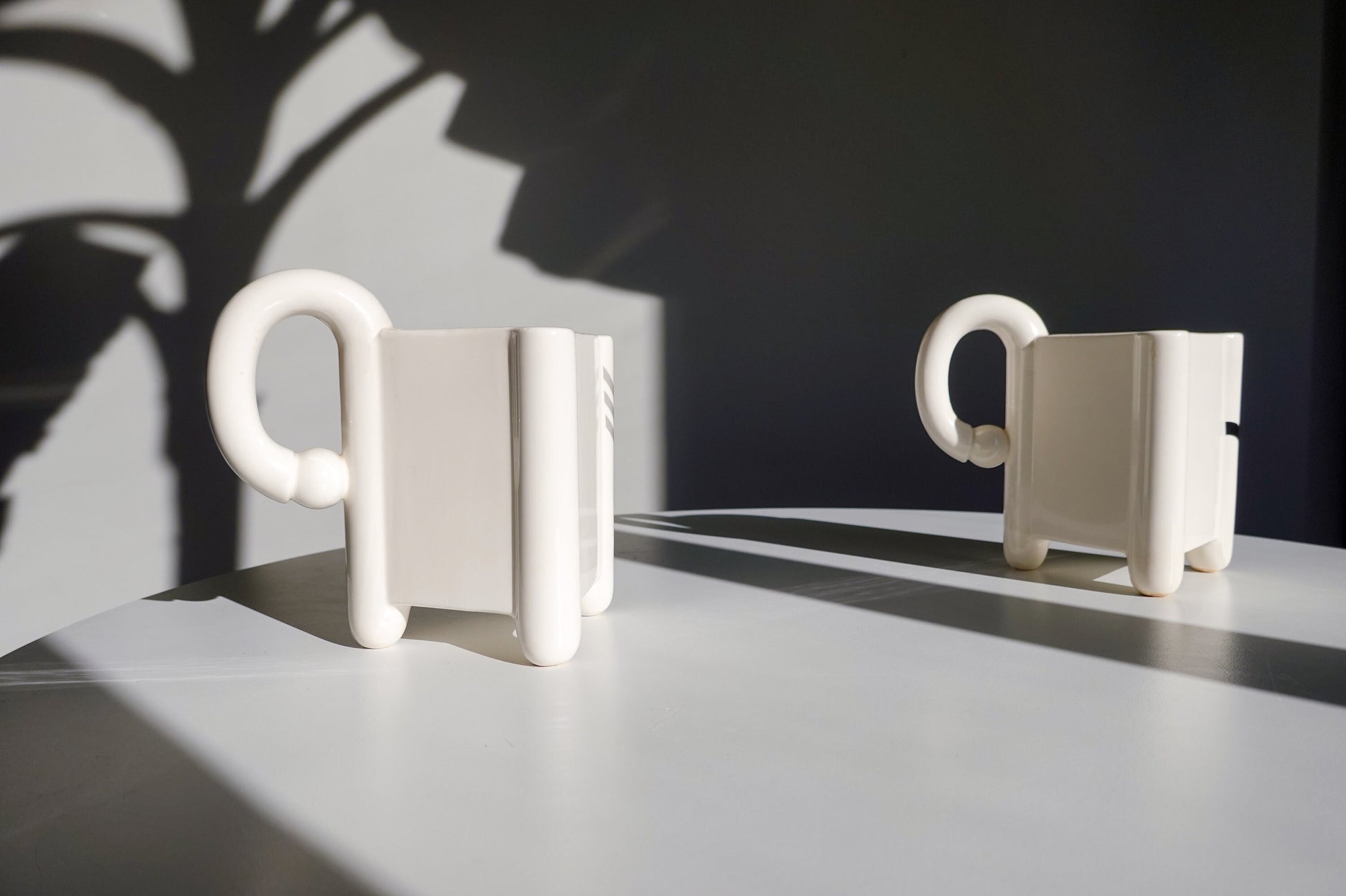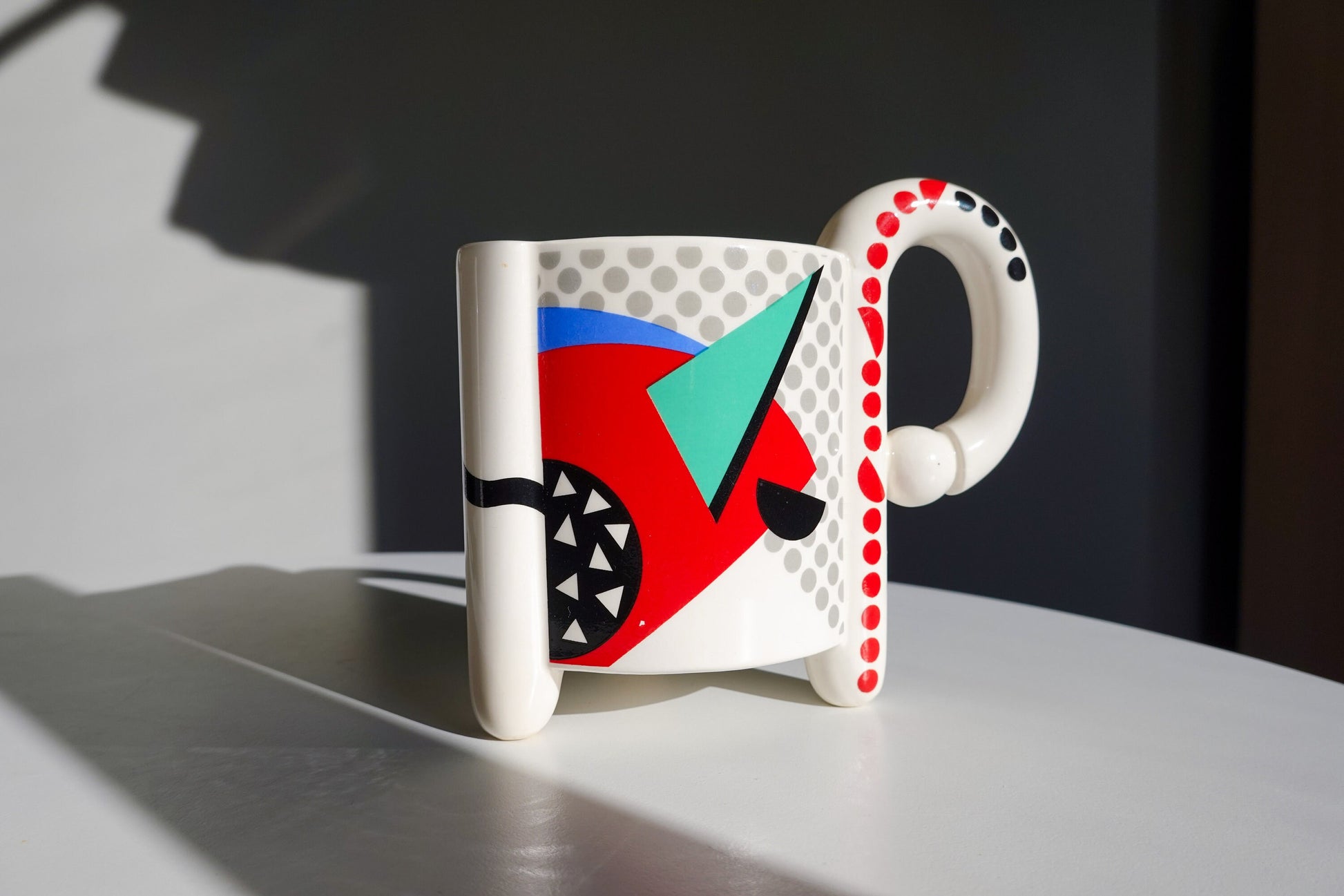 Quintessential Memphis Milano design, with geometric shapes in the primary and secondary colors on the face and handles of these mugs. Each has a different pattern - so fun! They're in a triangle shape, one curved edge, and have three feet. More pics available, feel free to ask!