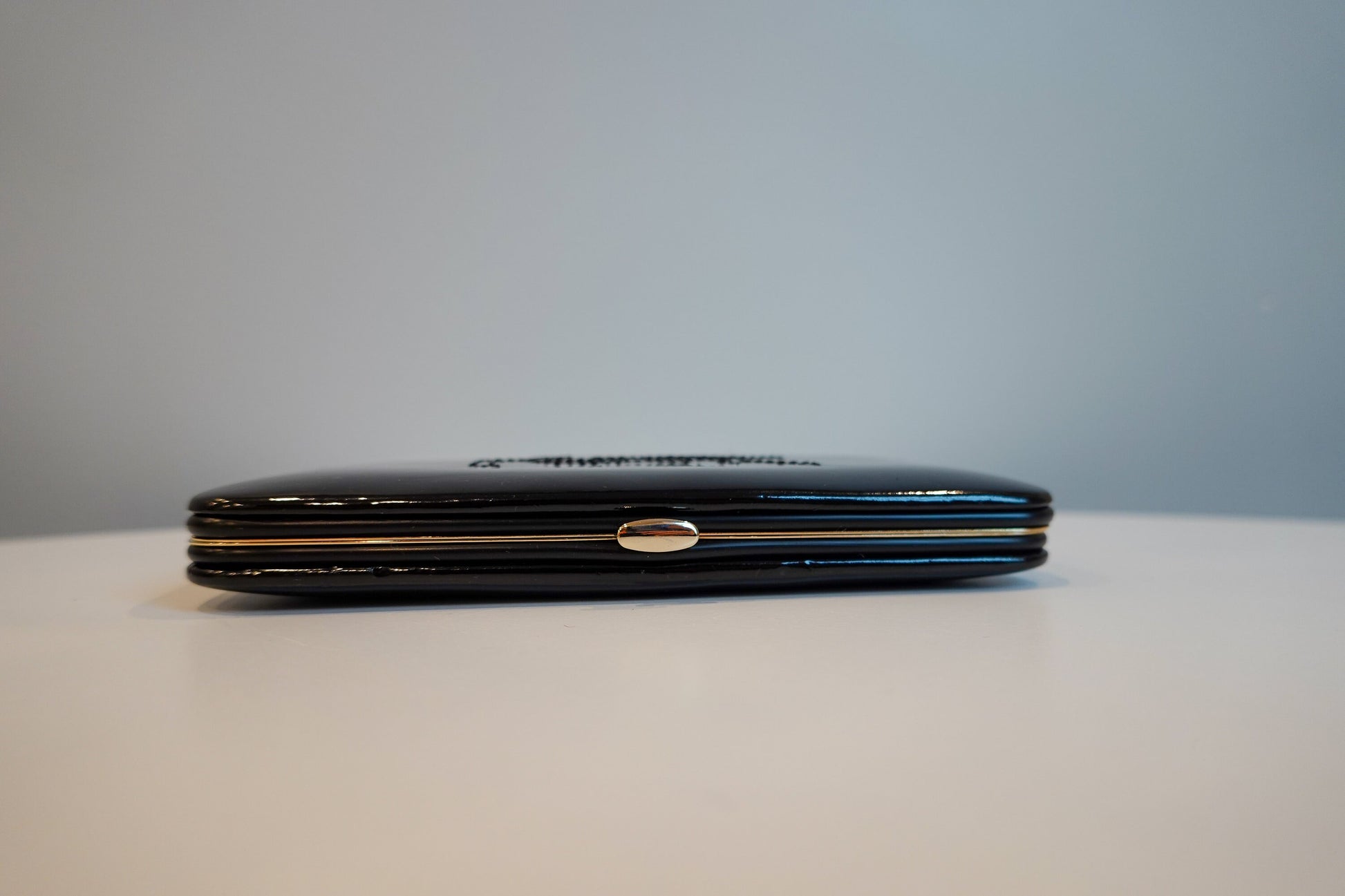 Great rare new old stock vintage Yves Saint Laurent Perfumes nail care kit. The exterior is a lovely black patent pleather, and the interior is a bright red silk. BRIGHT gold hardware, including the scissors (cuticle cutters), and nail clippers. The kit also includes a cuticle pushing stick and a nail file. Each tool is in its own elastic strap. Keep theirs and use them, or replace with your own!