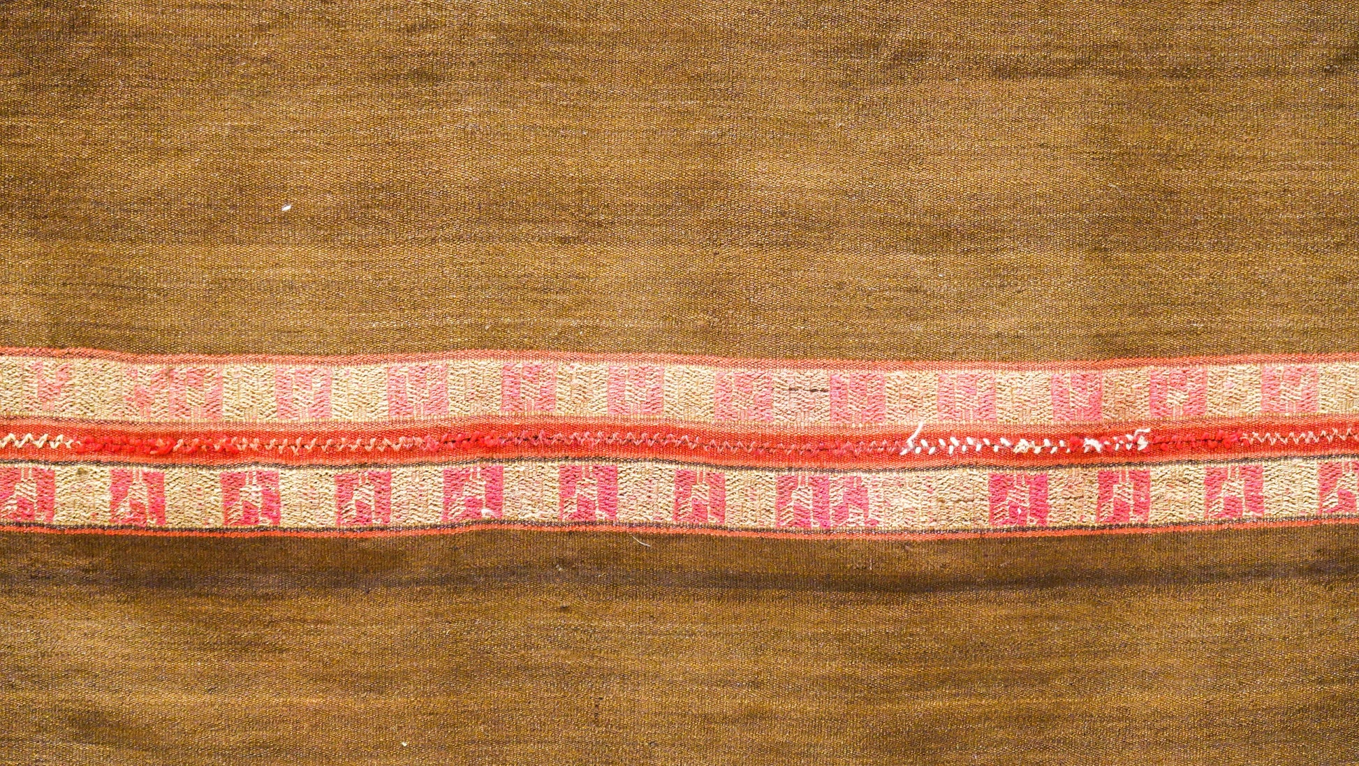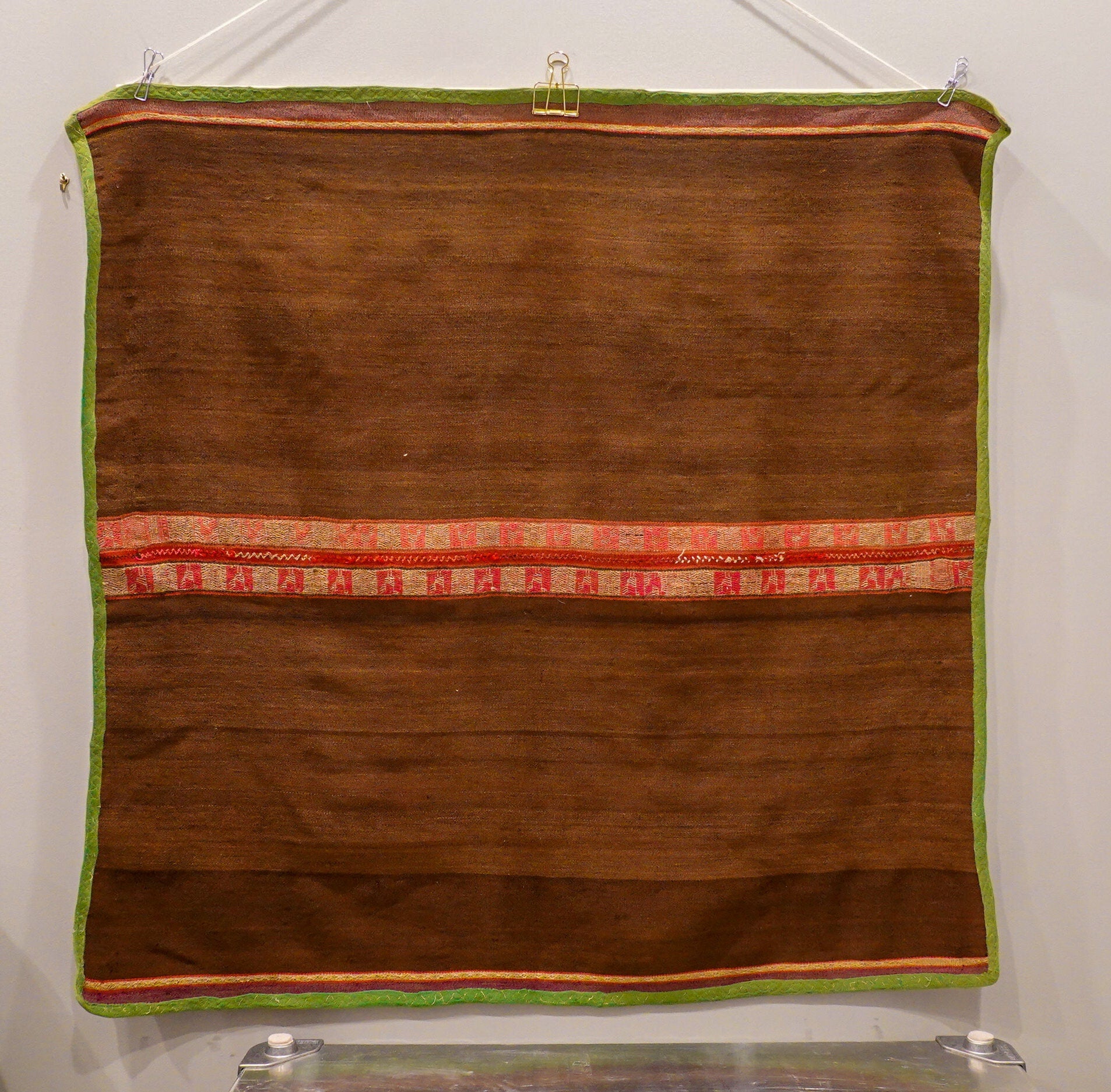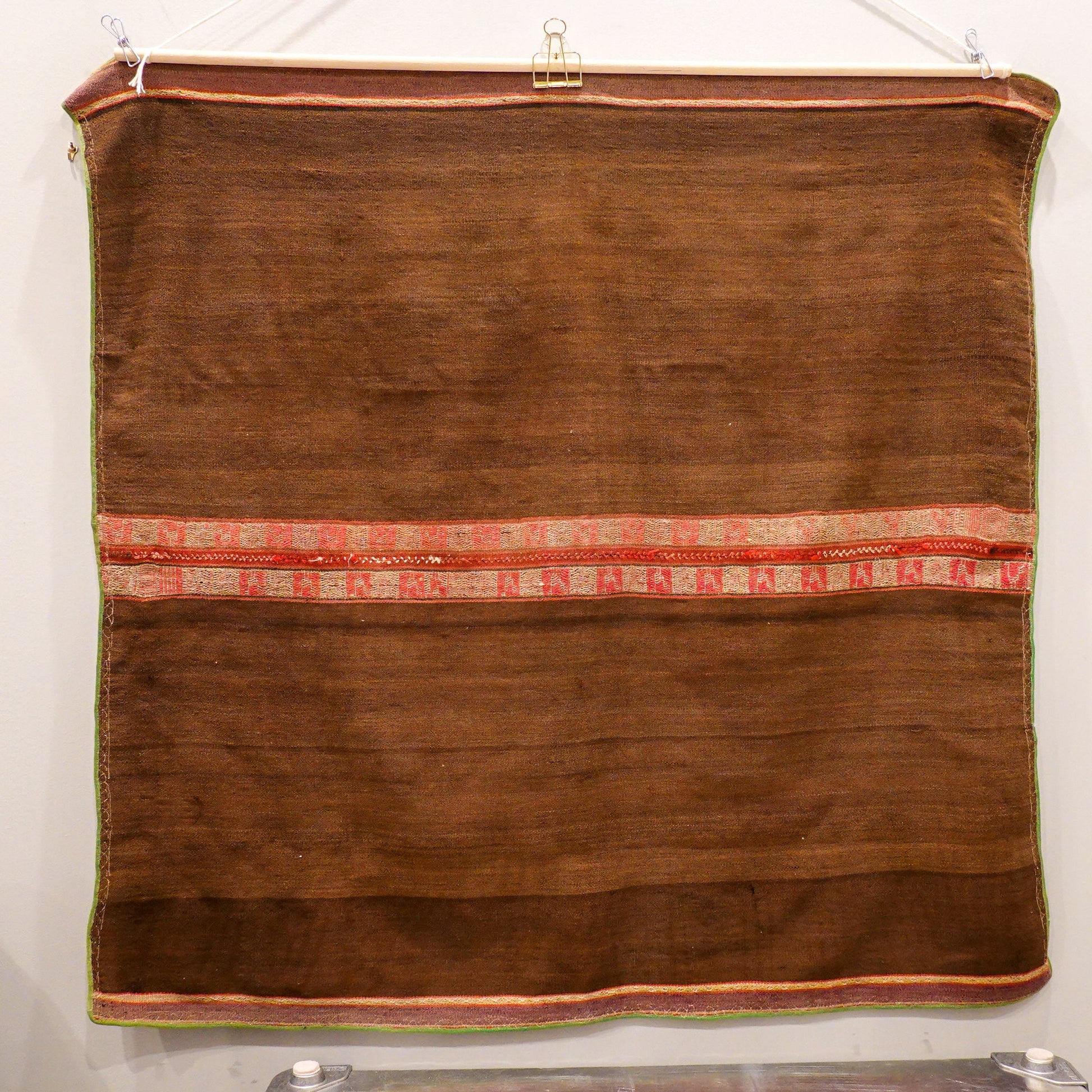 Marvelous antique Peruvian textile. It is likely from the 1940's given the feel, which is thick and somewhat worn. Primarily brown with great depth throughout. Finished on all sides in a gorgeous green wool edging. It was constructed of two panels, they are stitched together at the middle red line - see pics for details. There is a Peruvian pattern in two bands through the middle as well. The top and bottom have additional finishes on the interior edges.