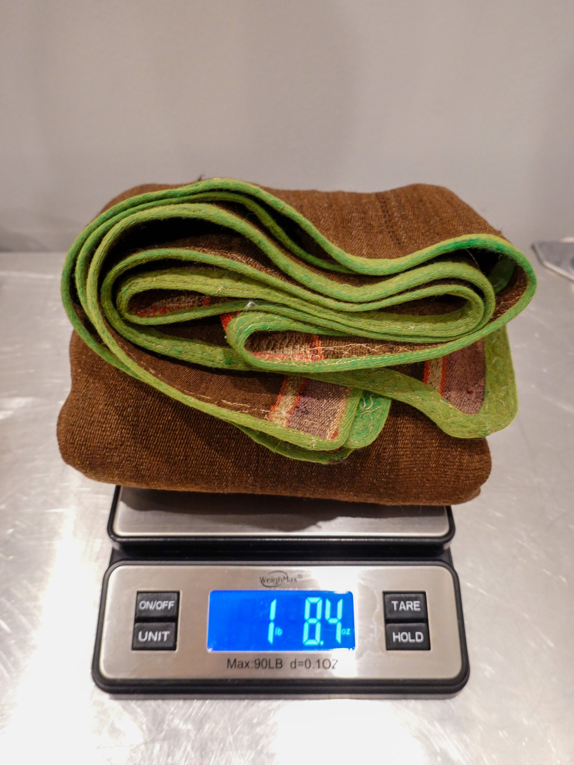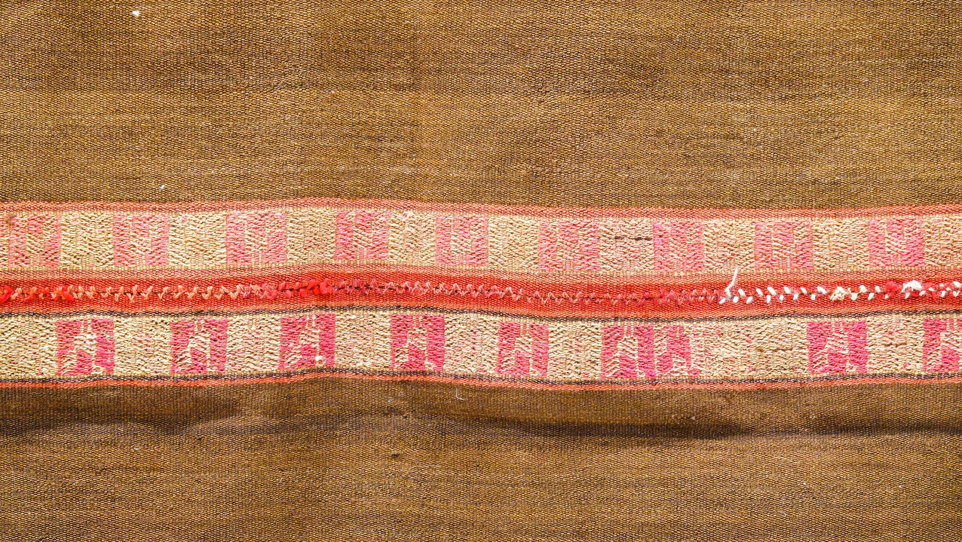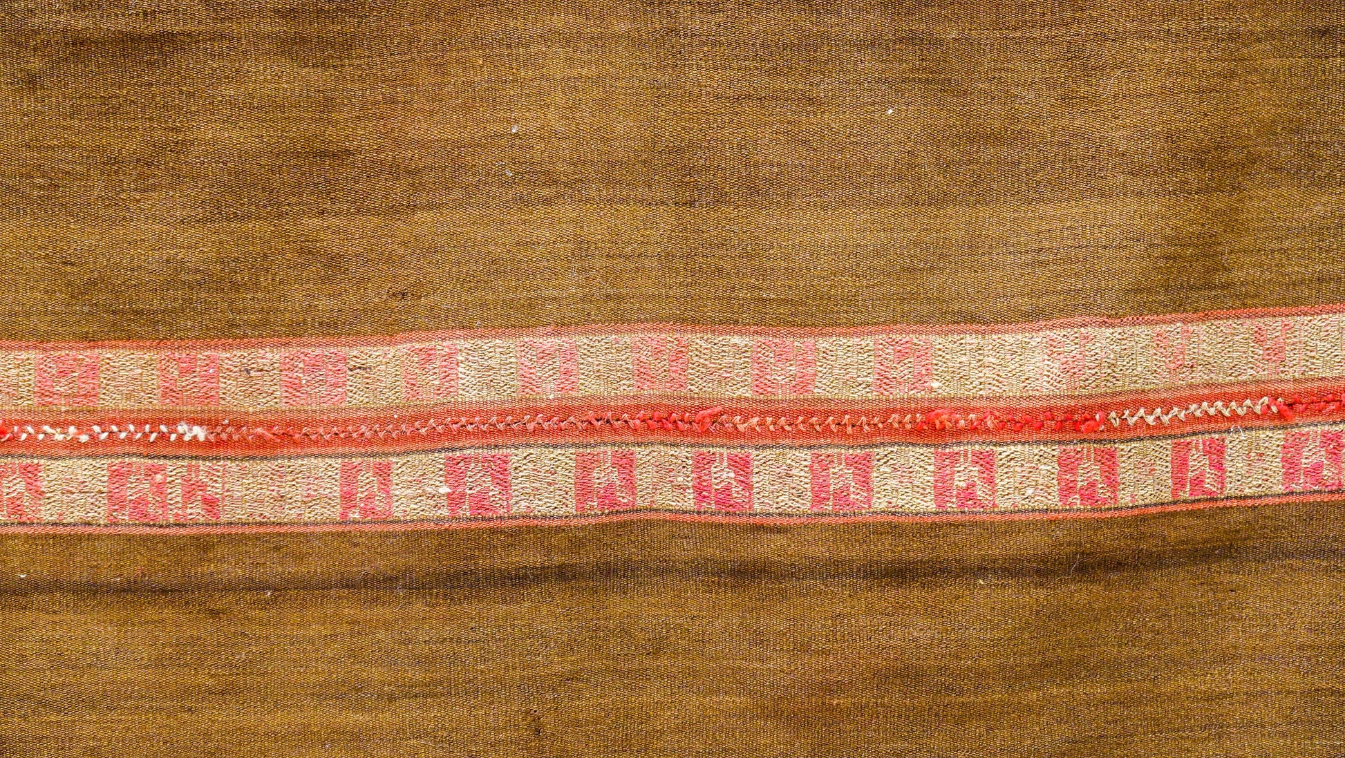 Marvelous antique Peruvian textile. It is likely from the 1940's given the feel, which is thick and somewhat worn. Primarily brown with great depth throughout. Finished on all sides in a gorgeous green wool edging. It was constructed of two panels, they are stitched together at the middle red line - see pics for details. There is a Peruvian pattern in two bands through the middle as well. The top and bottom have additional finishes on the interior edges.