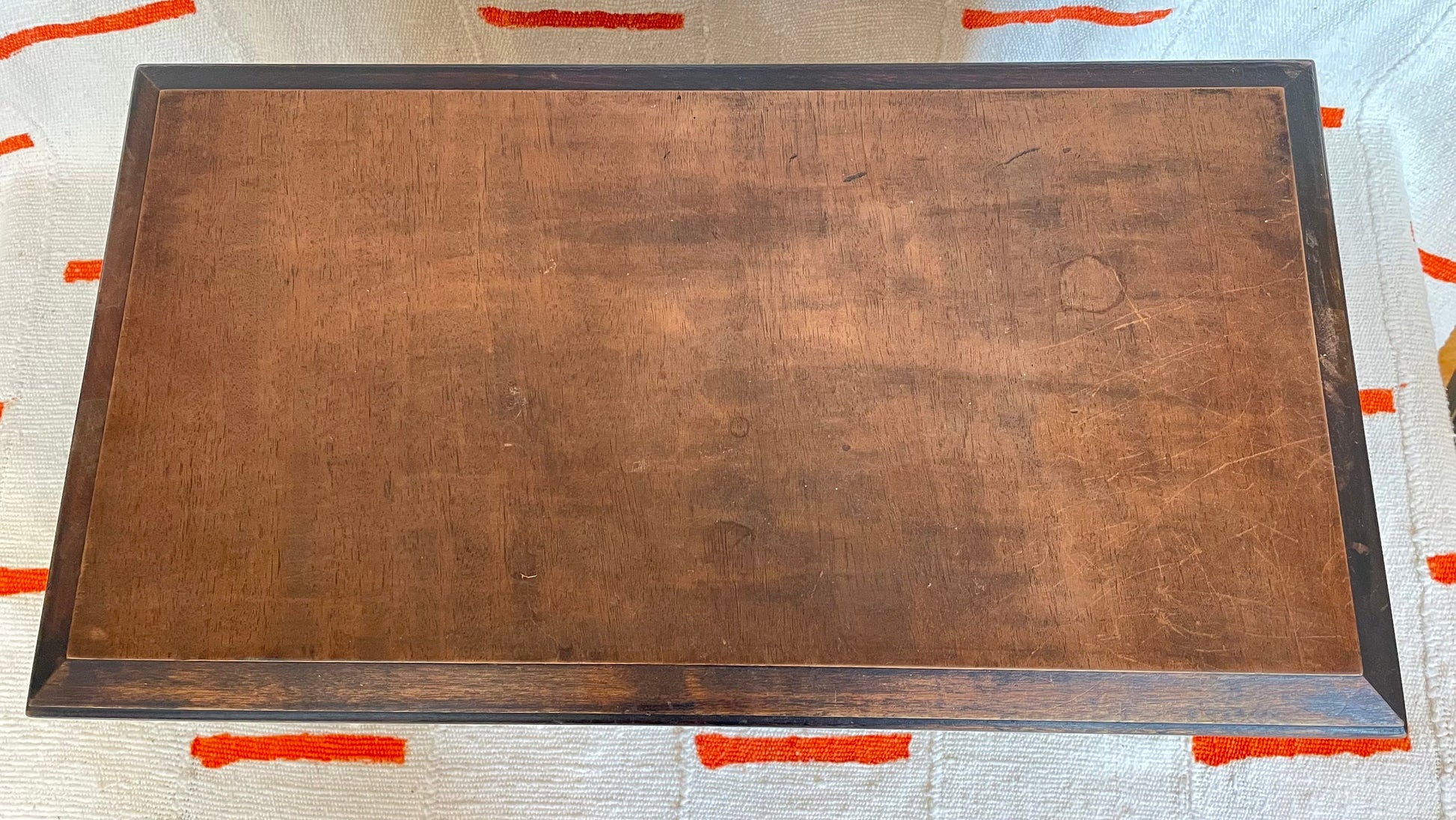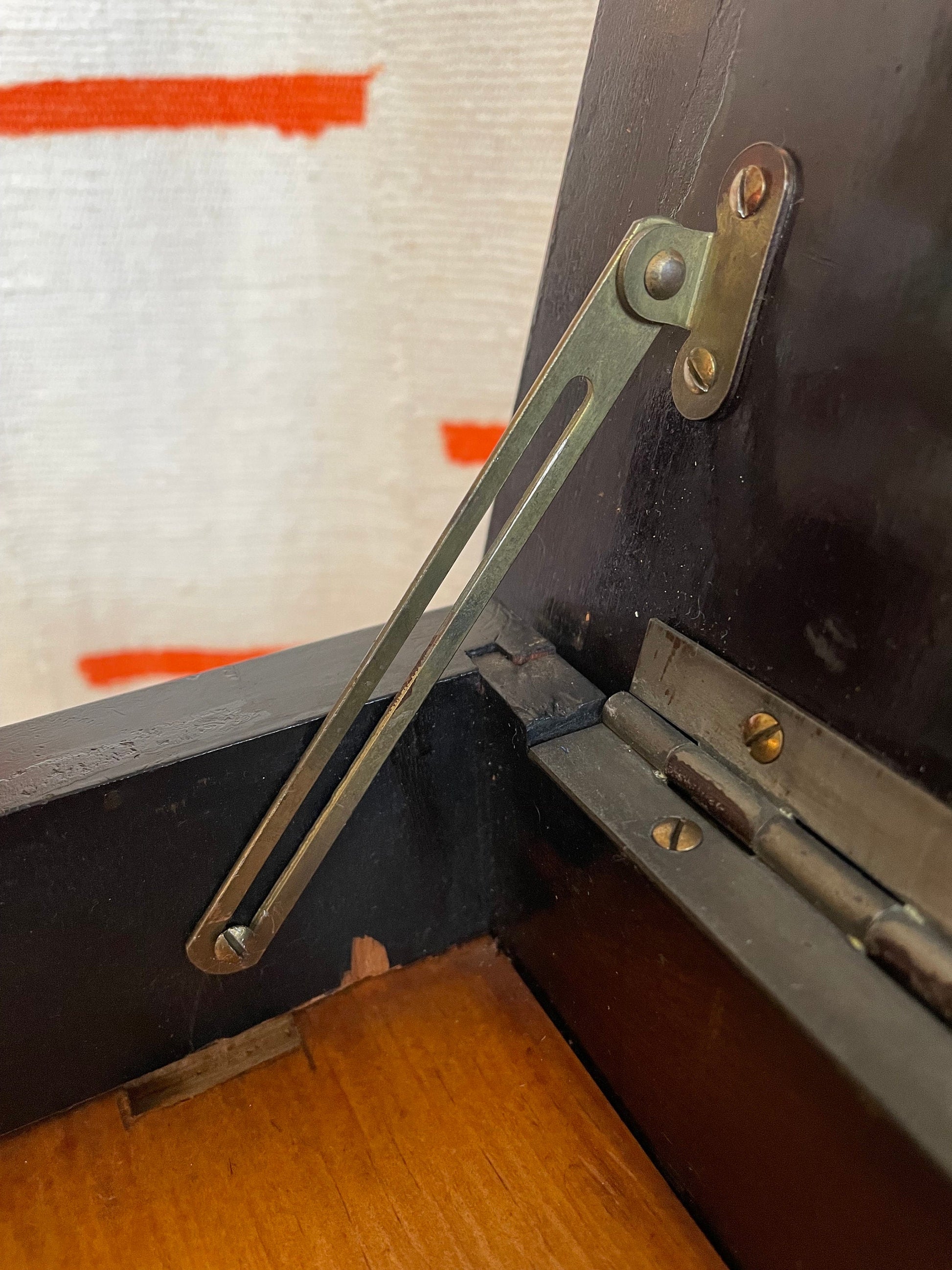 The edges are beautiful, federal style. Four round low profile feet support the piece. The back is finished and very nicely made. The mechanism to open the top is free of rust and preserved, works like a charm and without resistance.