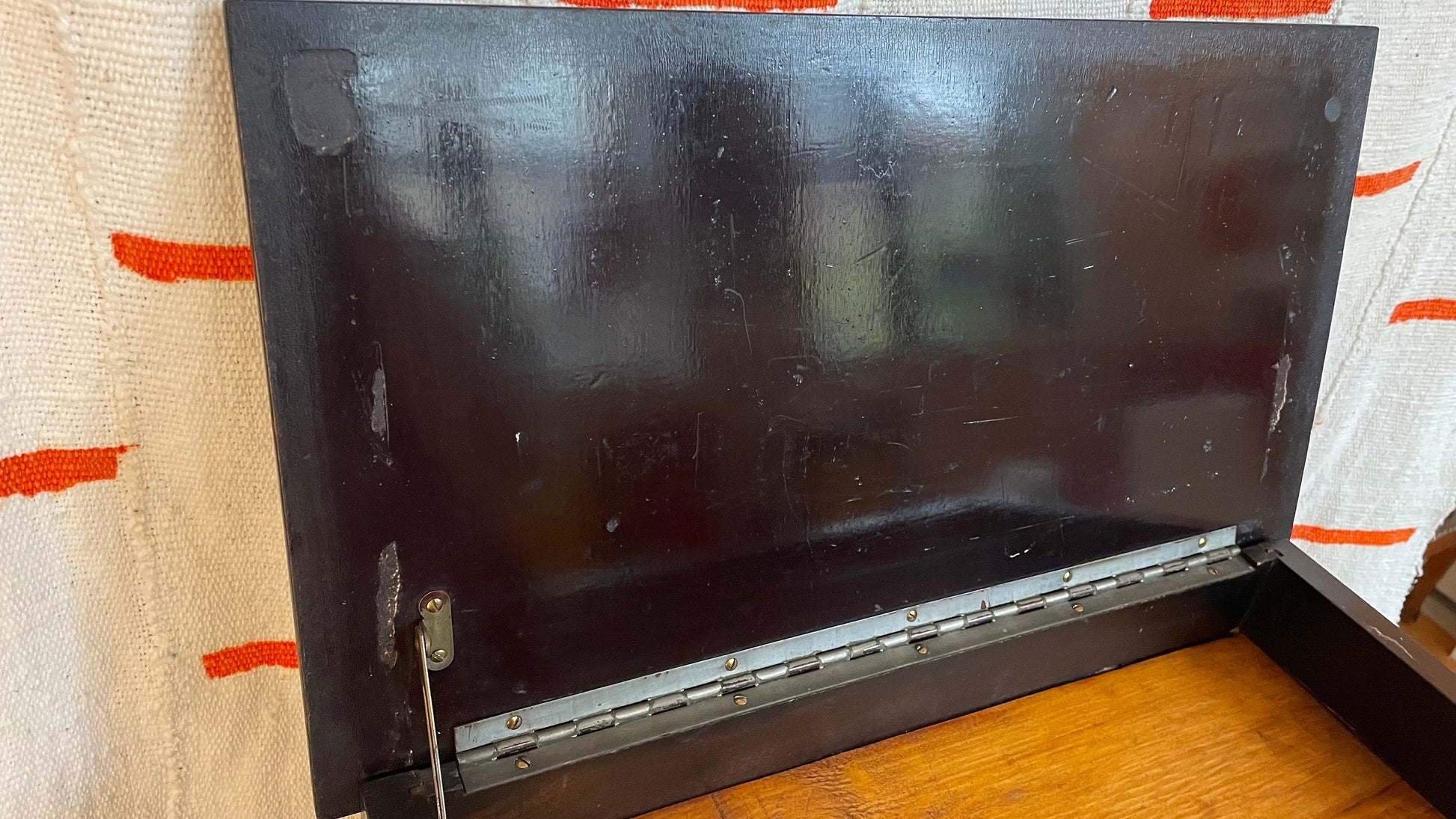 Dark painted wood on the exterior, interior made of VERY antique laundry product storage boxes - see photos! those are unfinished. Two metal pull handles, one is missing the little pulley, easy to replace both the hardware pieces. Exterior front has some scratches and signs of wear, the top of the chest is very faded. Lovely patina.