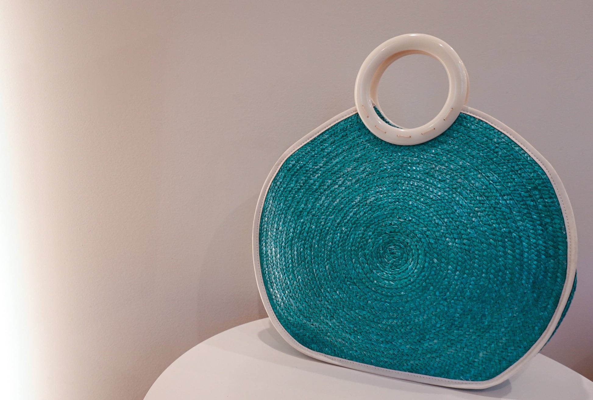 Circle Bag - Vintage Woven Raffia Summer Tote - 1960s Beach Bag - White Leather, Turquoise Raffia, White Acrylic Handle & Tassel