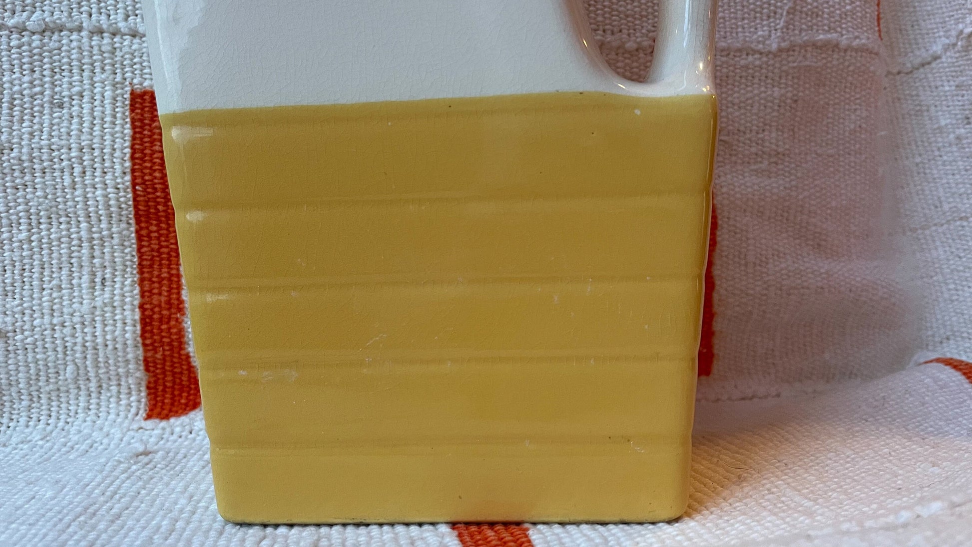 Lovely "disc" pitcher created out of ceramic, painted in a beige/ivory and mustard color, with original cork top. This sculptural beauty is a wonderful addition to your summer kitchen as a pitcher for liquids, or as an unusual pitcher for your wildflowers.