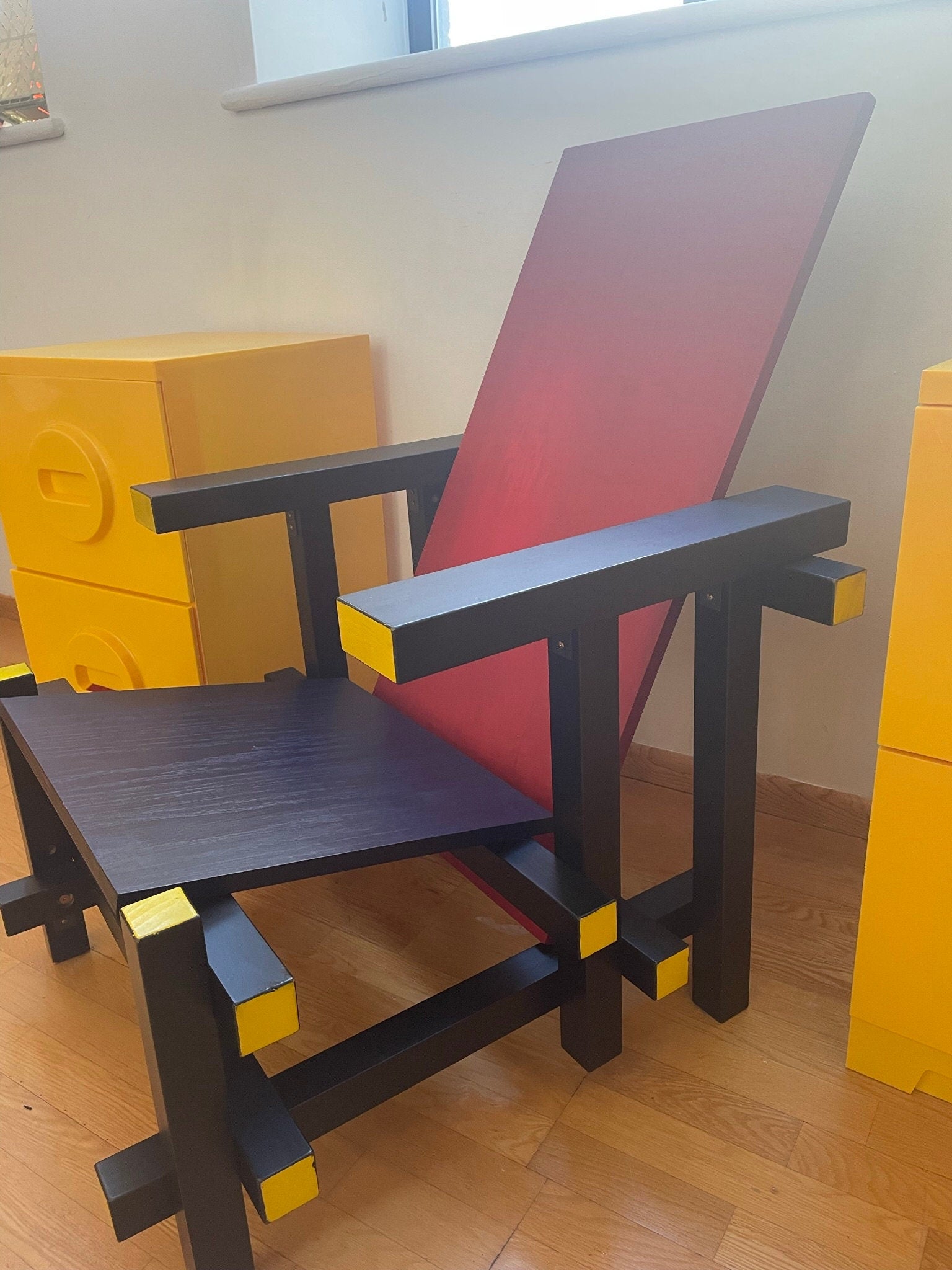 Gorgeous early De Stijl style chair critical to the cubism movement. Angles on this minimalist beauty give us all the vibes. Complex structures and primary colors are incredible. Nice wide arms (beverage can for scale) and a tilted seat, this is surprisingly - extremely - comfortable!
