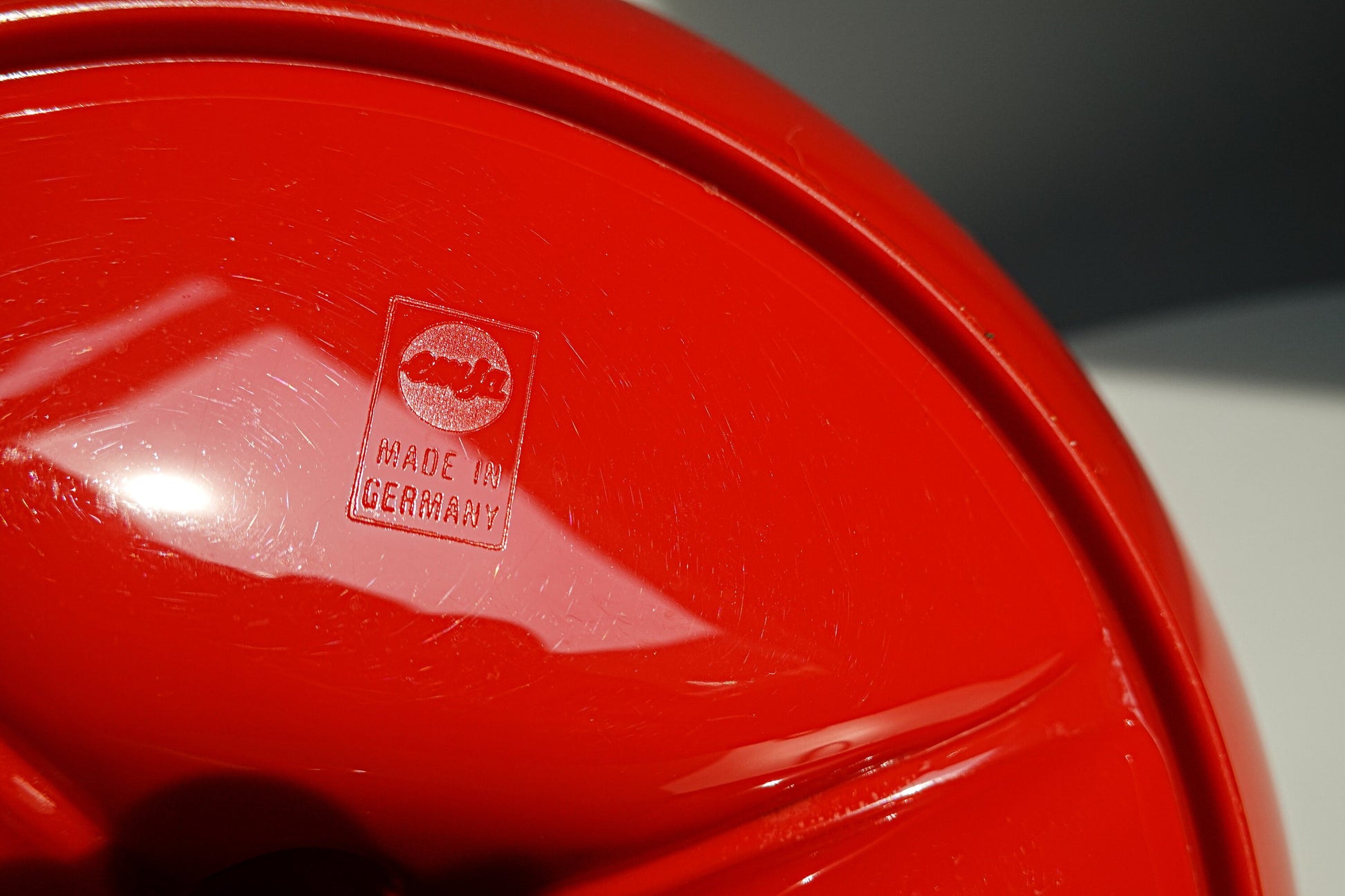 Marvelous "snack tower" immediately reminiscent of the space age made by German firm Emsa in the late 60's-early 70's, manufactured in saturated primary colors out of shiny plastic. This beauty features a large bottom compartment with 3 sections, a central axis that connects four detachable, rotating trays in red, yellow, green and blue, that can be arranged to hold whatever you like. Far from being only a snack tower, this is great for holding knick-knacks, jewelry, keys and more.