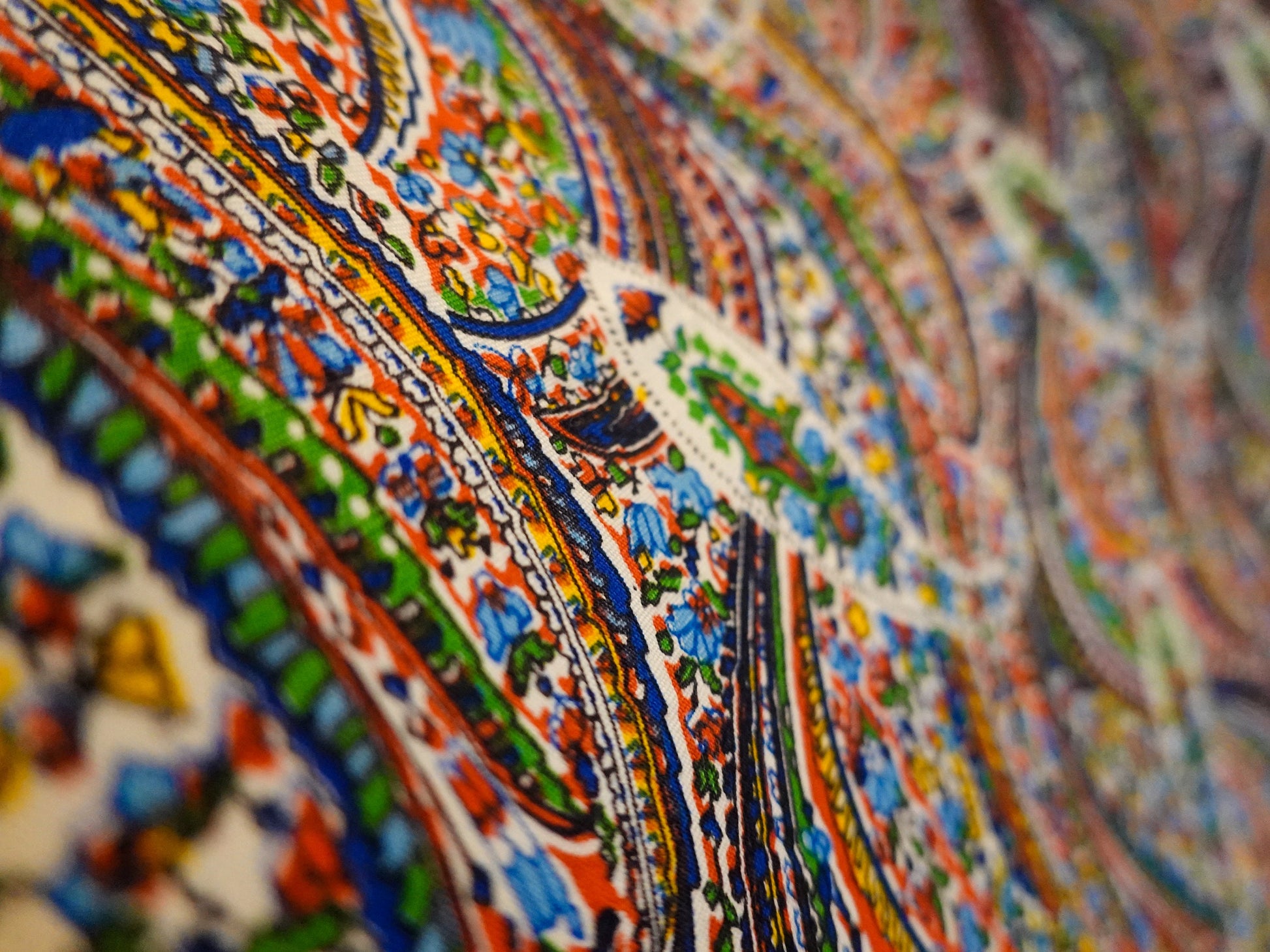 Incredible stretch of fabric here from the 1950's-1970s. Unsure of the fiber type, it's VERY lightweight. A bright paisley in rainbow, saturated colors. Great as a fabric for your next craft, or wonderful as a backdrop, tablecloth, wall hanging -- endless possibilities.