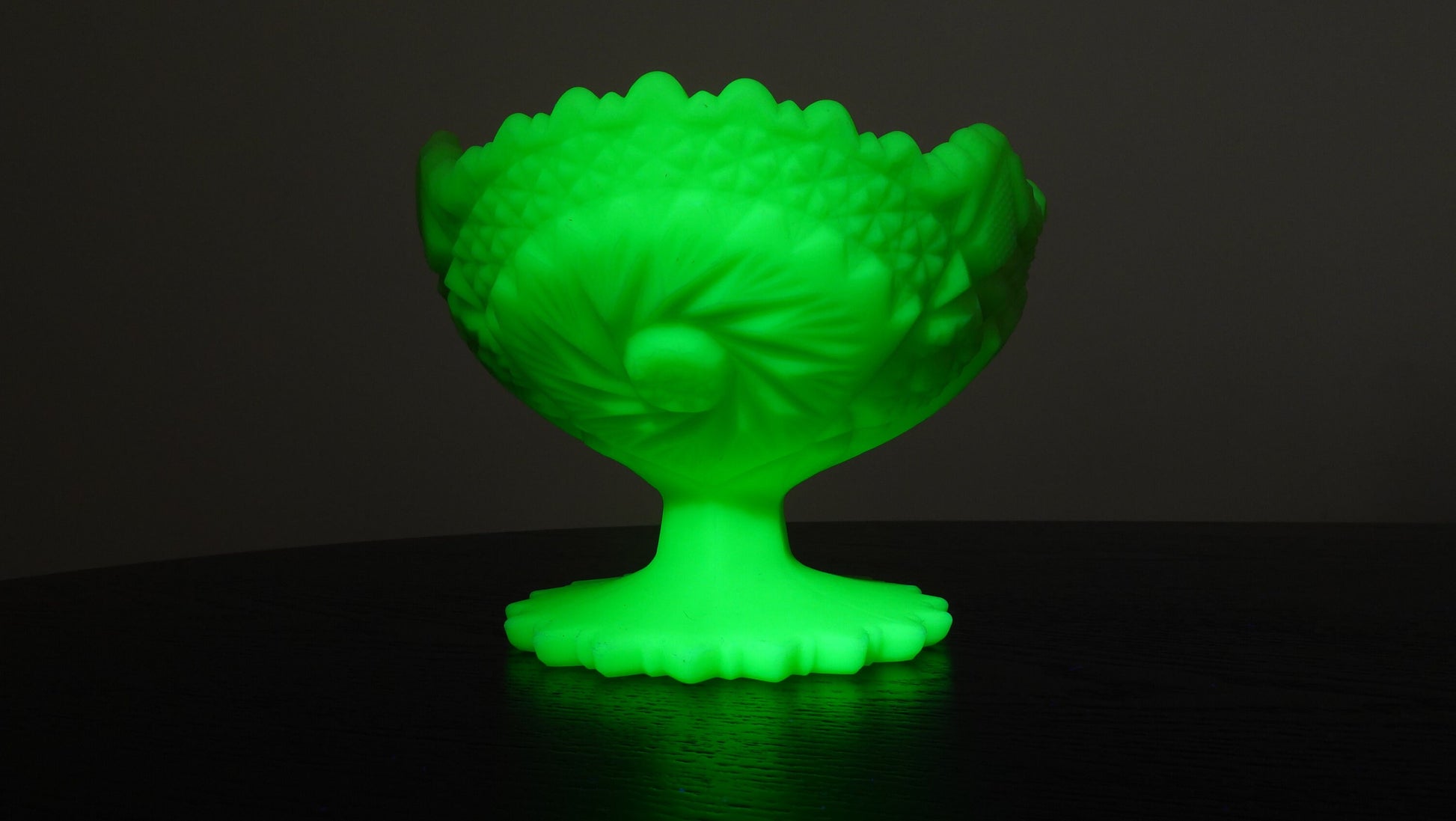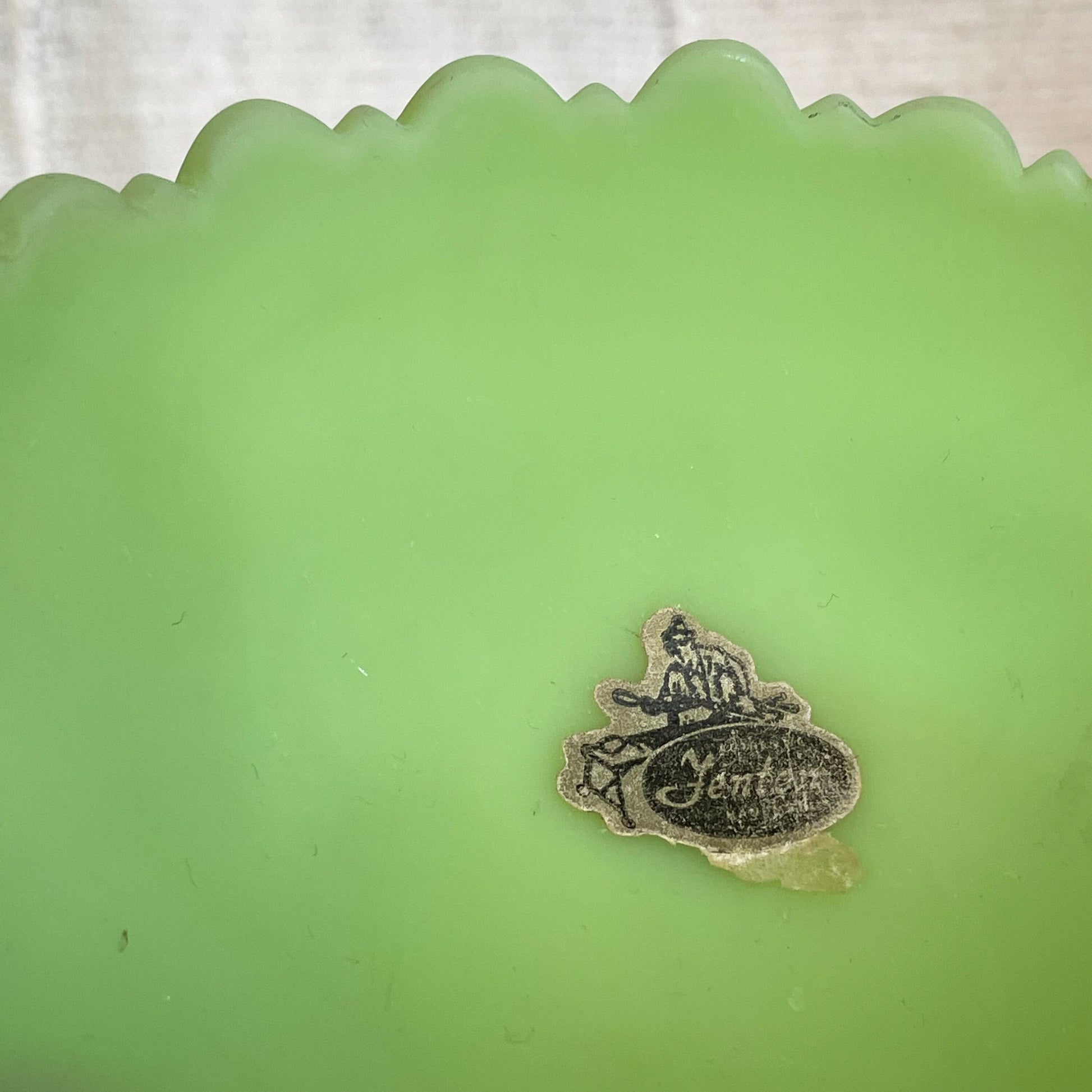 Colored with uranium oxide, and otherwise known as "Vaseline glass" this piece is a lovely addition to any collection. Use it to store jewelry, polaroid photos, small knicknacks, or let it shine on its own.