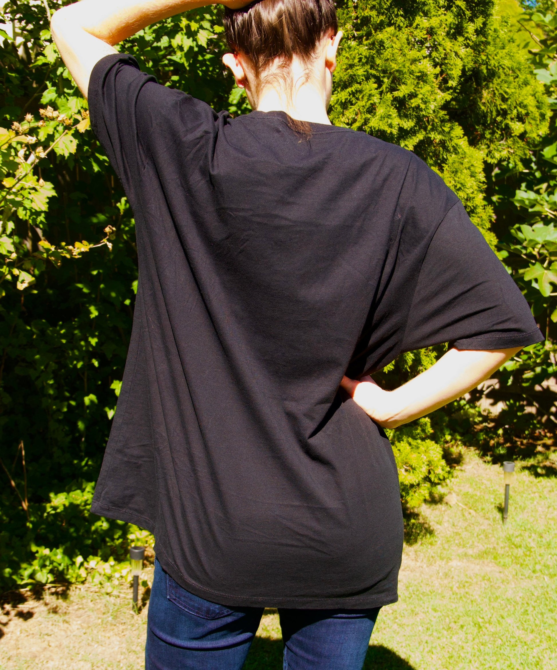 This oversize tee has no tags, but fits like a mens XL. It will fit most bodies! DM me for precise measurements